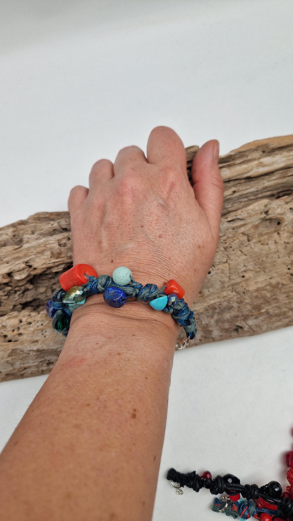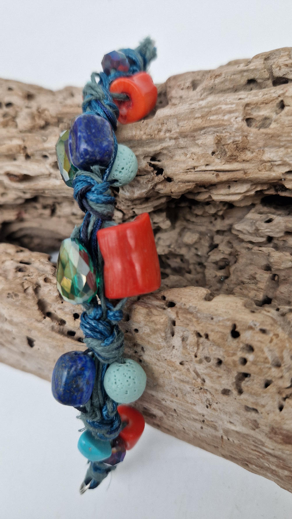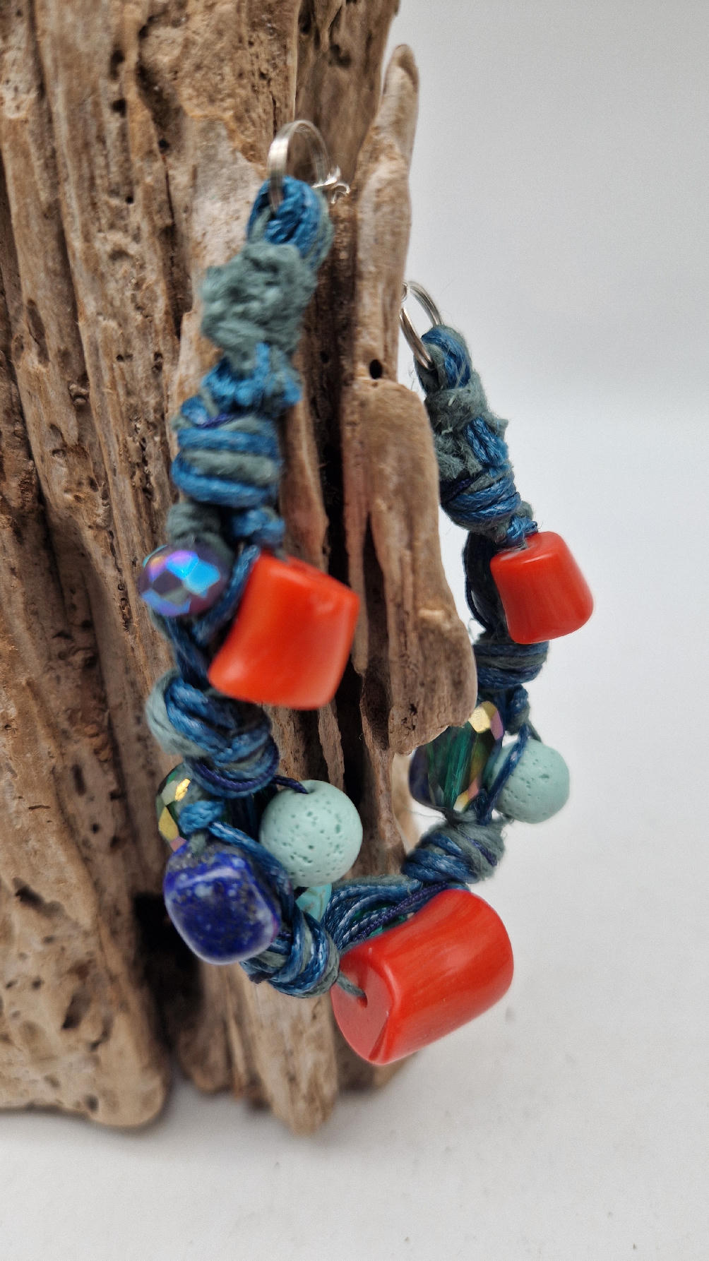 Śliczna bransoletka z turkusów pomarańczowych korali i szklanych koralików w turkusowym kolorze na niebieskim, bawełnianym sznurku.