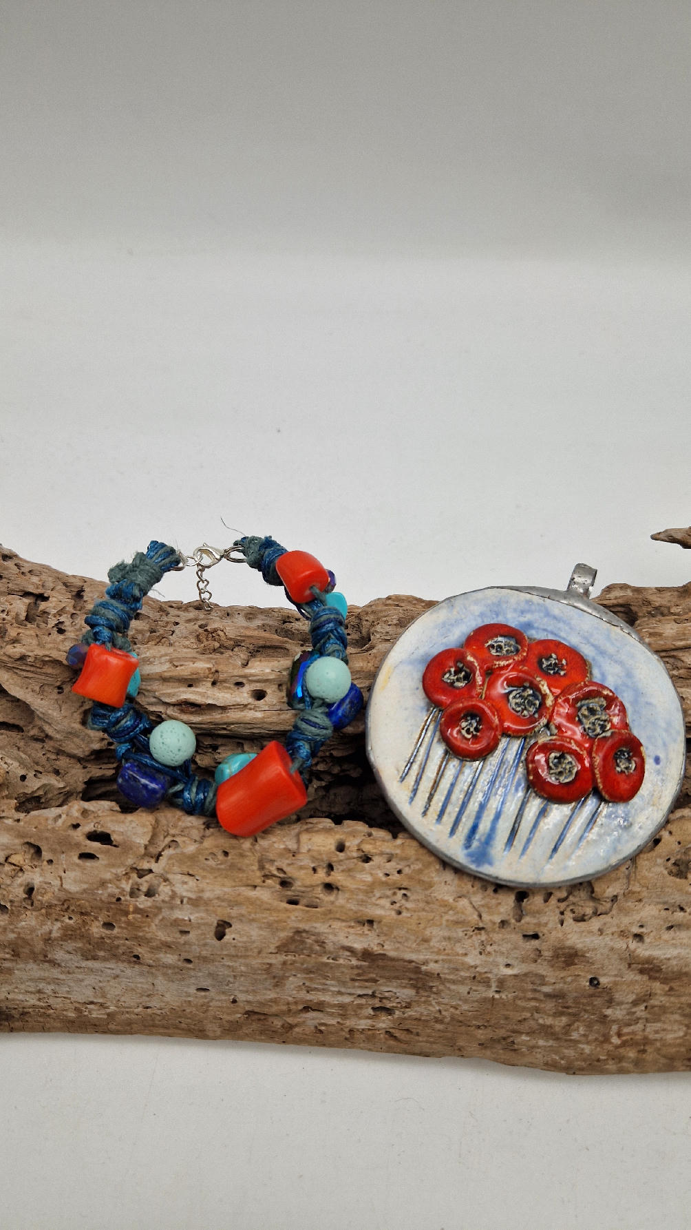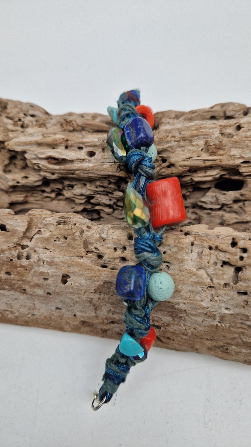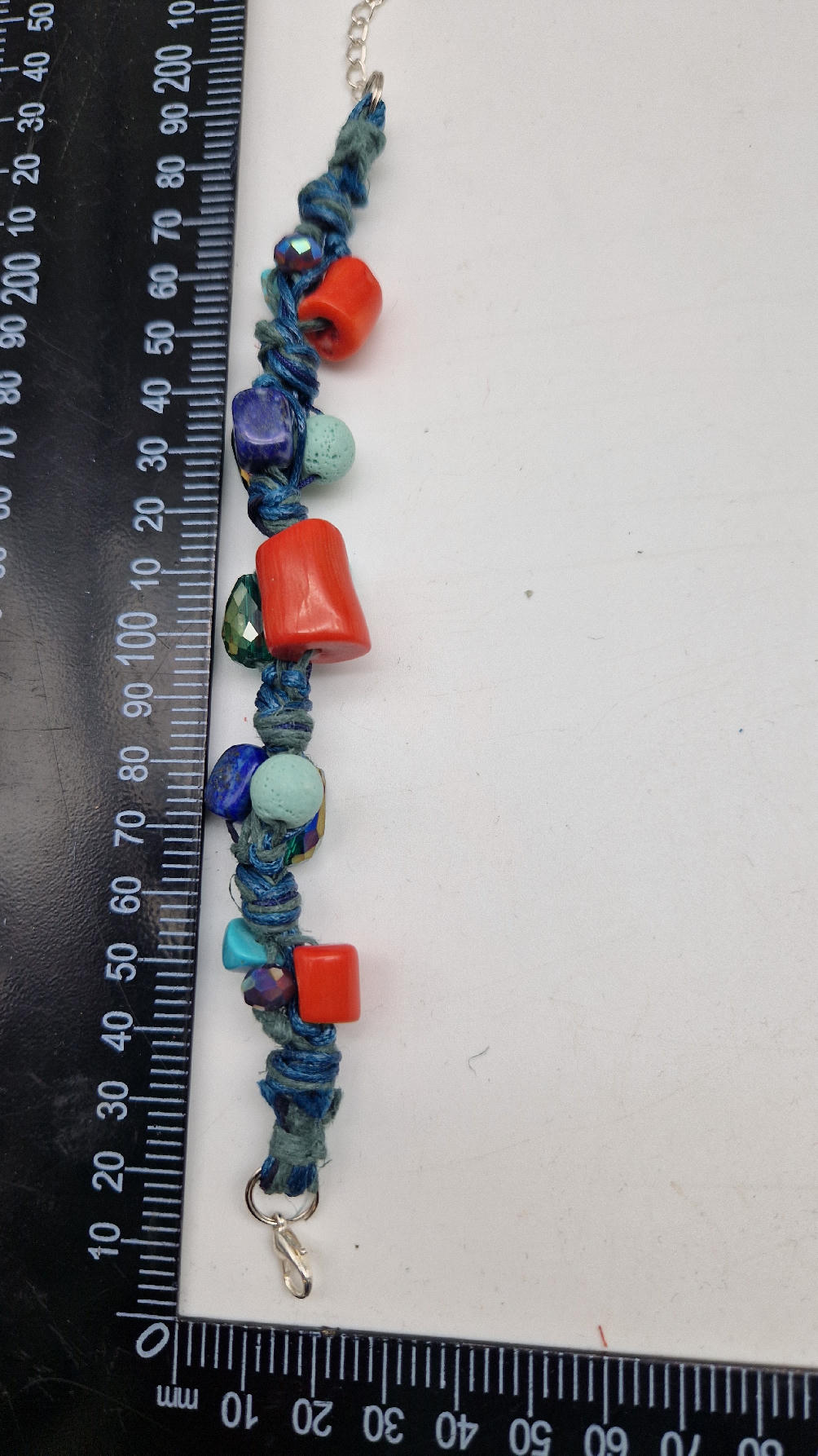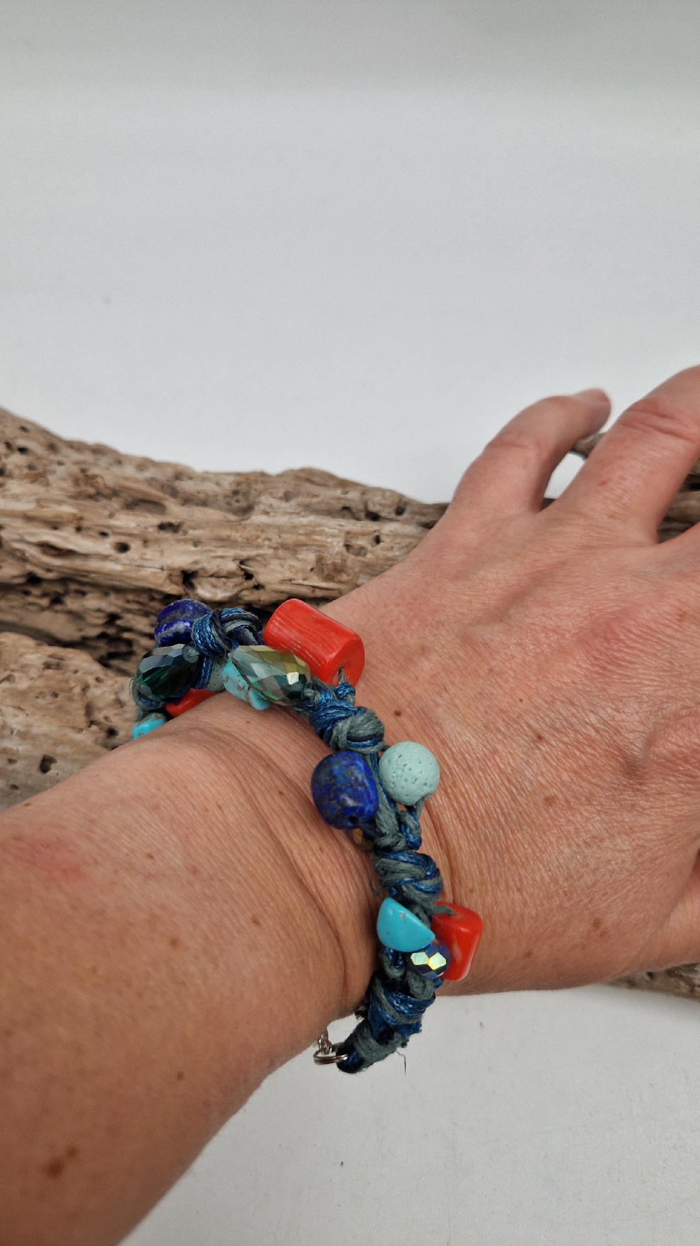 Śliczna bransoletka z turkusów pomarańczowych korali i szklanych koralików w turkusowym kolorze na niebieskim, bawełnianym sznurku.