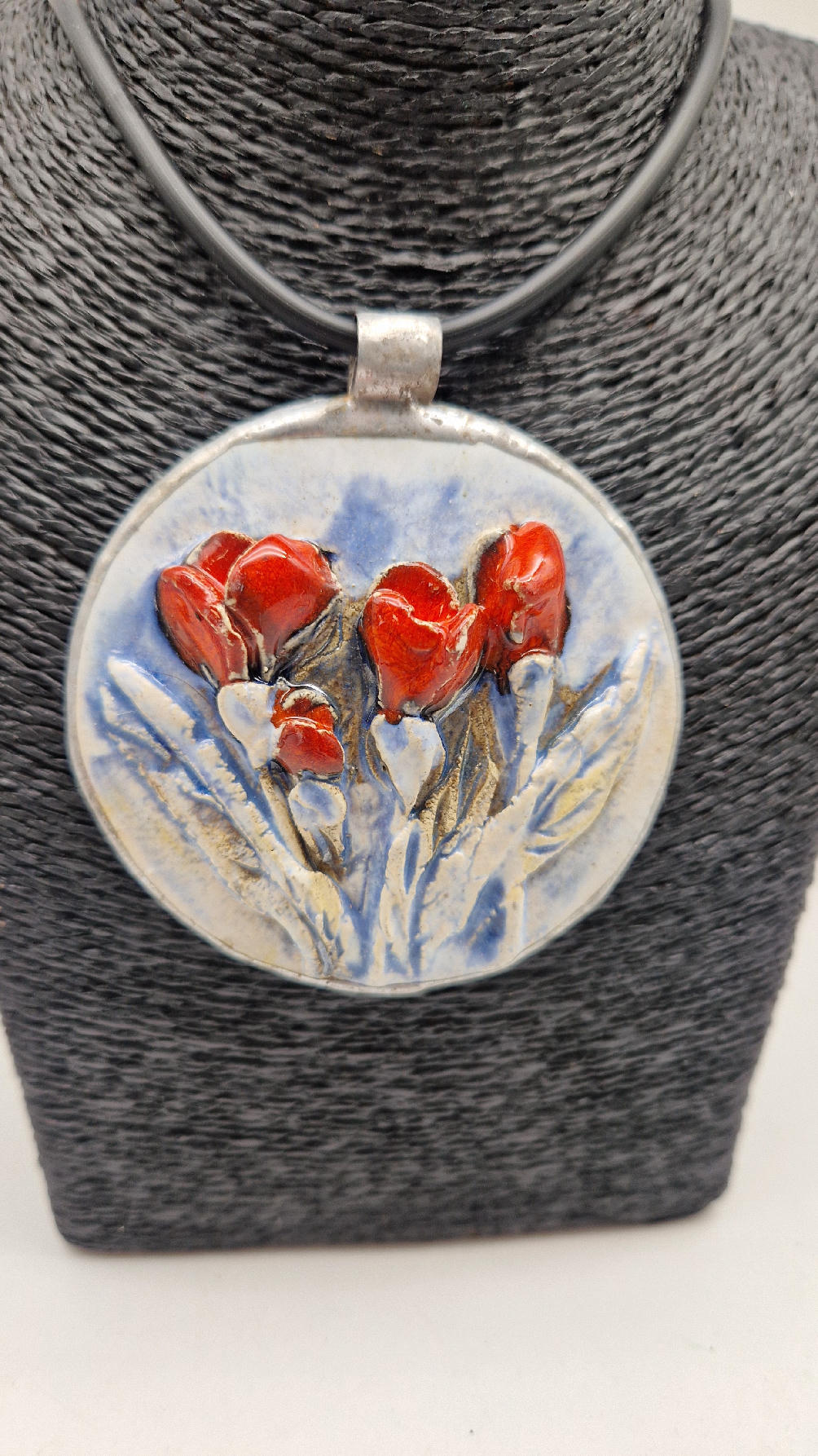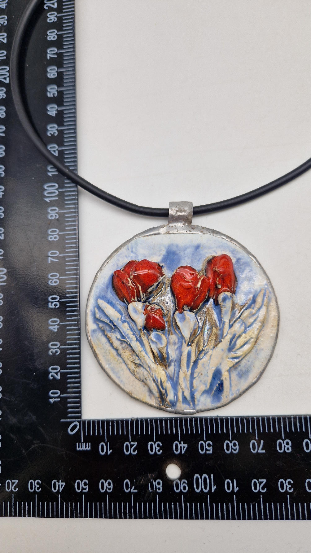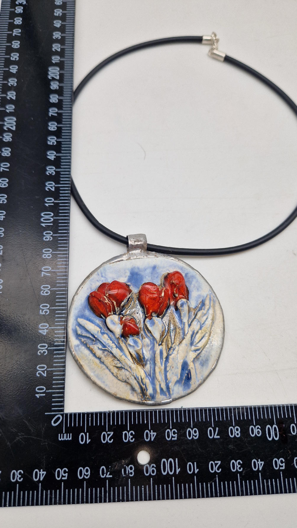 Śliczny ceramiczny, duży wisior zawieszony na kauczukowym rzemieniu. Kwiaty, ale takie niewiędnące i śliczne ,które będą cieszyć oczy niezmiennie przez długi czas..