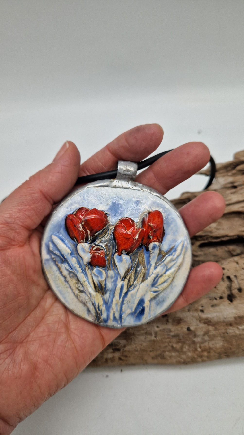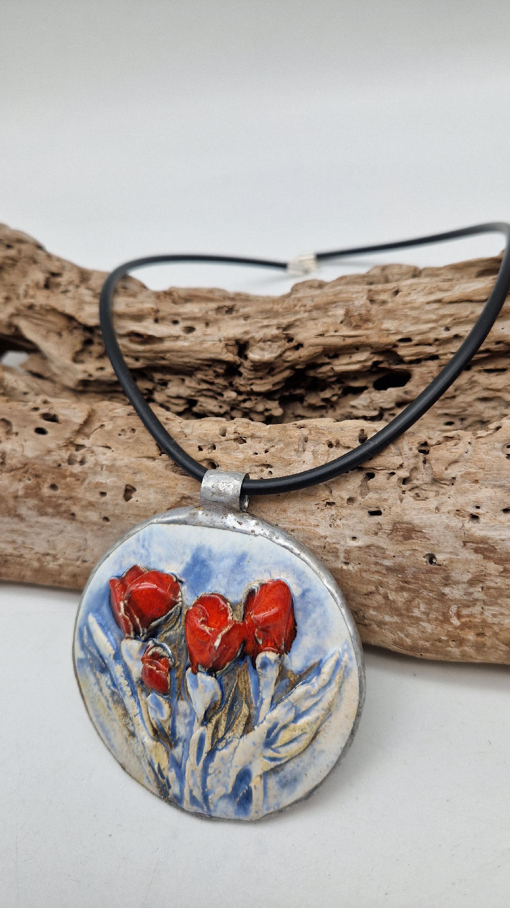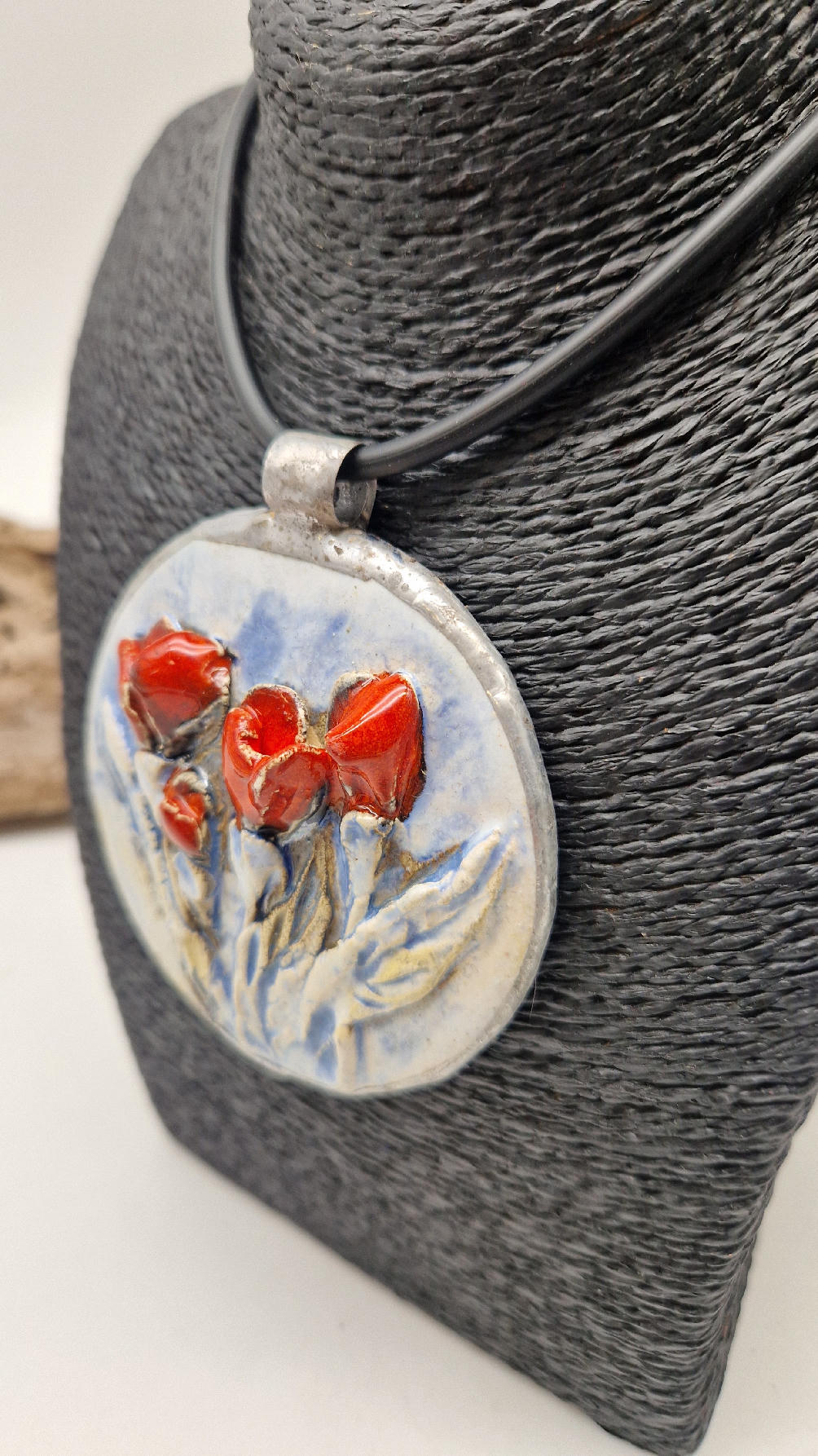 Śliczny ceramiczny, duży wisior zawieszony na kauczukowym rzemieniu. Kwiaty, ale takie niewiędnące i śliczne ,które będą cieszyć oczy niezmiennie przez długi czas..