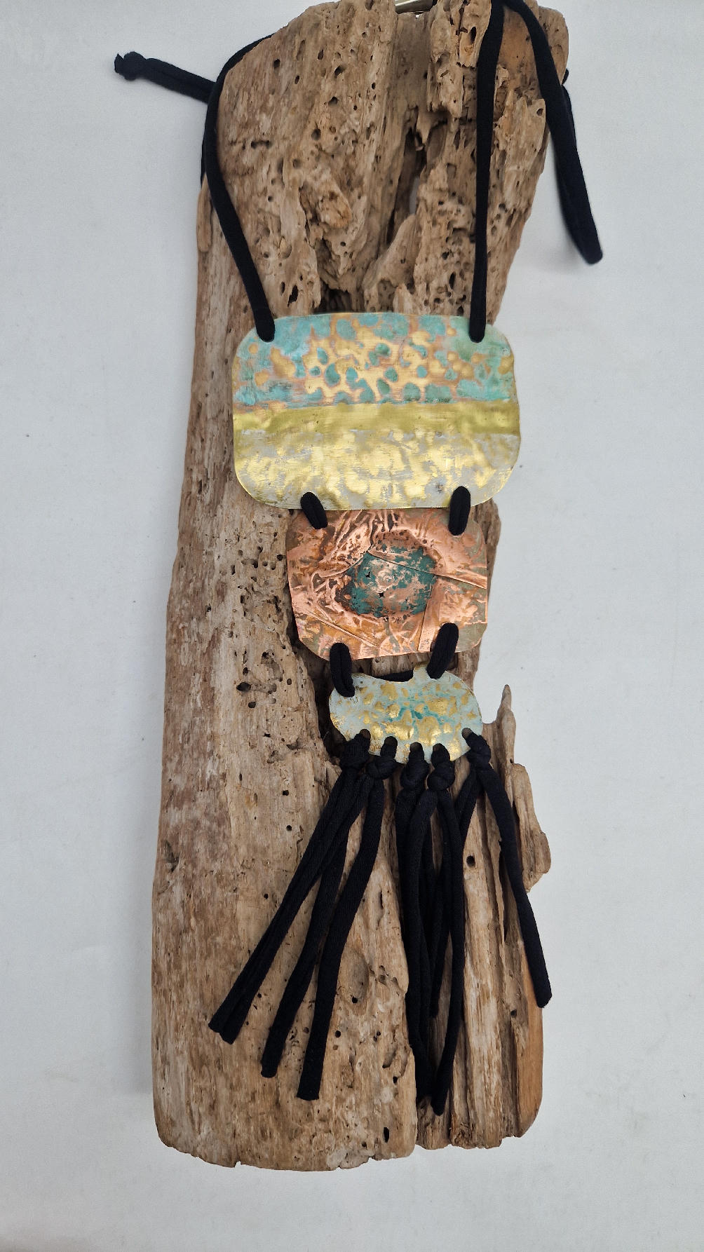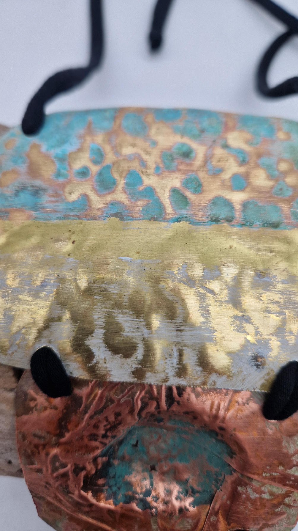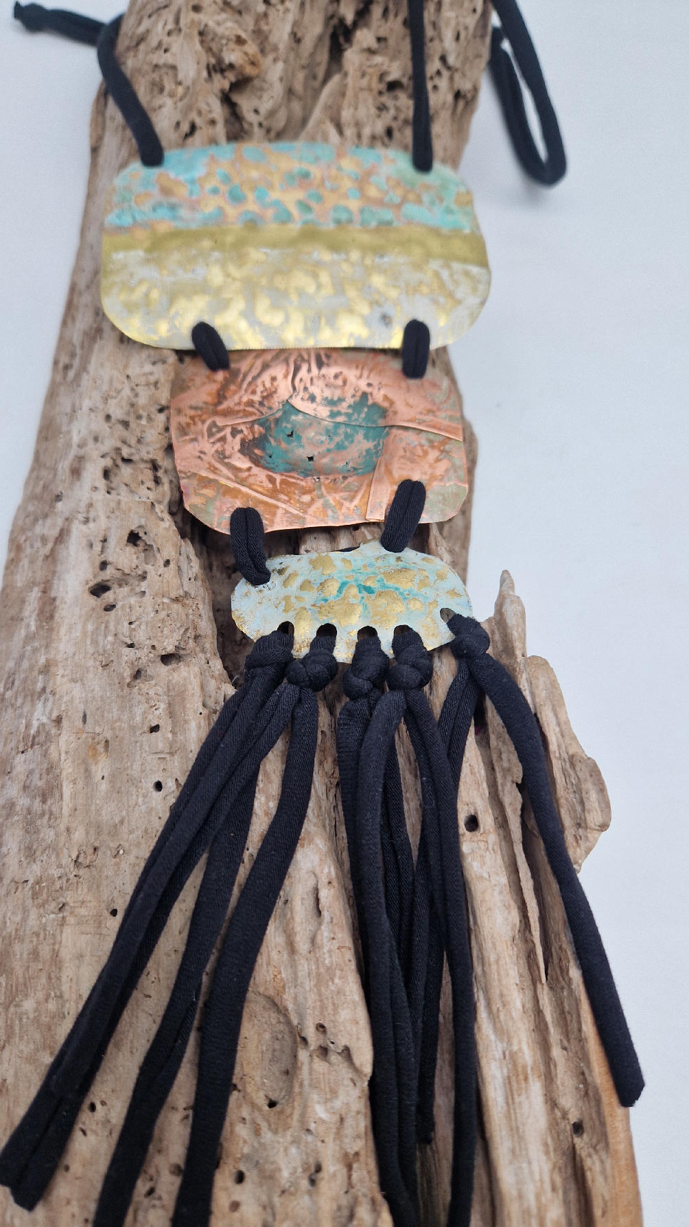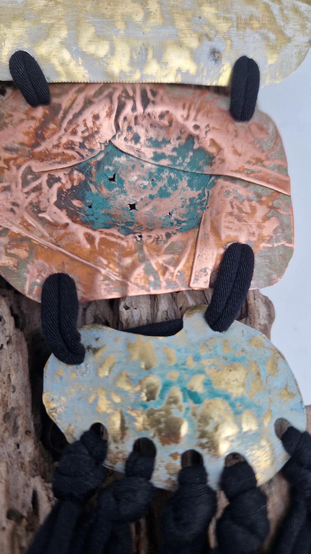 Duży, długi, trzyelementowy, przepiękny, kuty, patynowany, miedziano-mosiężny wisior, z długimi, bawełnianymi wąsami na dole, które świetnie wydłużają sylwetkę górna część jest z mosiądzu, środkowa z miedzi i dolna z mosiądzu…złoto-miedziany, ,,zaszroniony”, ciut zielony… przestrzenny, niepłaski wisior zawieszony na bawełnianej ,,obroży,, której długość możesz regulować, przy pomocy fajowej tutki…przepiękny!