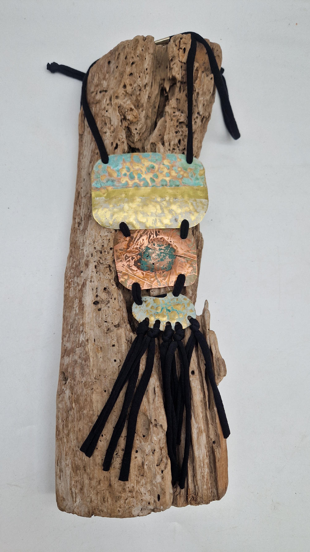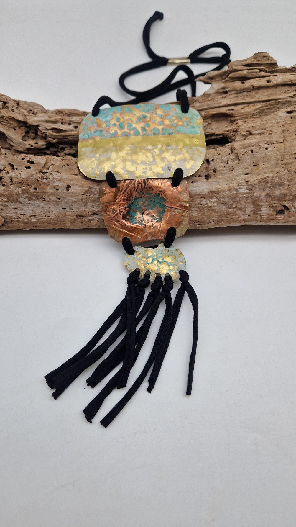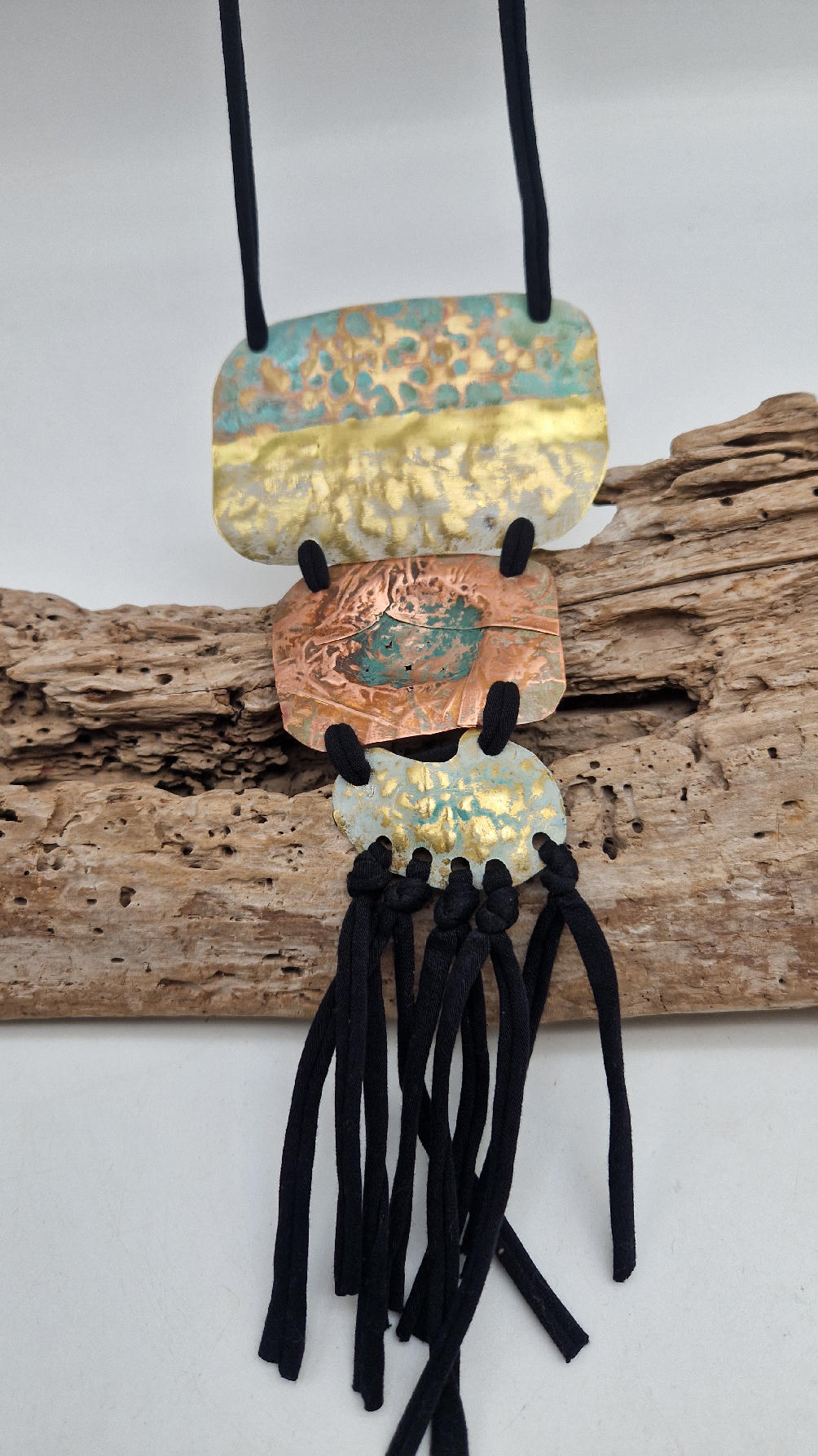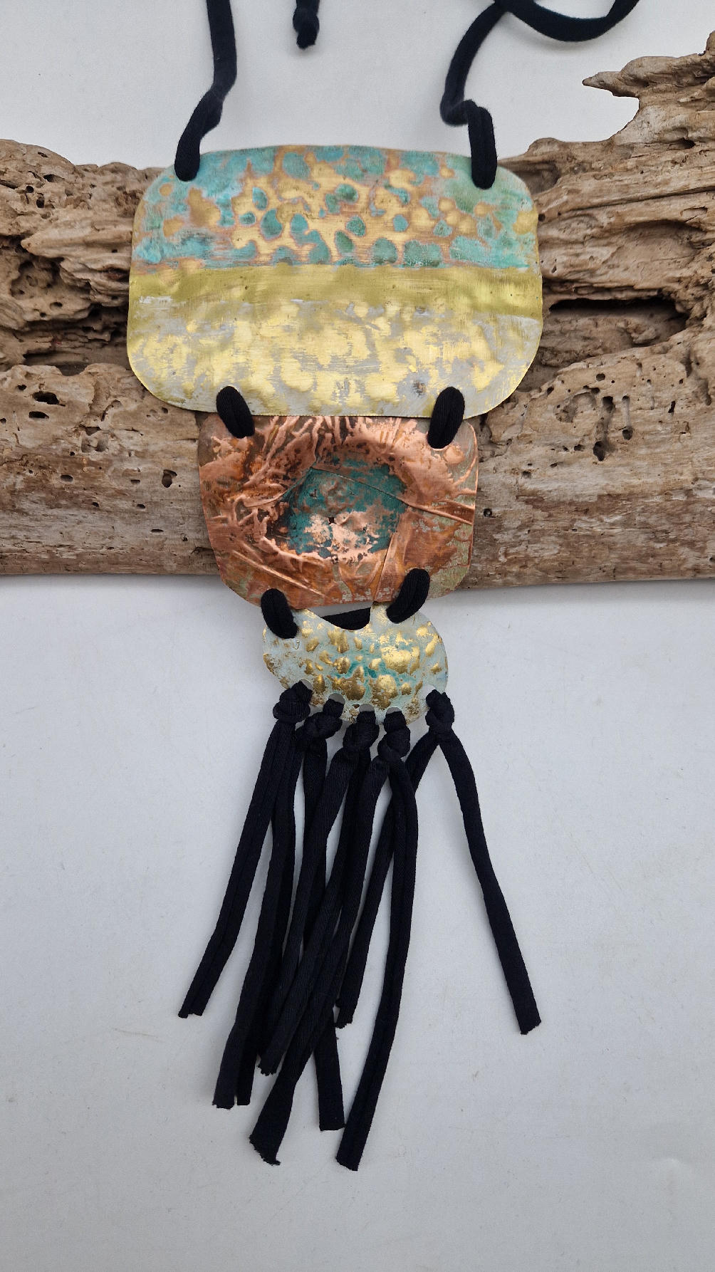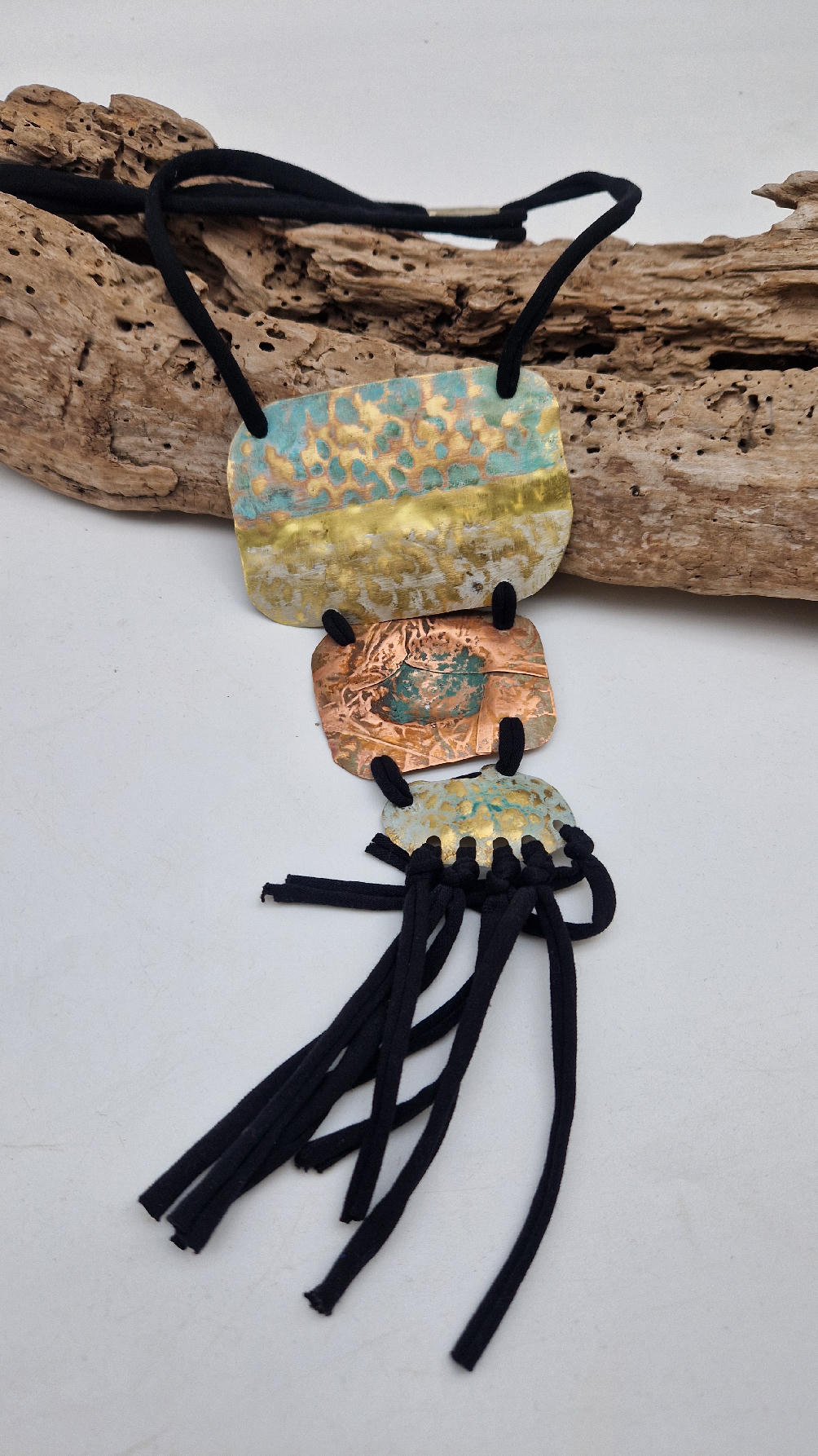 Duży, długi, trzyelementowy, przepiękny, kuty, patynowany, miedziano-mosiężny wisior, z długimi, bawełnianymi wąsami na dole, które świetnie wydłużają sylwetkę górna część jest z mosiądzu, środkowa z miedzi i dolna z mosiądzu…złoto-miedziany, ,,zaszroniony”, ciut zielony… przestrzenny, niepłaski wisior zawieszony na bawełnianej ,,obroży,, której długość możesz regulować, przy pomocy fajowej tutki…przepiękny!