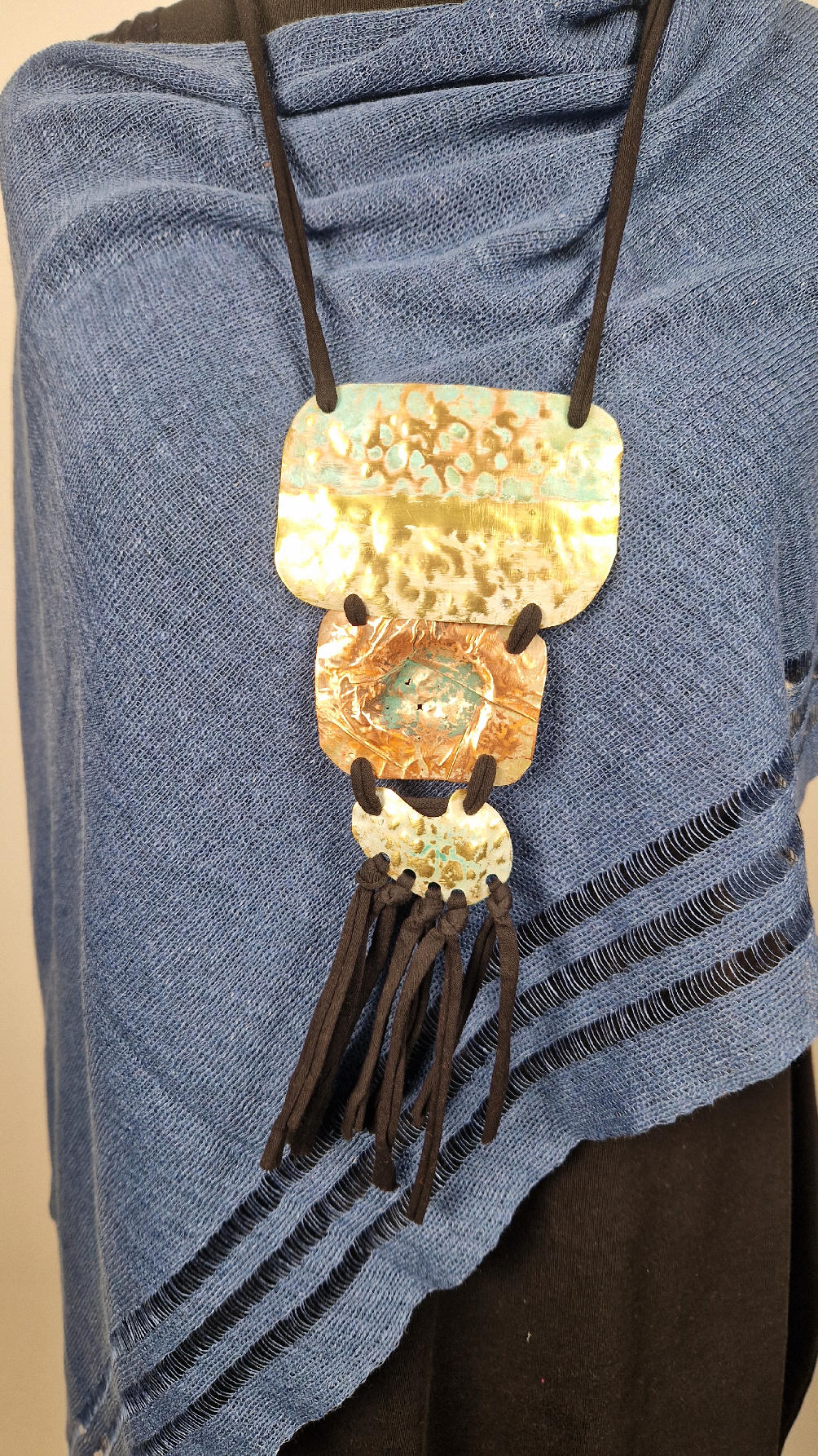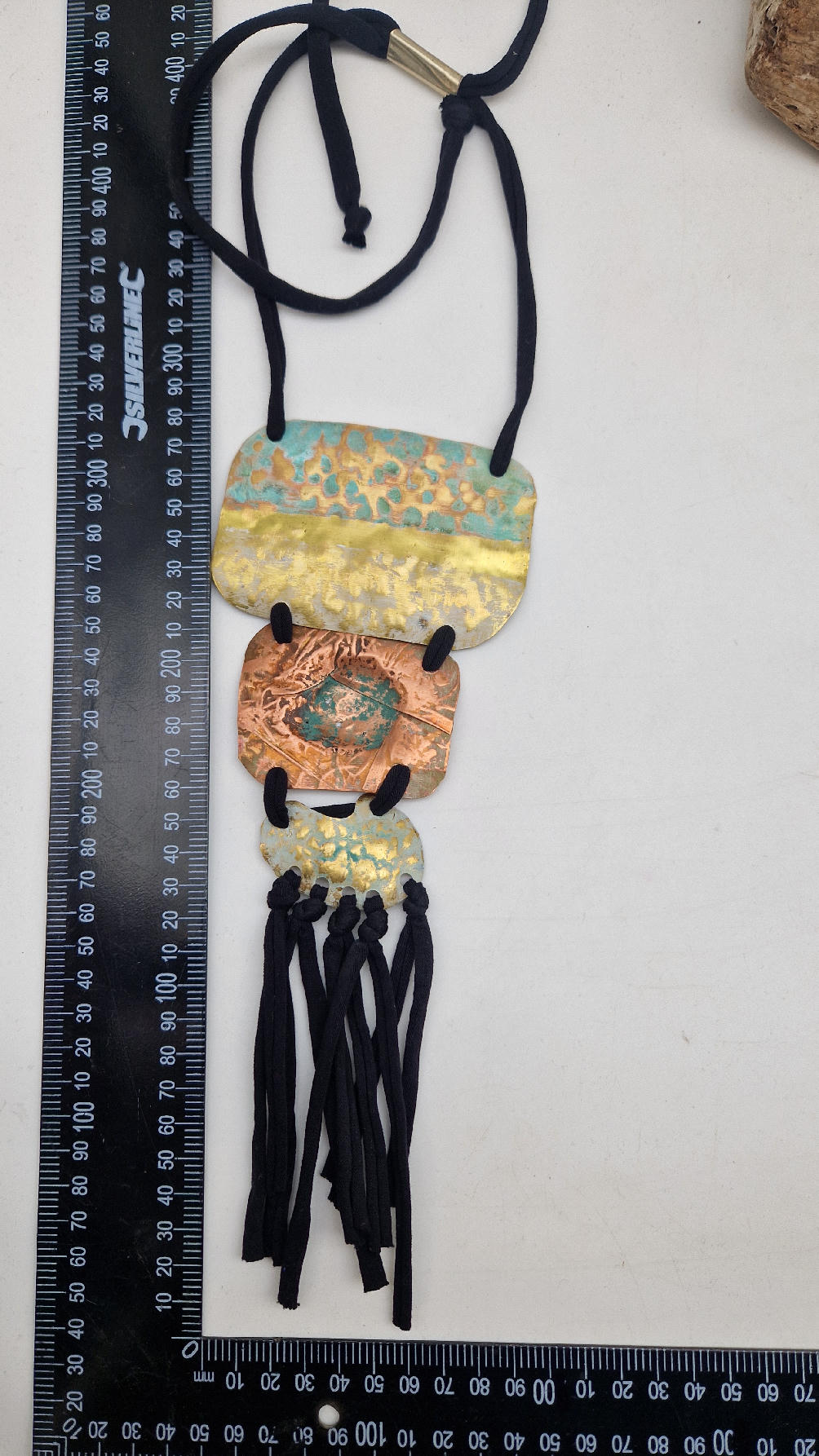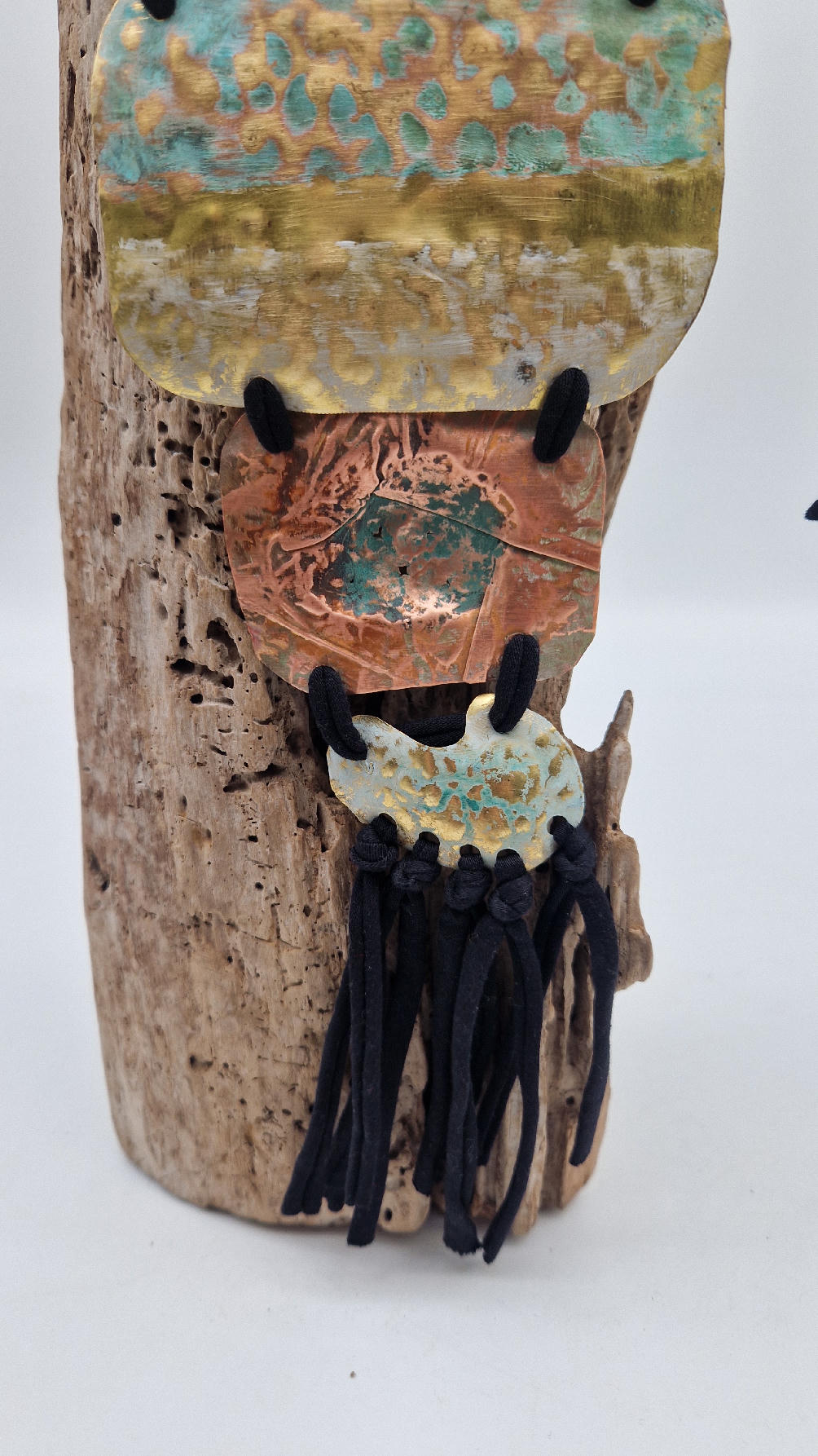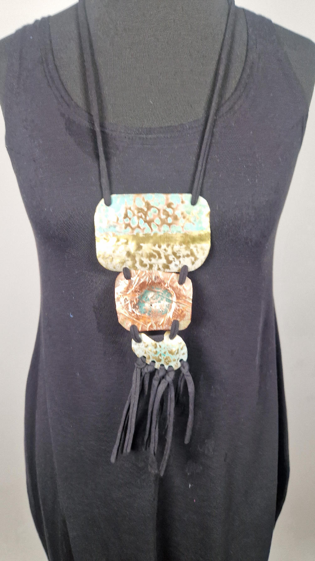 Duży, długi, trzyelementowy, przepiękny, kuty, patynowany, miedziano-mosiężny wisior, z długimi, bawełnianymi wąsami na dole, które świetnie wydłużają sylwetkę górna część jest z mosiądzu, środkowa z miedzi i dolna z mosiądzu…złoto-miedziany, ,,zaszroniony”, ciut zielony… przestrzenny, niepłaski wisior zawieszony na bawełnianej ,,obroży,, której długość możesz regulować, przy pomocy fajowej tutki…przepiękny!