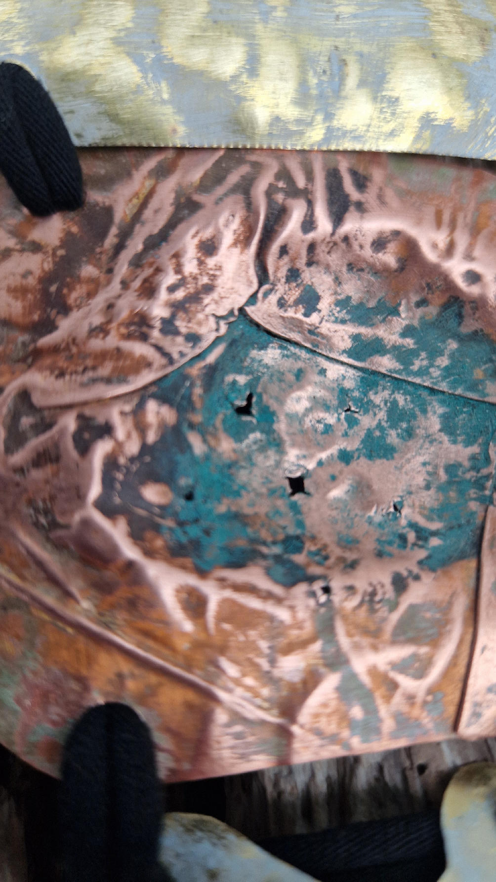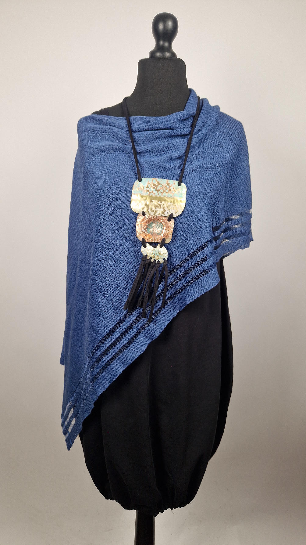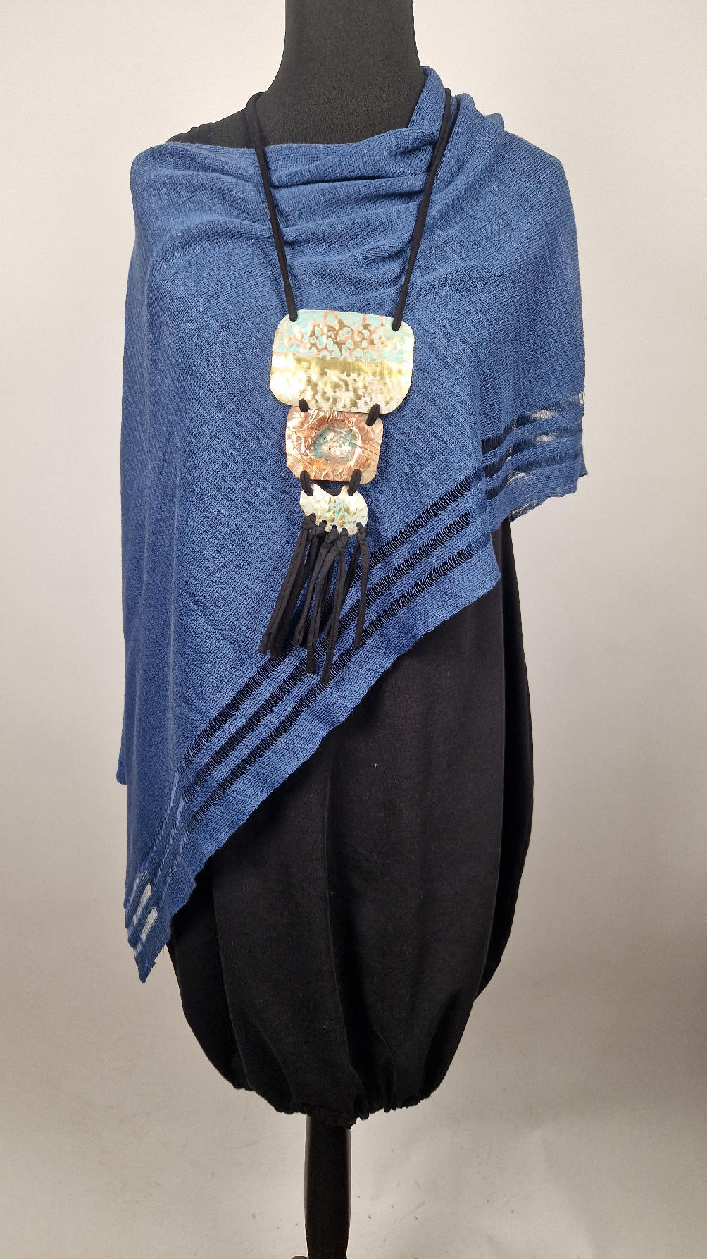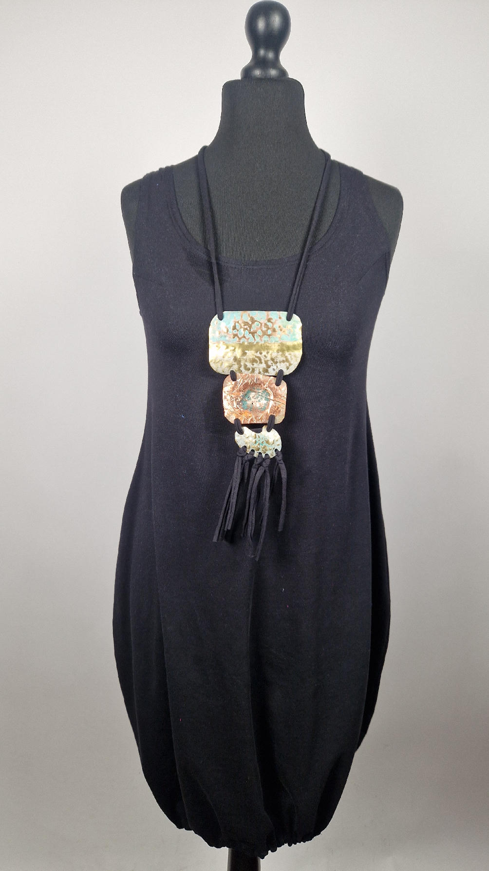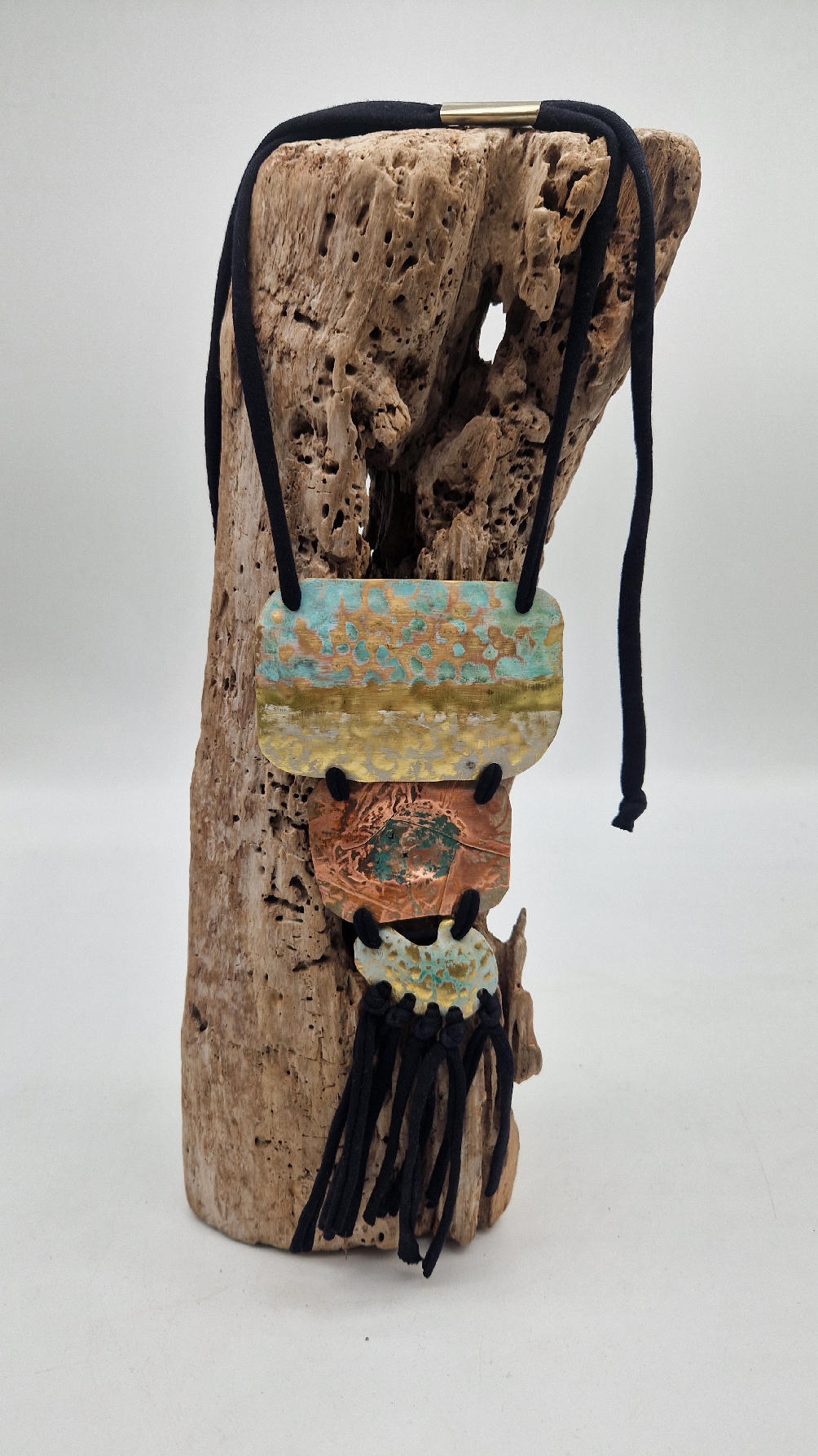 Duży, długi, trzyelementowy, przepiękny, kuty, patynowany, miedziano-mosiężny wisior, z długimi, bawełnianymi wąsami na dole, które świetnie wydłużają sylwetkę górna część jest z mosiądzu, środkowa z miedzi i dolna z mosiądzu…złoto-miedziany, ,,zaszroniony”, ciut zielony… przestrzenny, niepłaski wisior zawieszony na bawełnianej ,,obroży,, której długość możesz regulować, przy pomocy fajowej tutki…przepiękny!