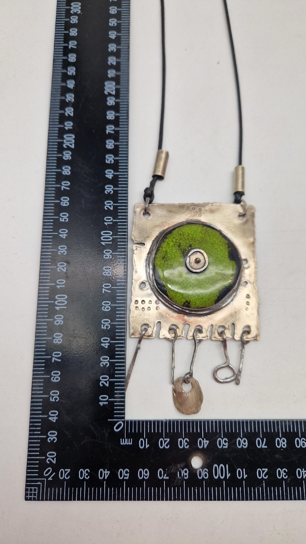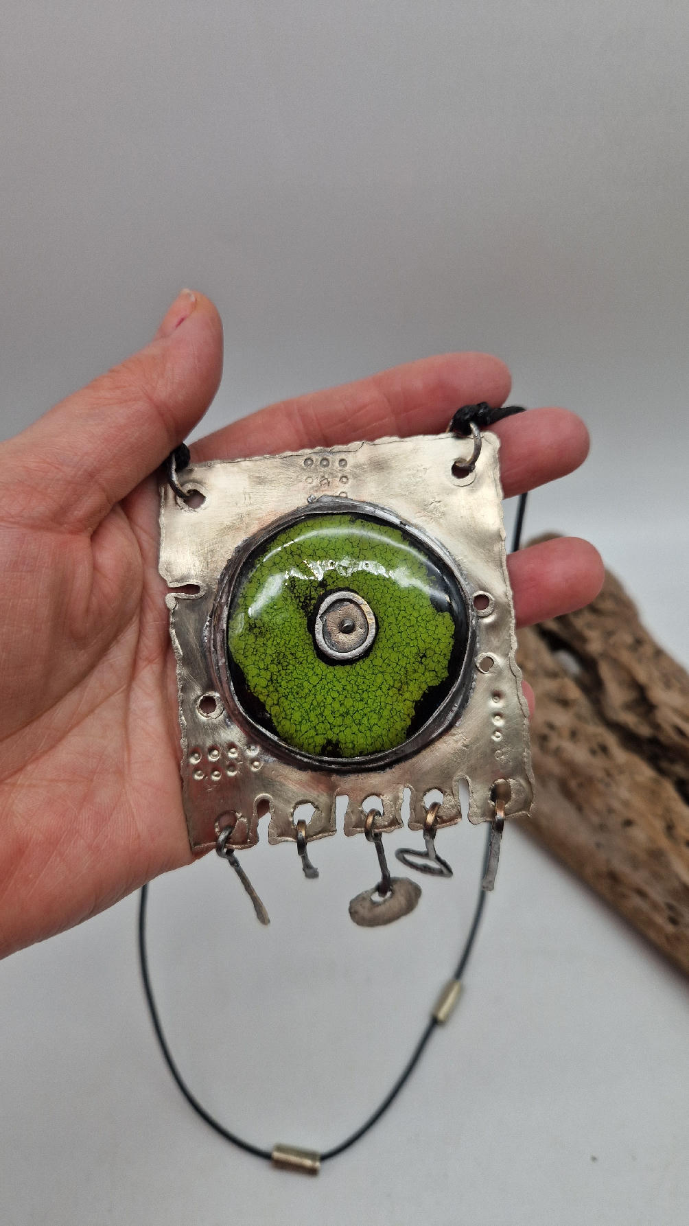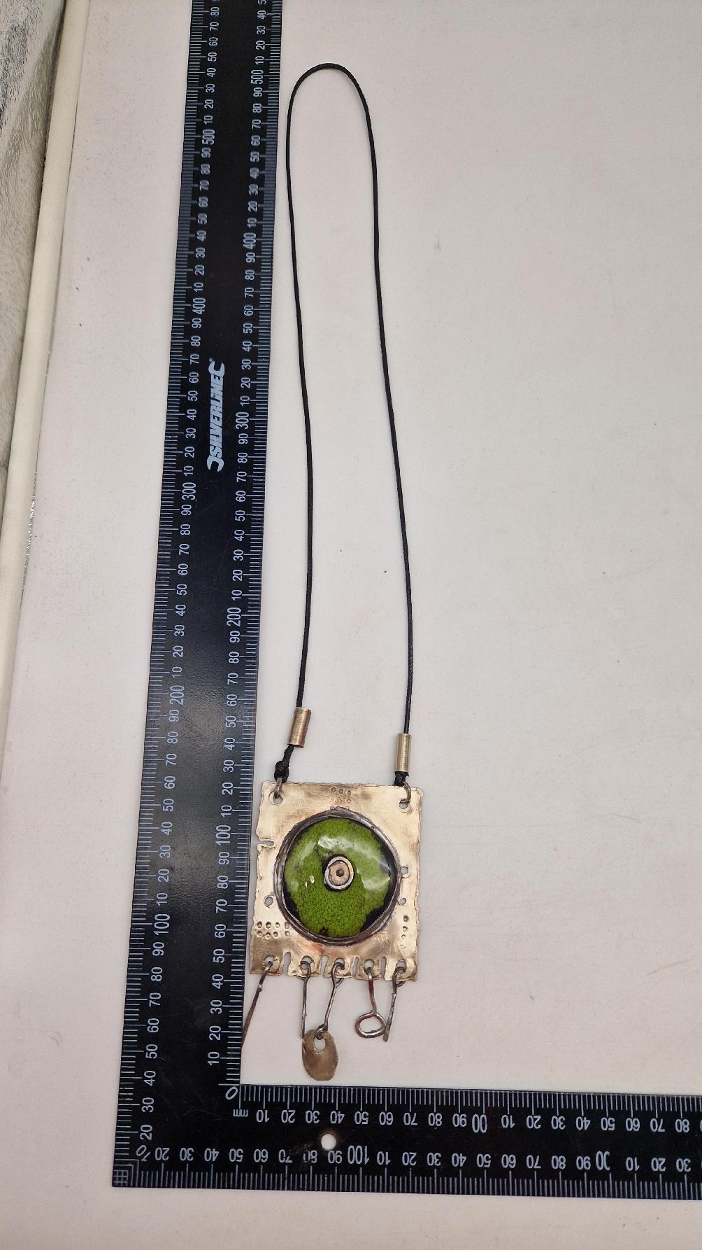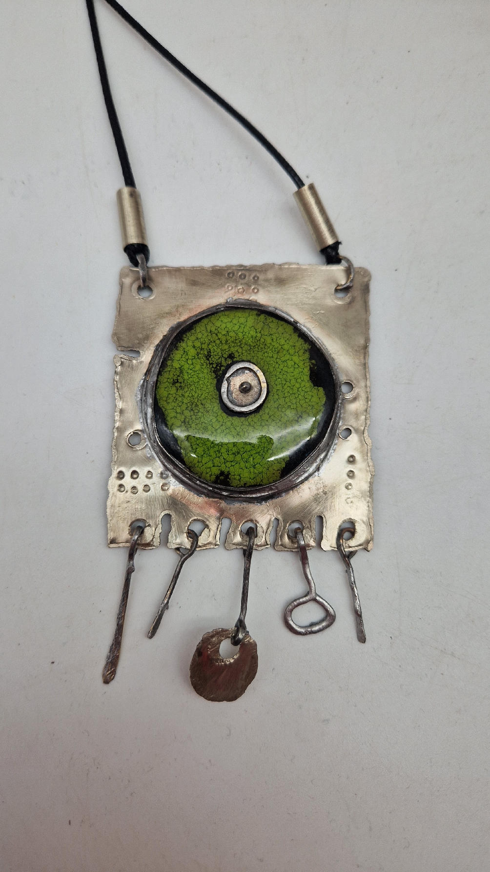 Obłędny , duży wisior , którego sercem jest duża soczyście zielona ręcznie robiona ceramika w głębokim kolorze oprawiona w alpakę, która jest lekko zabarwiona i patynowana, wygląda jak stare złoto… Wisior zawieszony jest na długim rzemieniu…na dole tańczące wykonane z metalu dodatkowe zawieszki, sprawiają że wisior porusza się i gra przy każdym kroku..