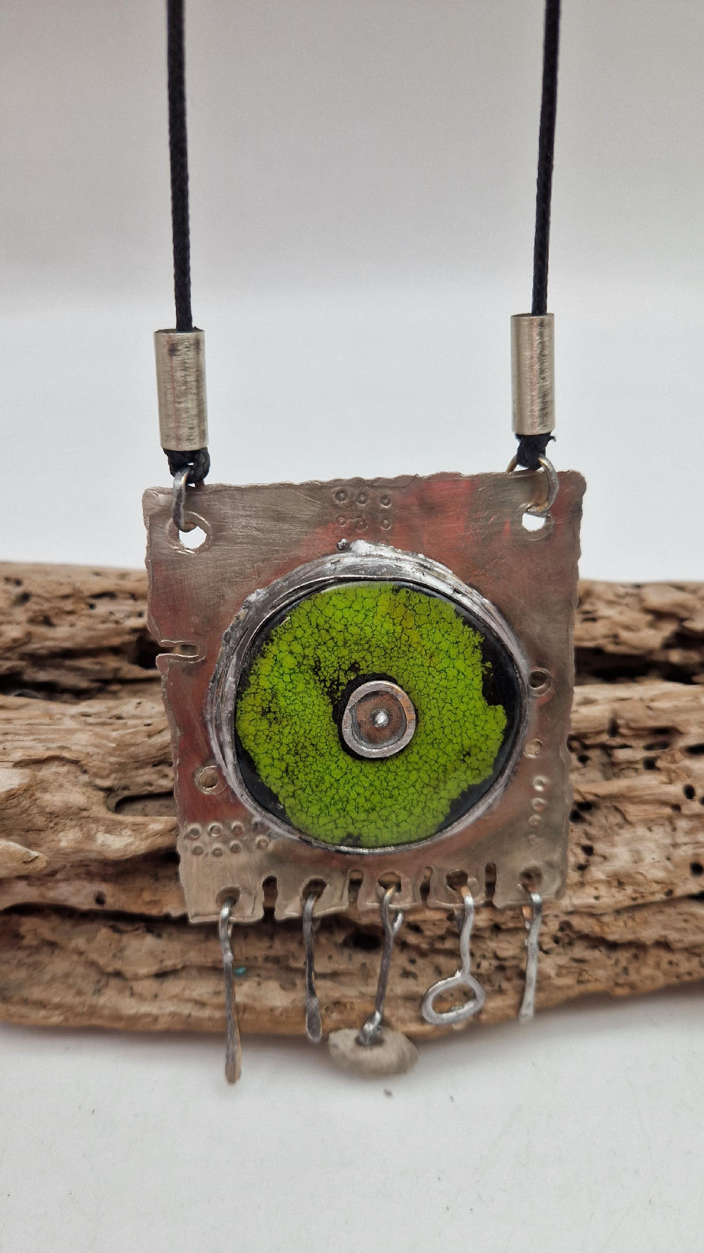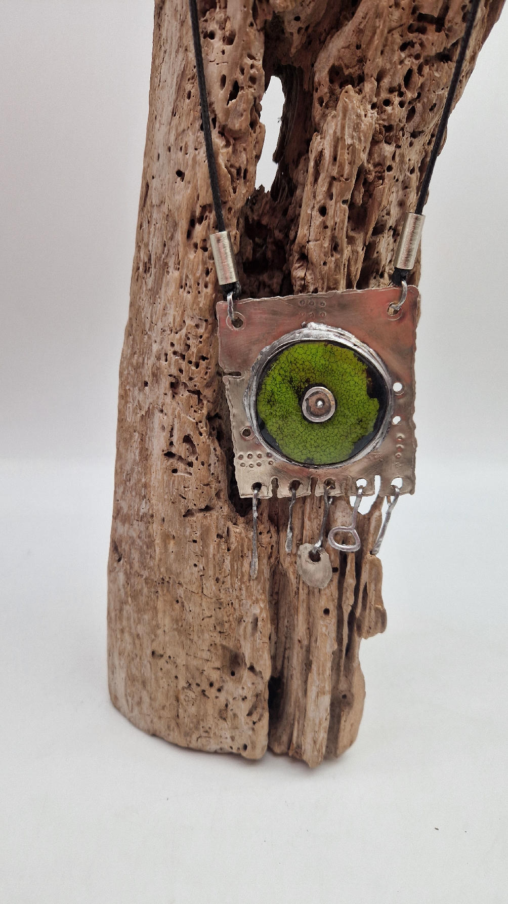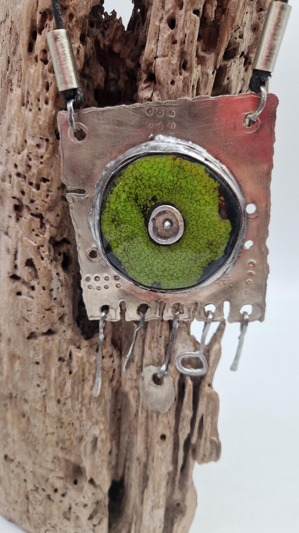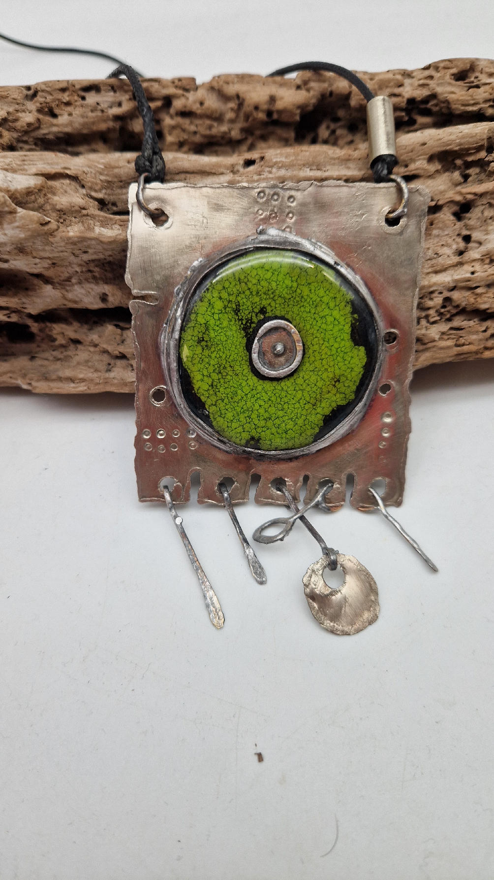 Obłędny , duży wisior , którego sercem jest duża soczyście zielona ręcznie robiona ceramika w głębokim kolorze oprawiona w alpakę, która jest lekko zabarwiona i patynowana, wygląda jak stare złoto… Wisior zawieszony jest na długim rzemieniu…na dole tańczące wykonane z metalu dodatkowe zawieszki, sprawiają że wisior porusza się i gra przy każdym kroku..