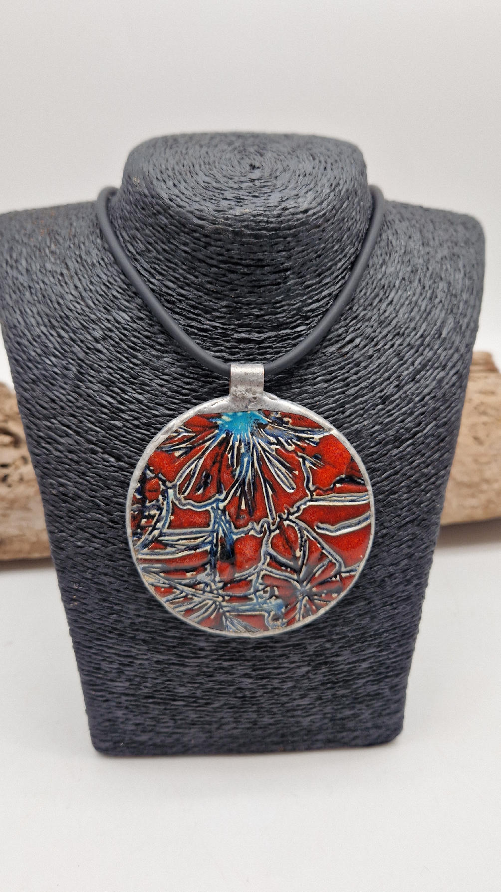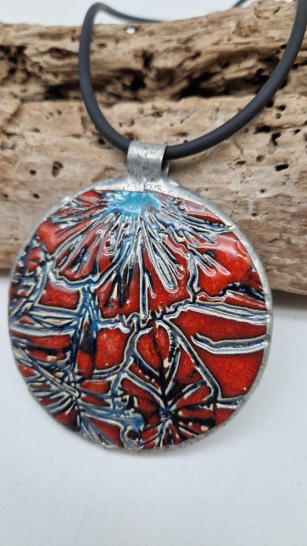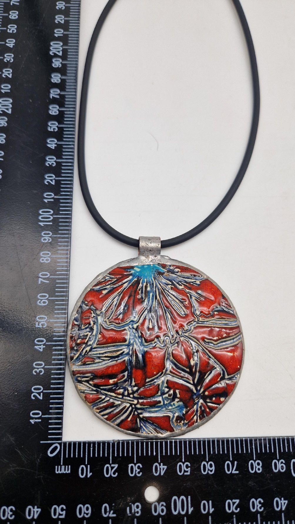 Duży ceramiczny wisior z ręcznie zrobioną ceramiką, intensywna czerwień, z odrobiną błękitu…trawy i kwiaty…otoczone lekką, ramką…pięknie to wygląda …