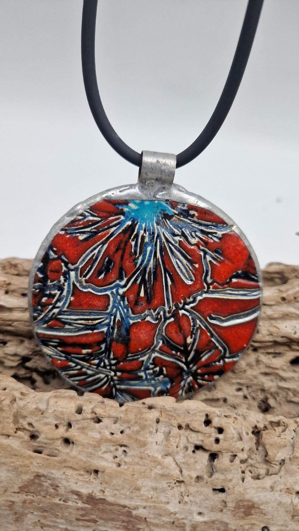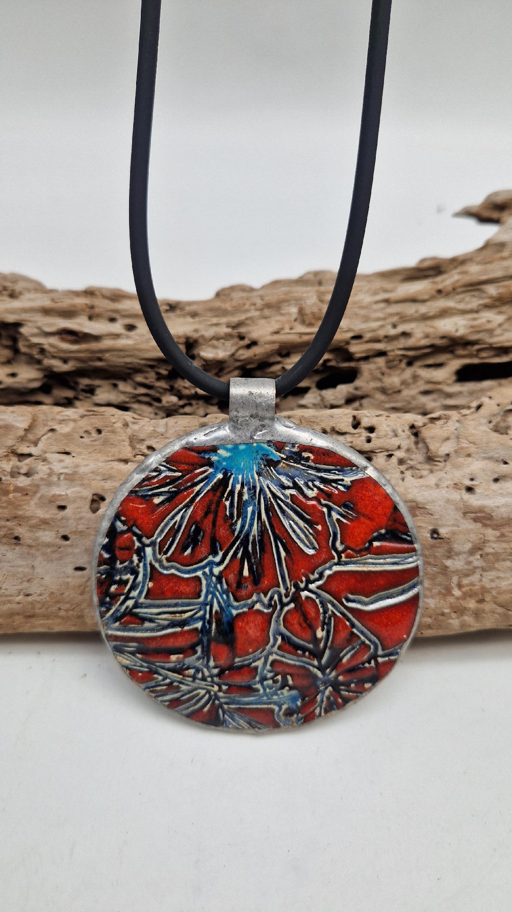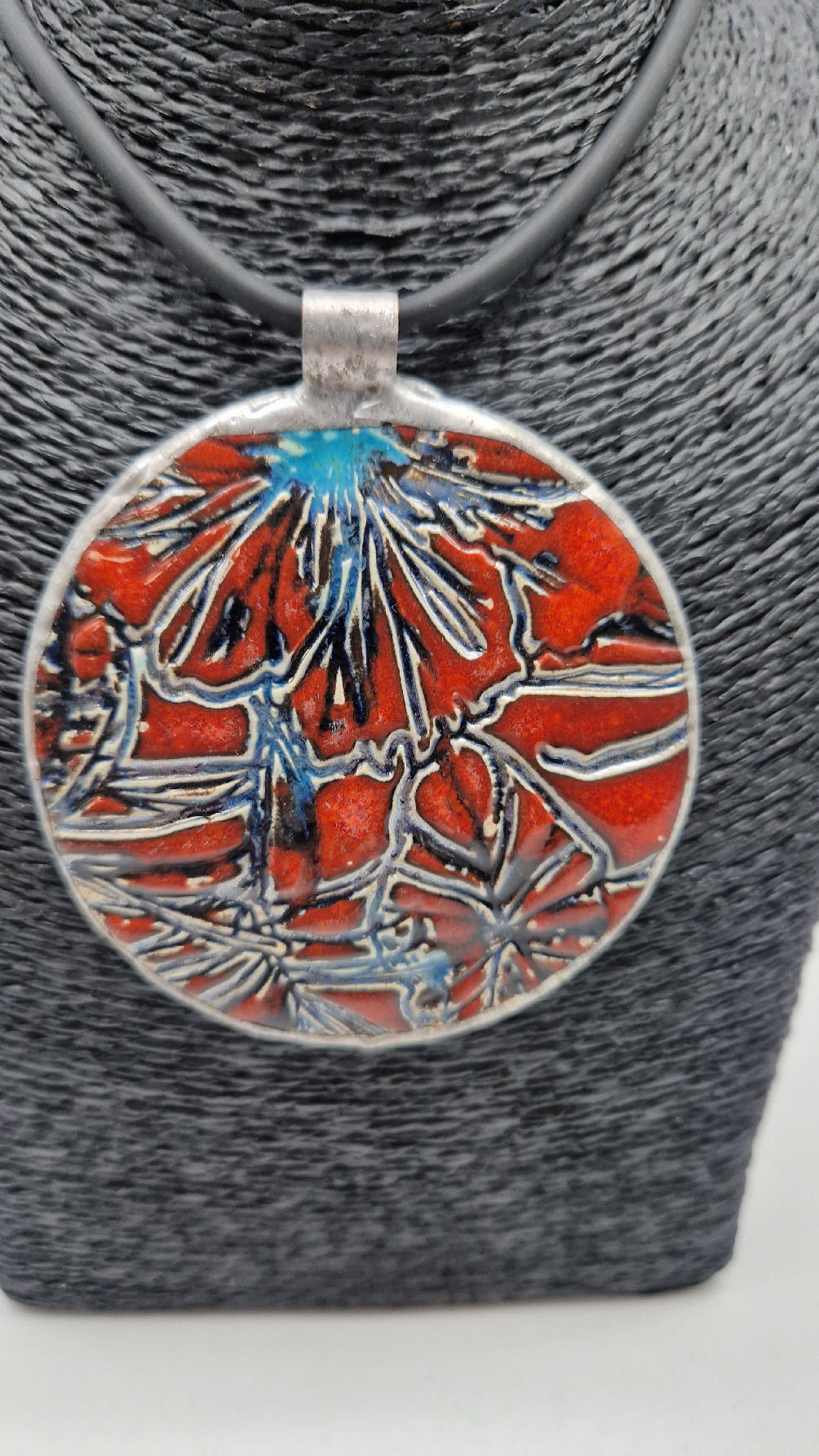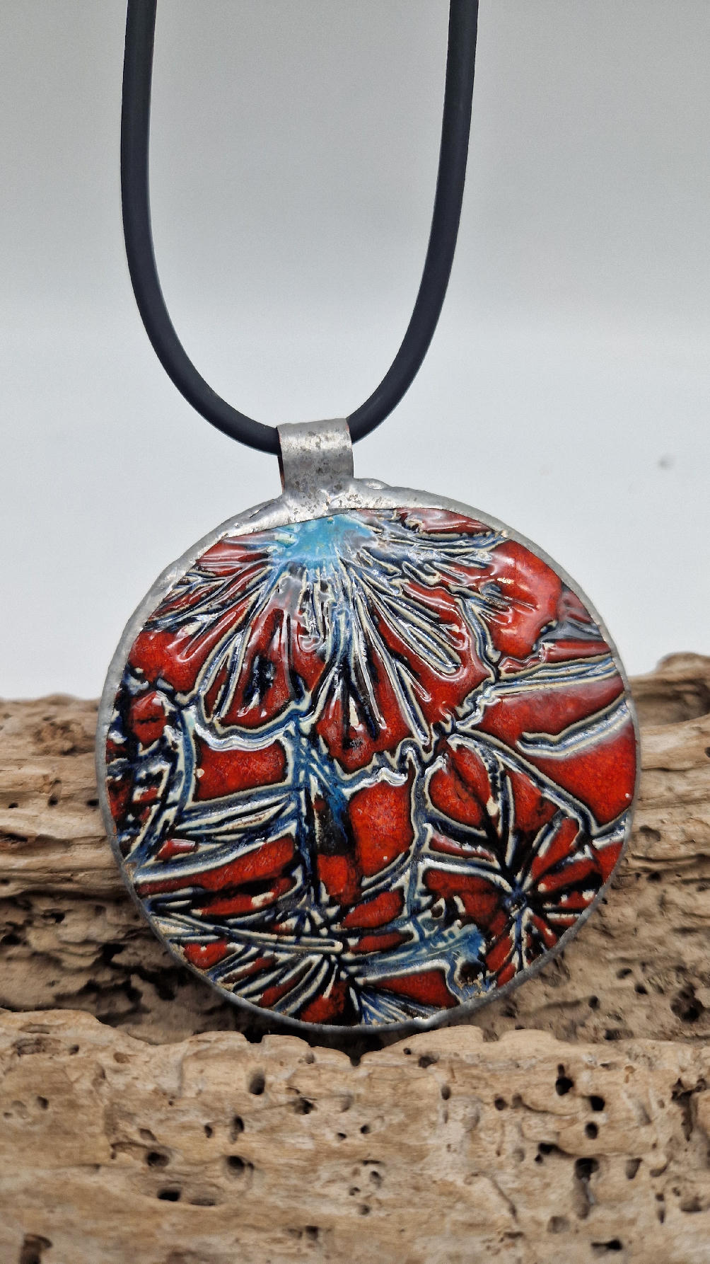 Duży ceramiczny wisior z ręcznie zrobioną ceramiką, intensywna czerwień, z odrobiną błękitu…trawy i kwiaty…otoczone lekką, ramką…pięknie to wygląda …