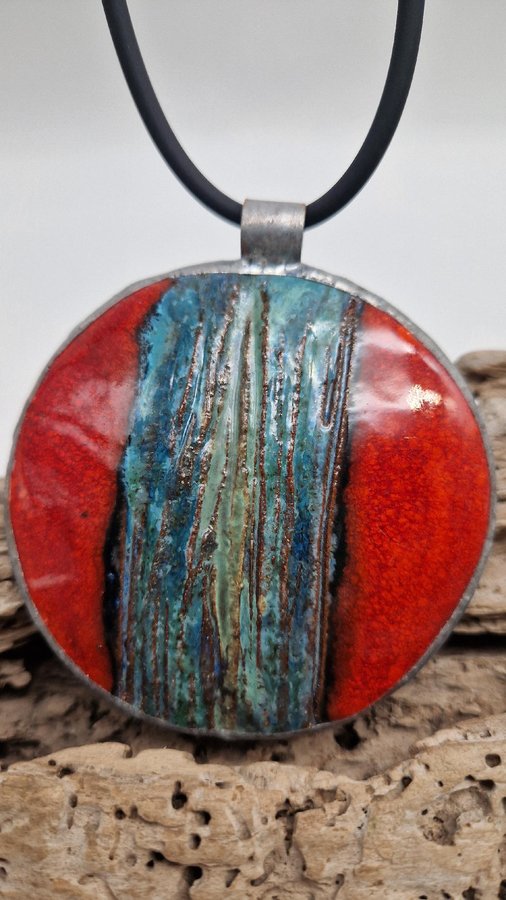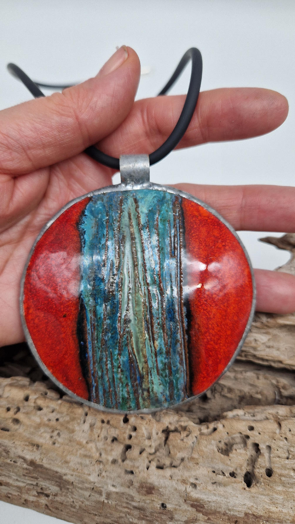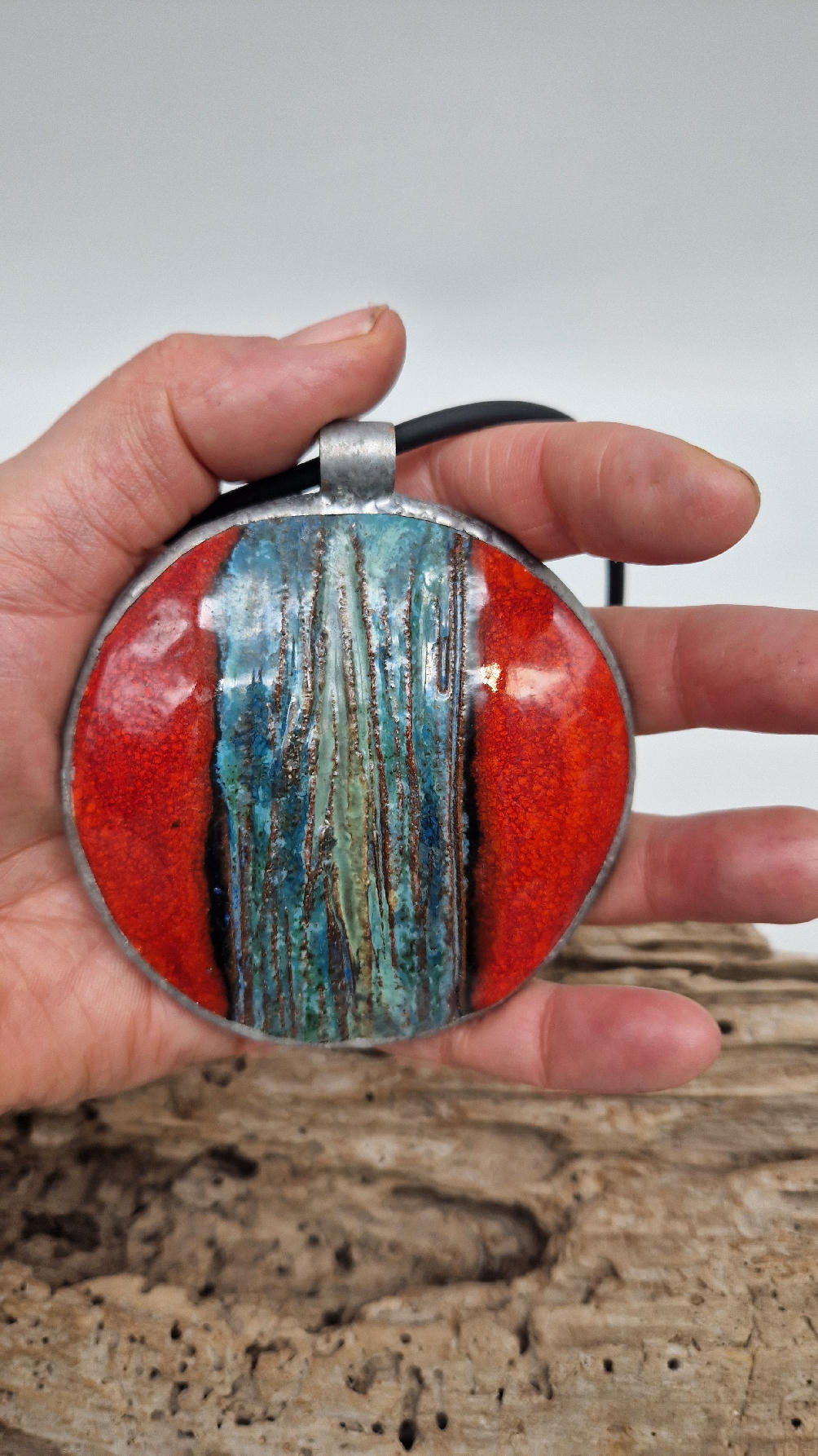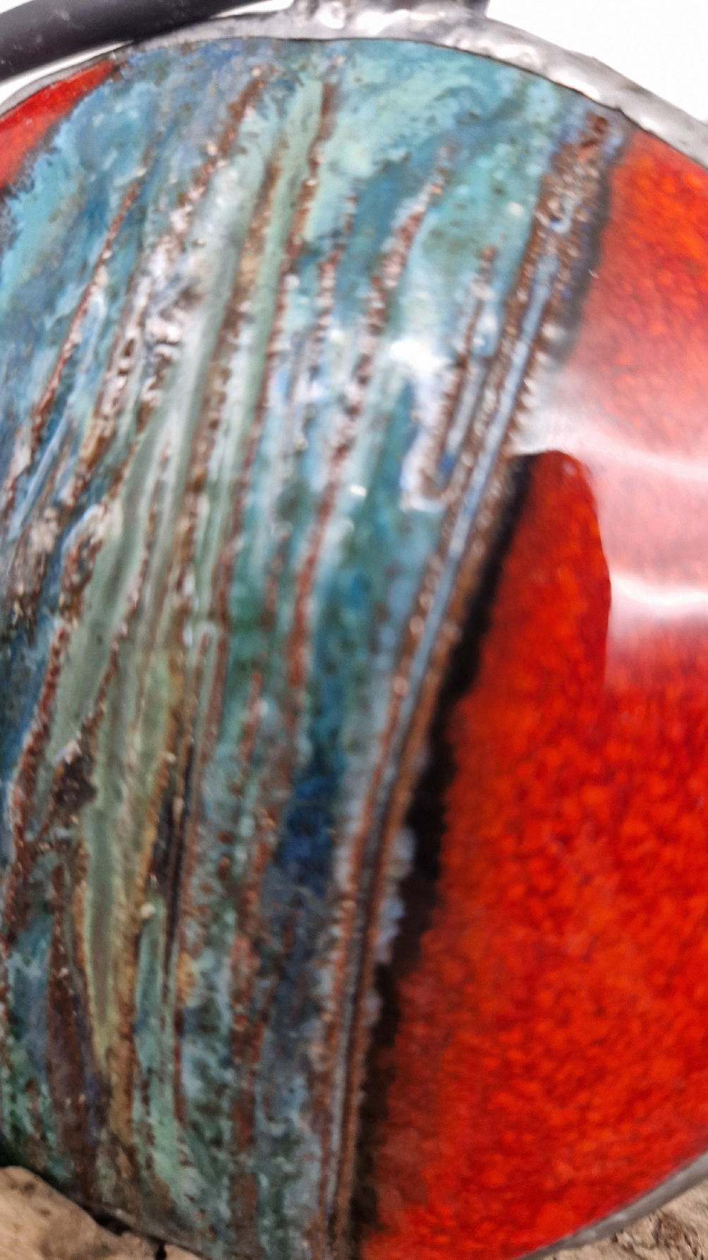 Duży ceramiczny wisior z ręcznie zrobioną ceramiką, intensywna czerwień, z paskiem blu…..otoczone lekką, ramką…pięknie to wygląda …