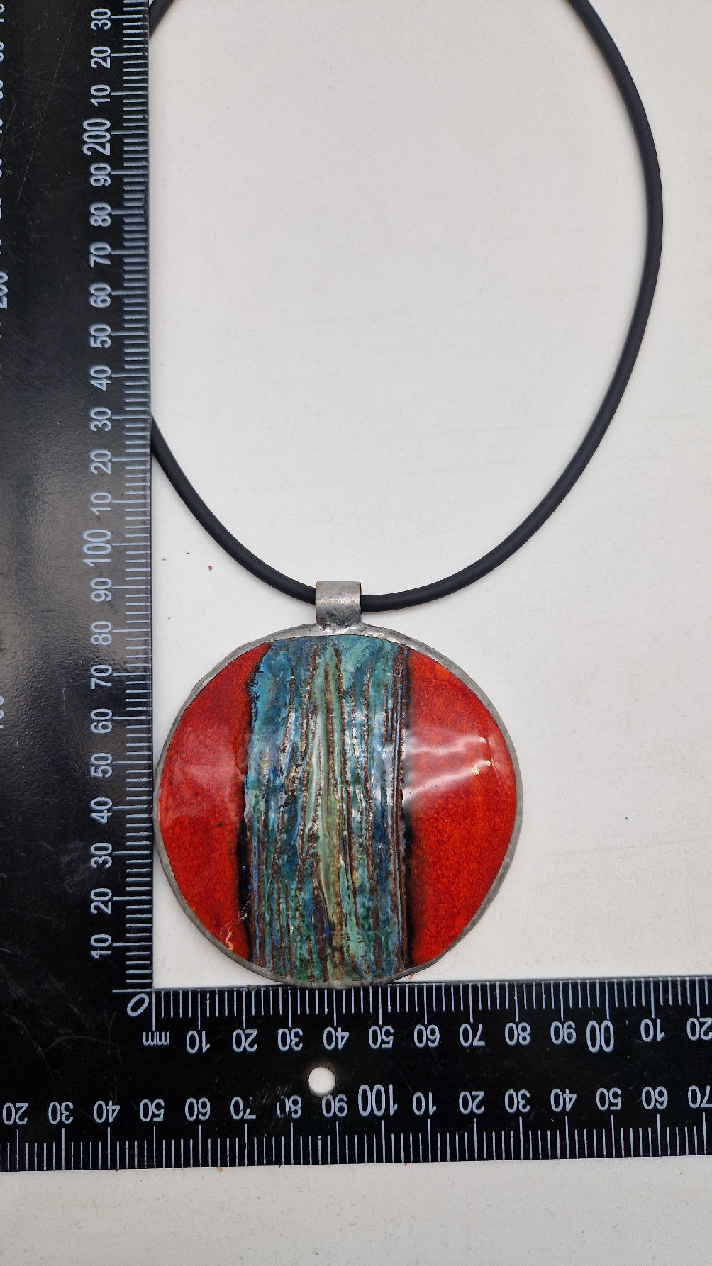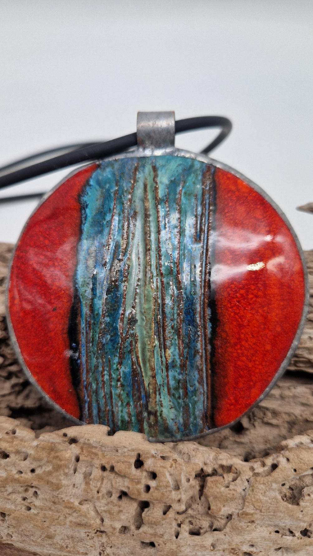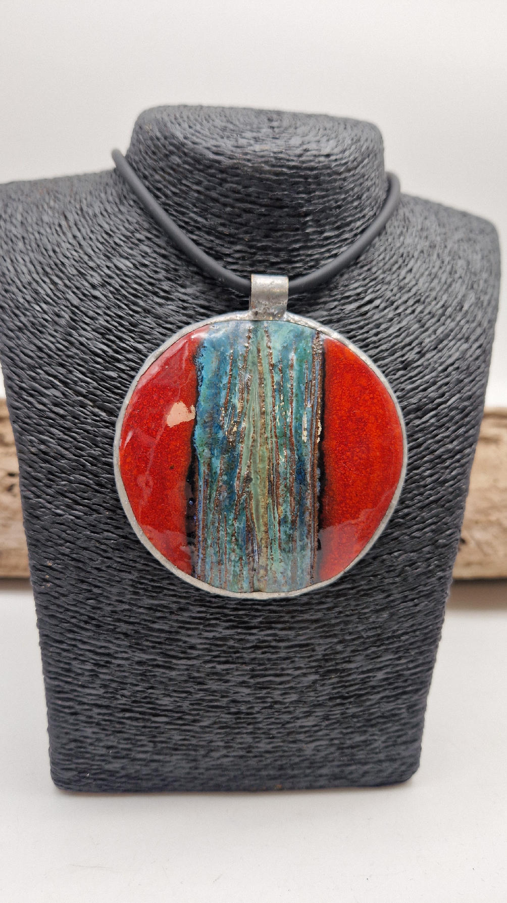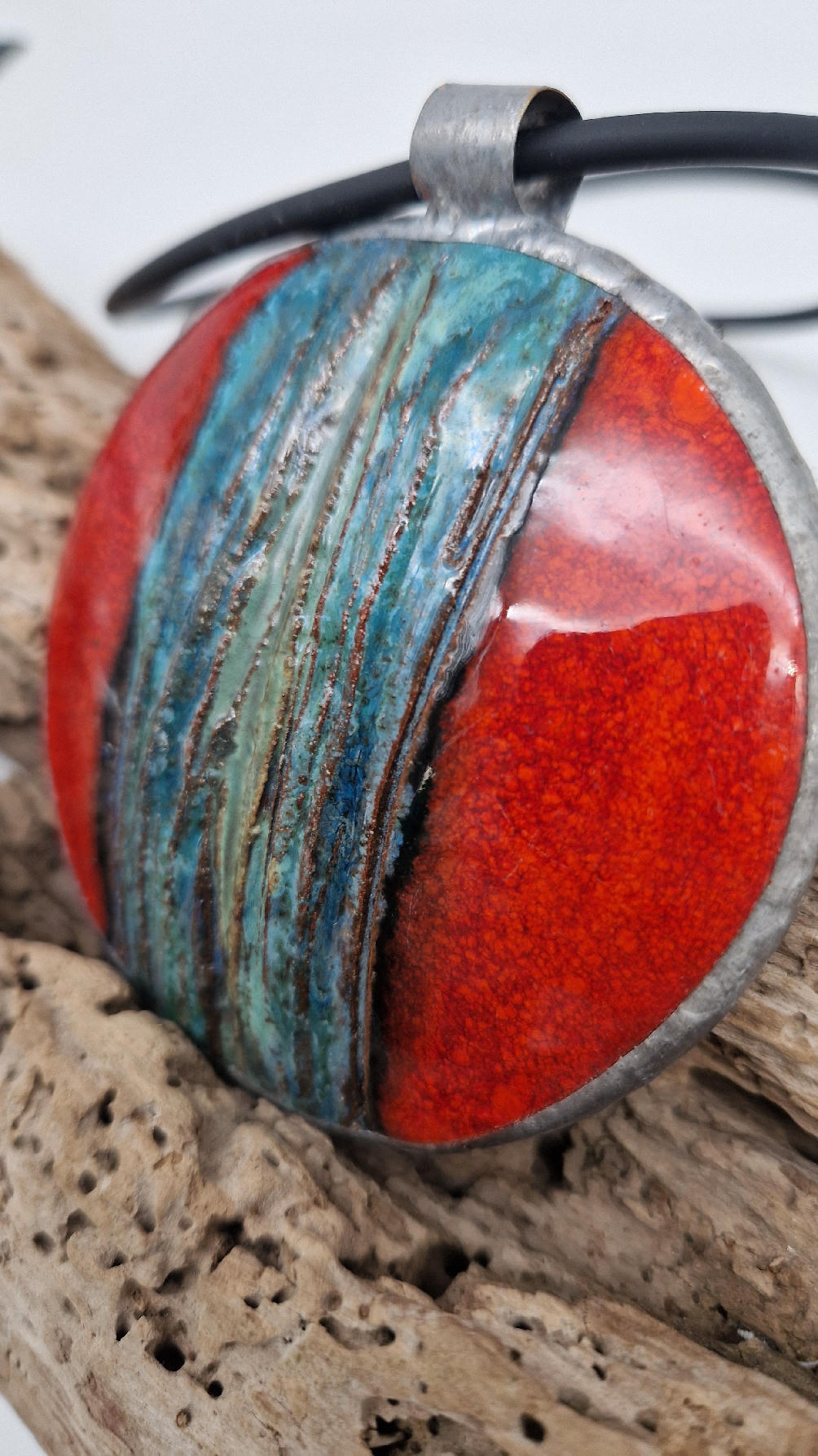 Duży ceramiczny wisior z ręcznie zrobioną ceramiką, intensywna czerwień, z paskiem blu…..otoczone lekką, ramką…pięknie to wygląda …