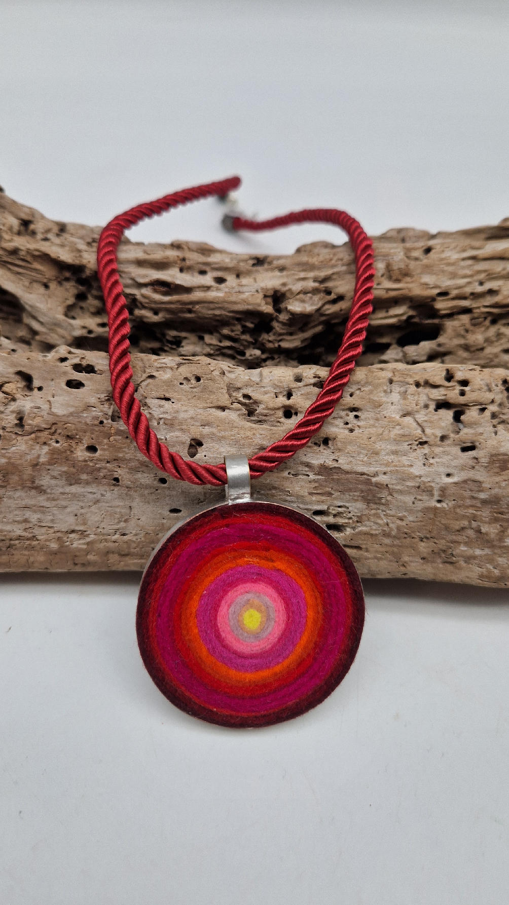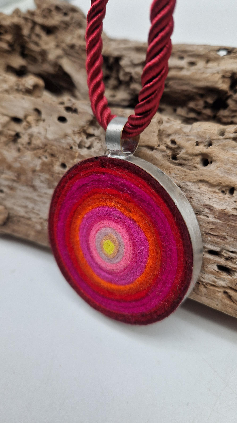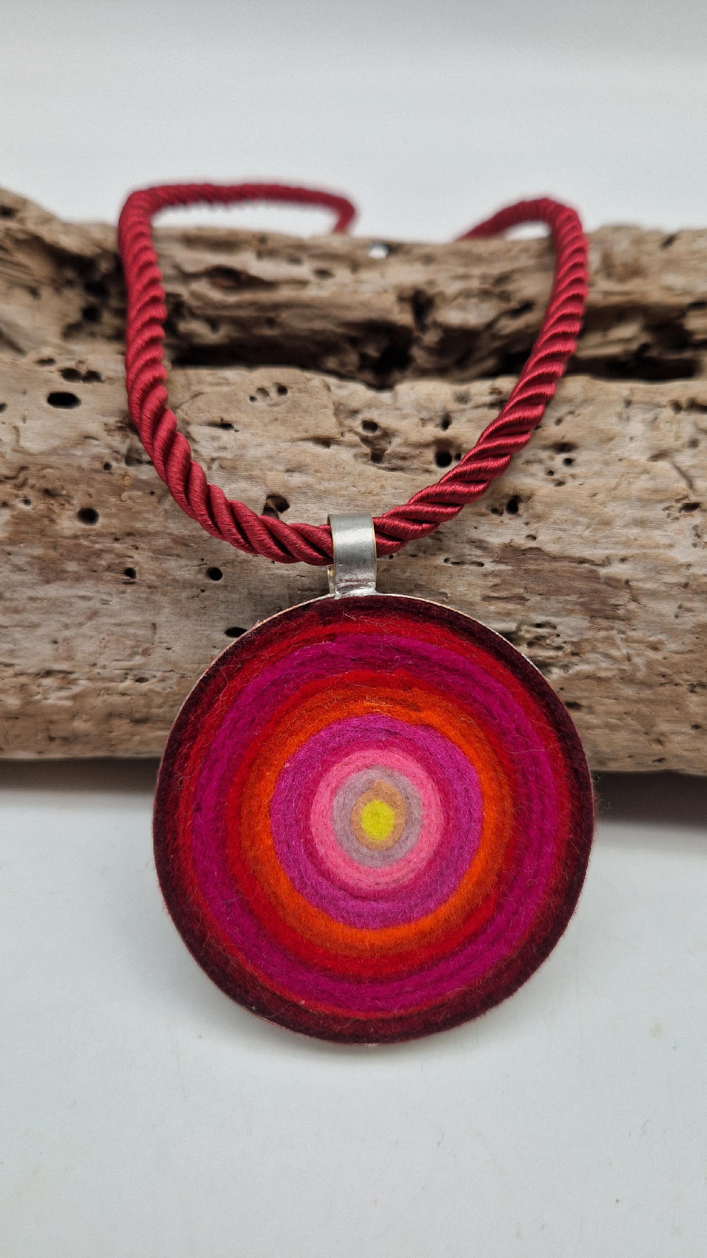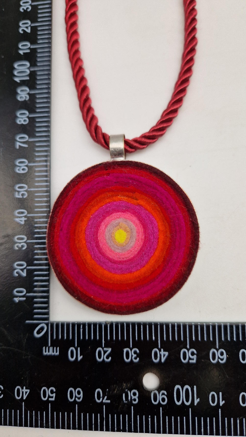 Nieduży megaenergetyczny czerwony wisior…metalowy, z kolorowym filcem w środku…okrągły, prosty, niebanalny, ponadczasowy, pięknie wykończony zrobiony z miedzi, kuty, patynowany, srebrzony, idealny…