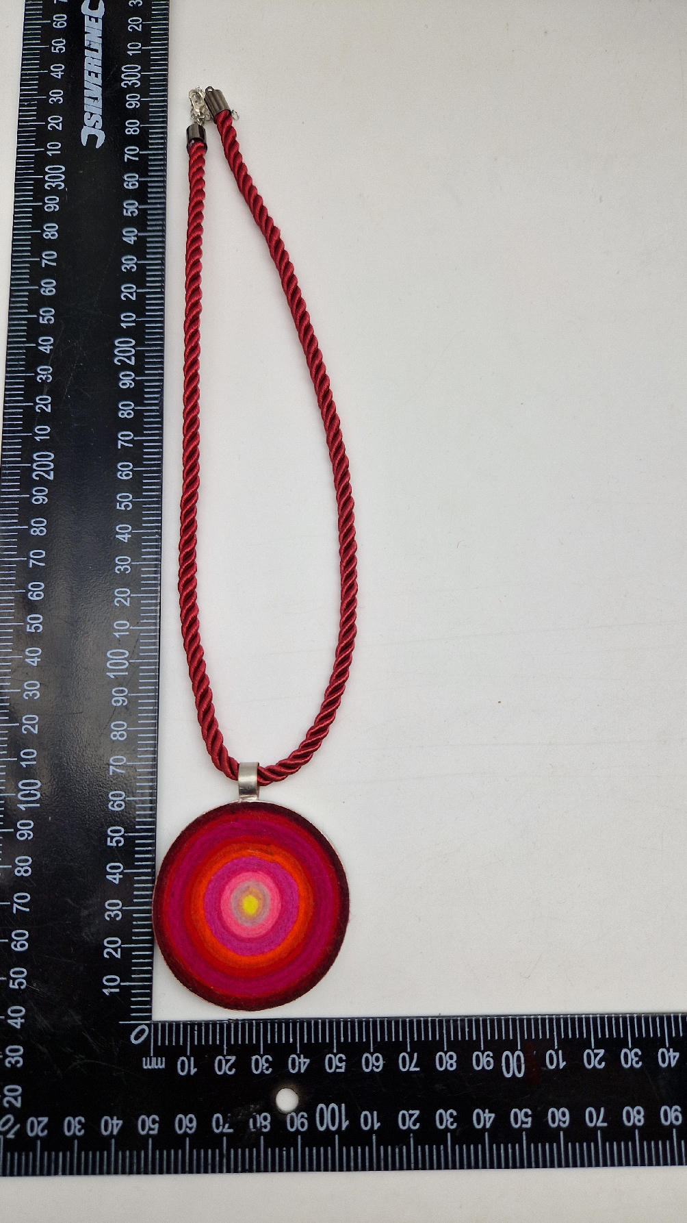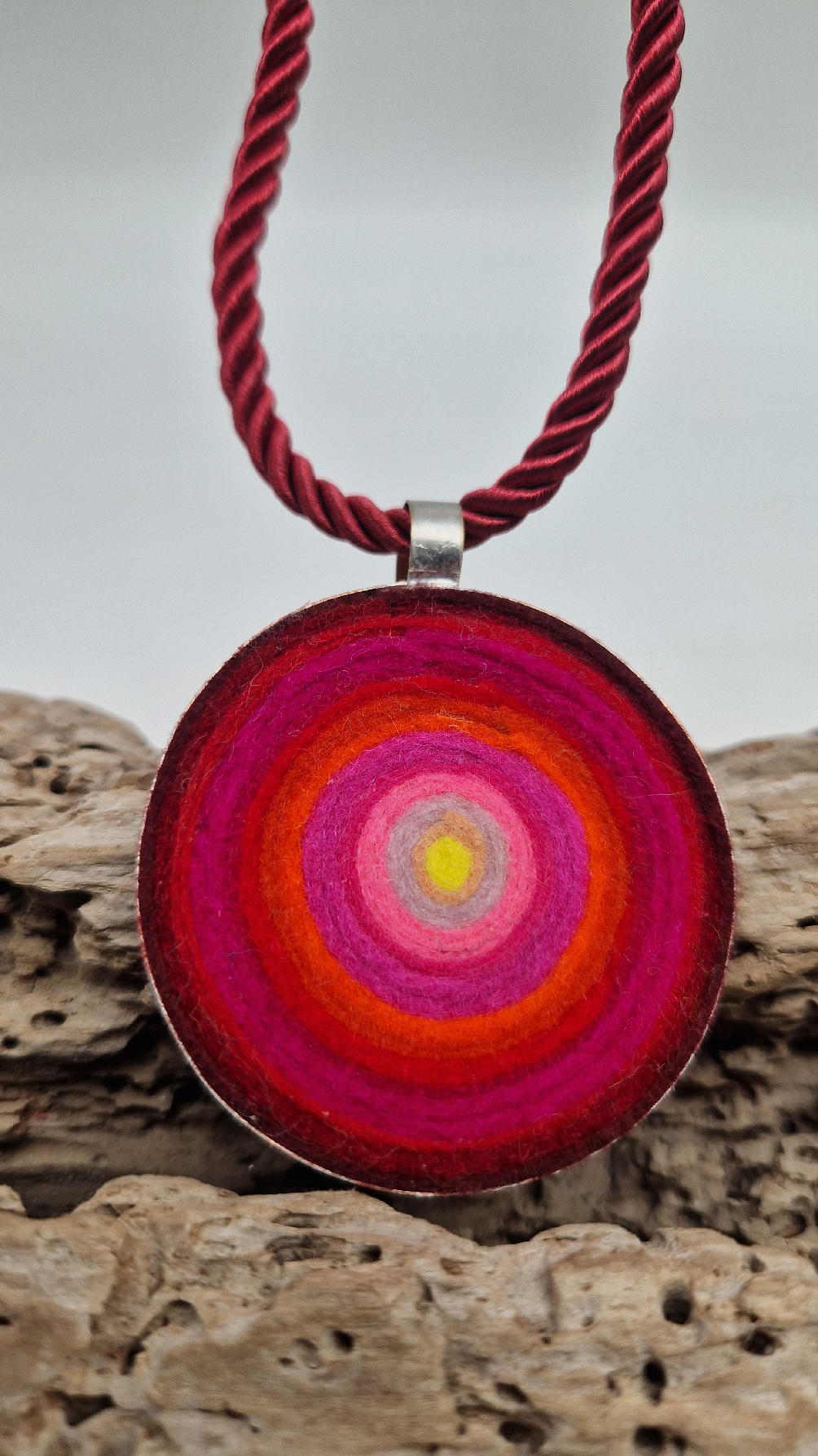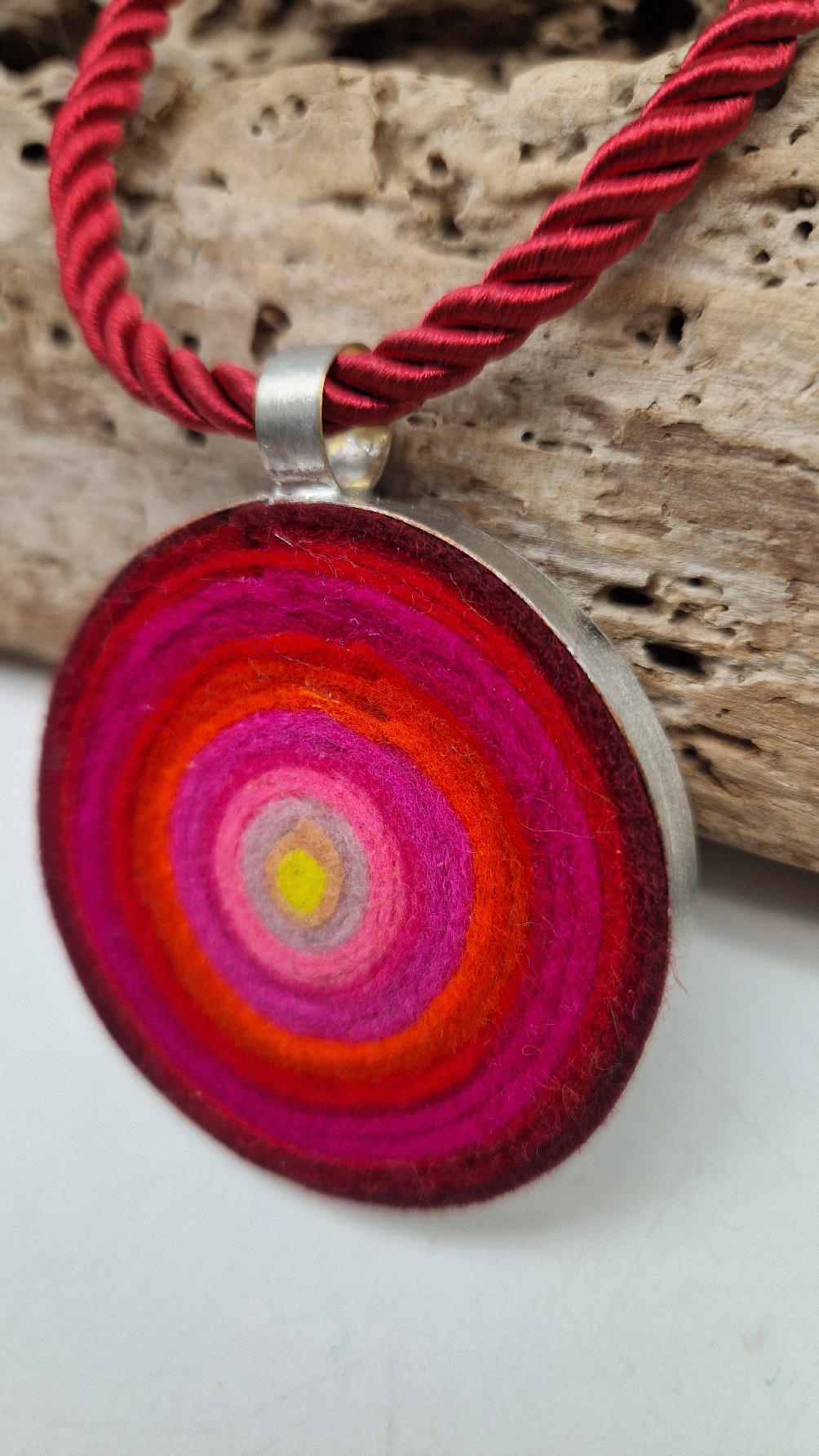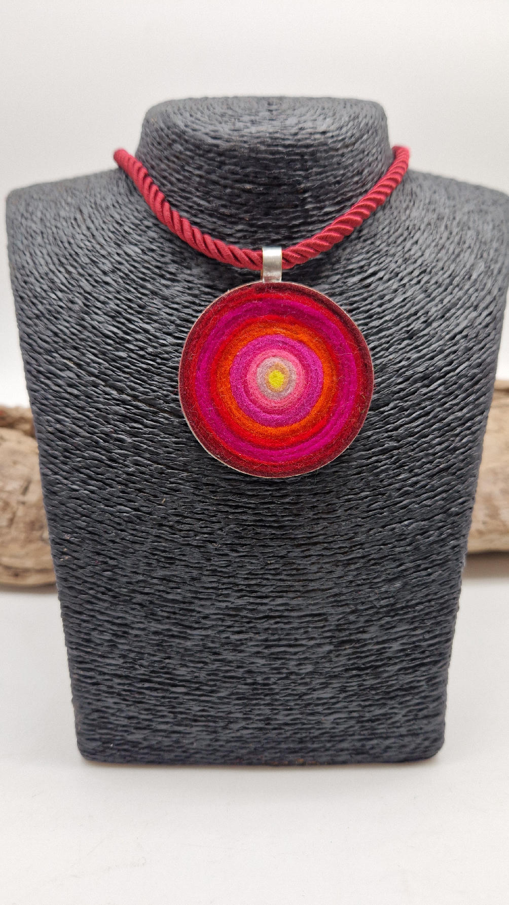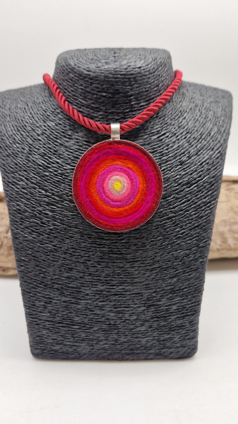 Nieduży megaenergetyczny czerwony wisior…metalowy, z kolorowym filcem w środku…okrągły, prosty, niebanalny, ponadczasowy, pięknie wykończony zrobiony z miedzi, kuty, patynowany, srebrzony, idealny…