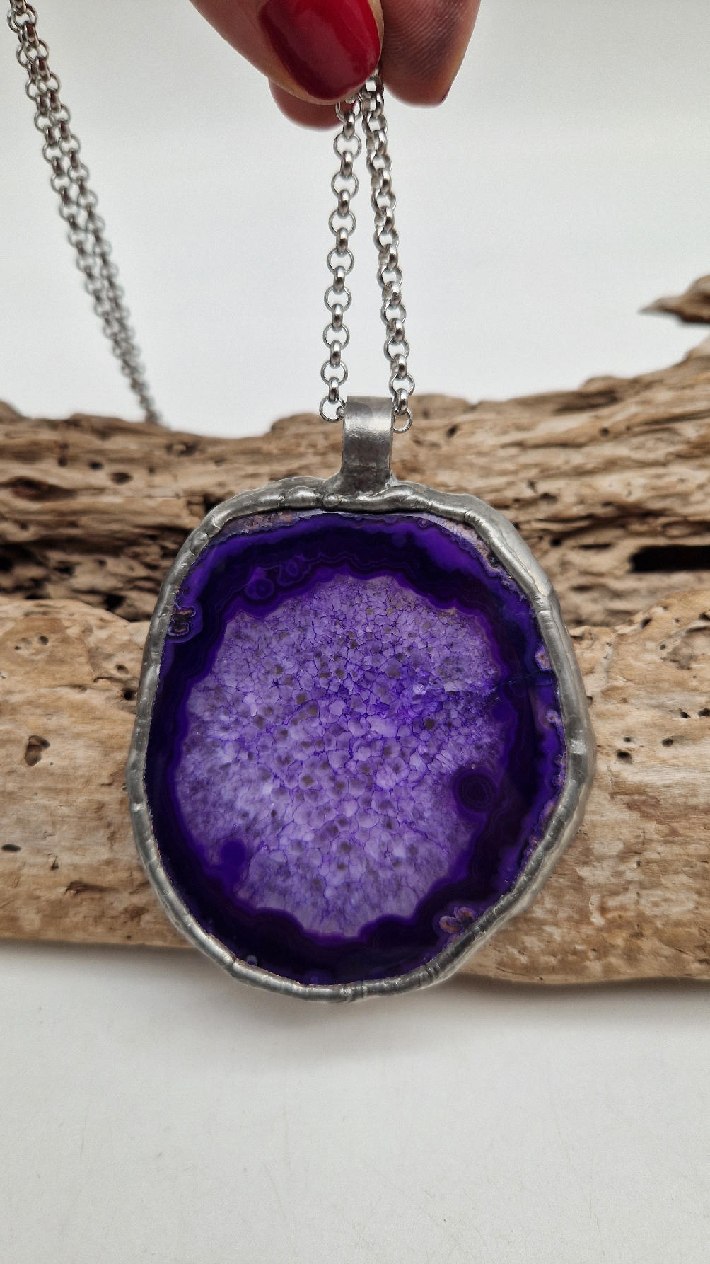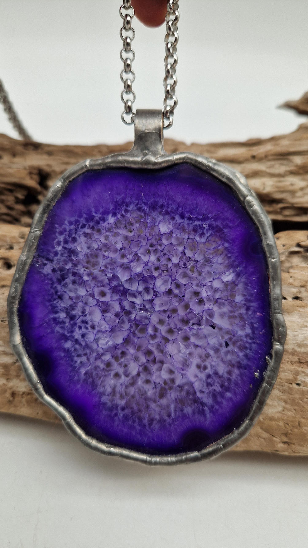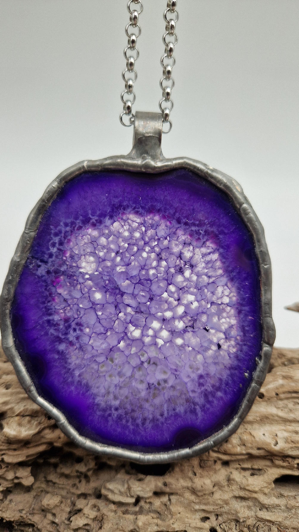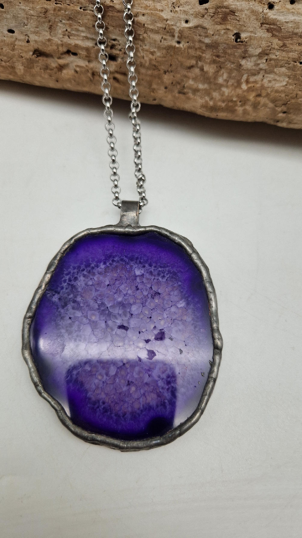Megafioletowy niezwykle uroczy, prosty, pasujący do wszystkiego wisior. Fioletowy jak lawenda,…naturalny plaster agatu, wygładzony i oprawiony w metal dwustronny, zawieszony na długim łańcuszku.