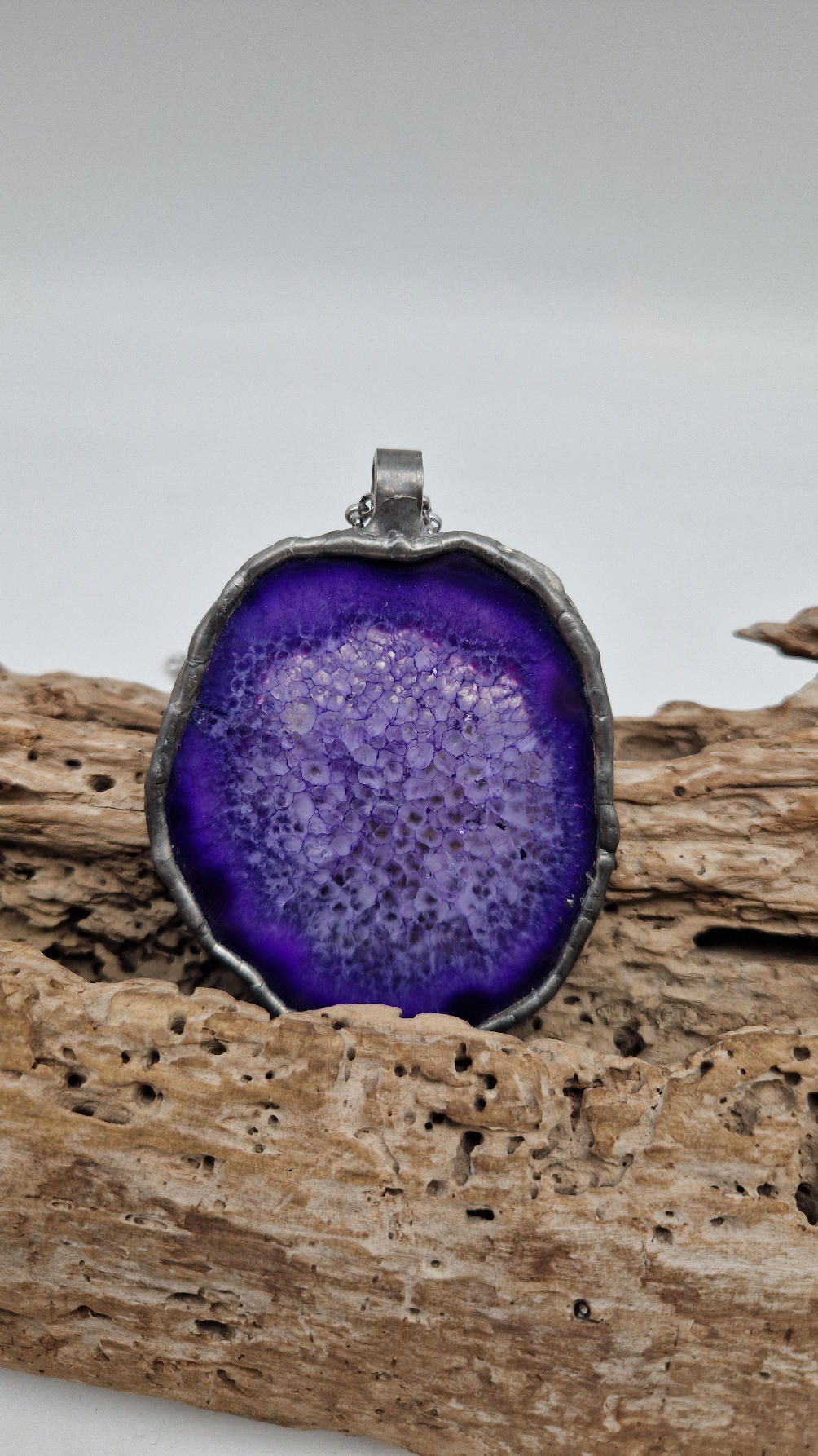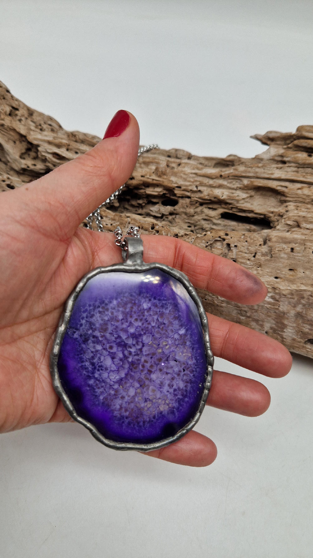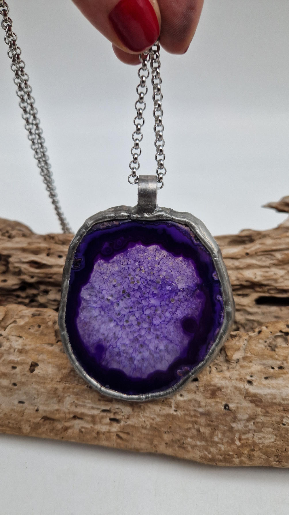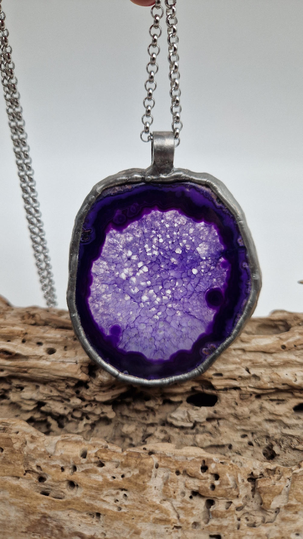 Megafioletowy niezwykle uroczy, prosty, pasujący do wszystkiego wisior. Fioletowy jak lawenda,…naturalny plaster agatu, wygładzony i oprawiony w metal dwustronny, zawieszony na długim łańcuszku.