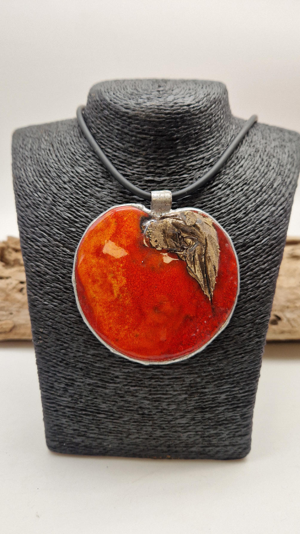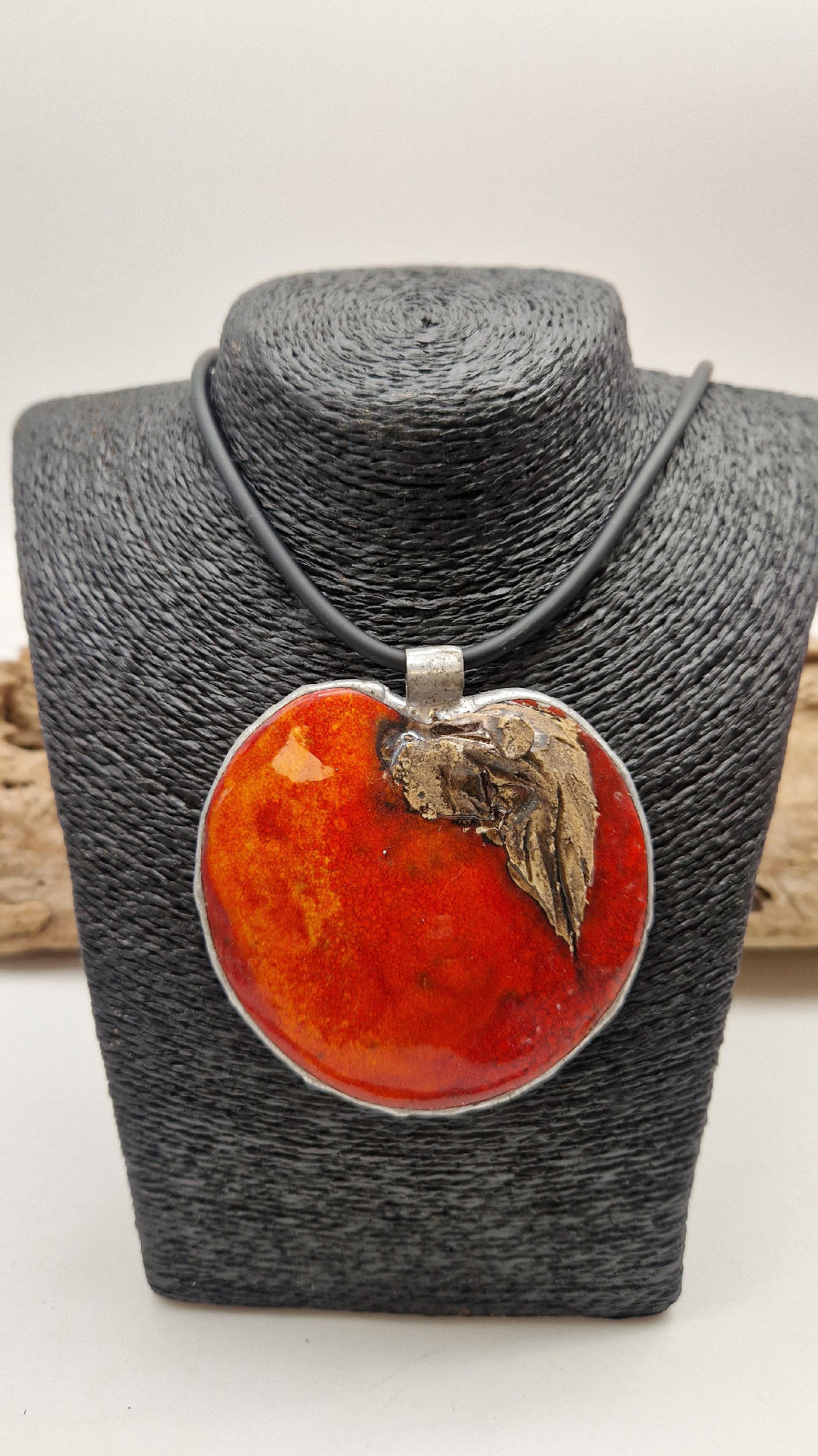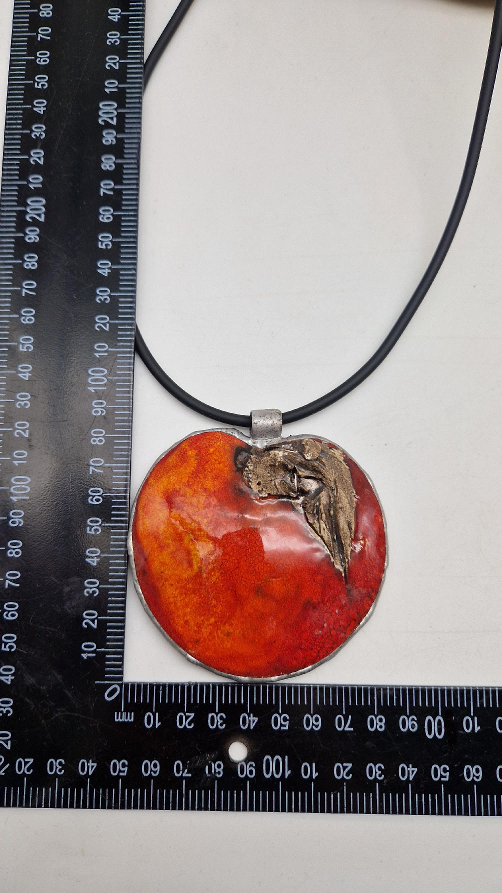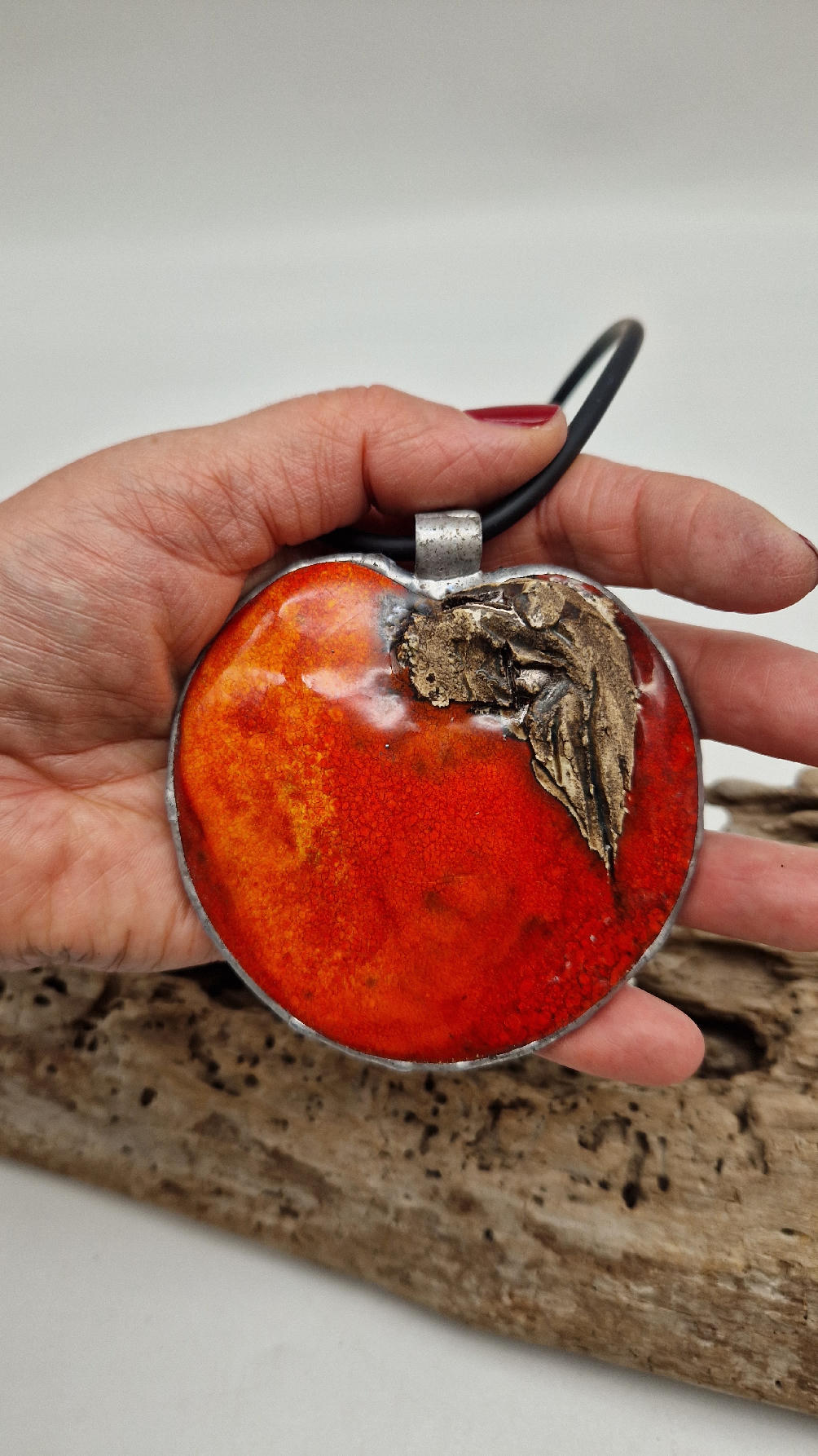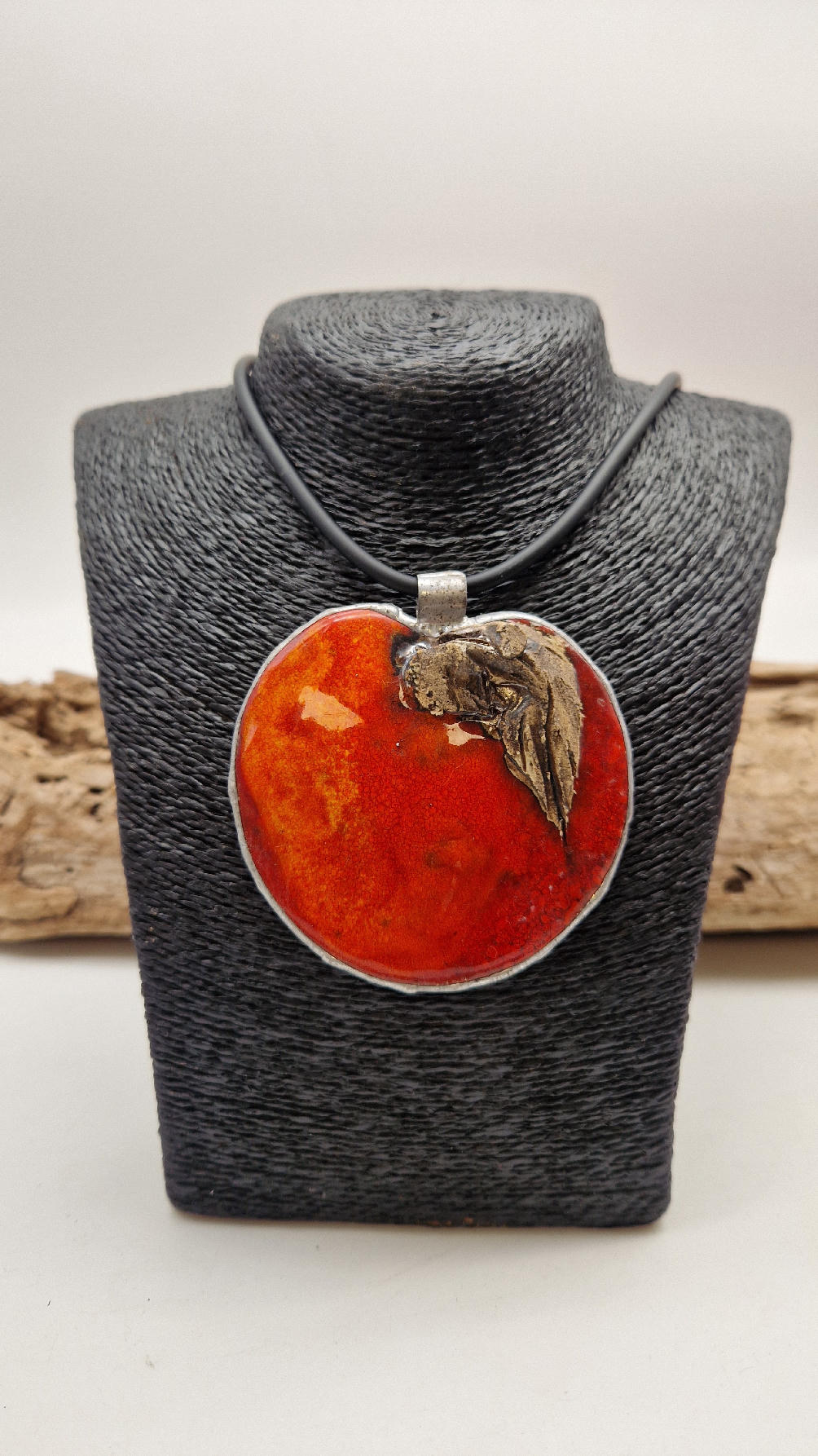 Cudny, ceramiczny duży wisior, ogniście soczyste, czerwone, śliczne jabłko, ceramika oprawiona w metal, cudna płaskorzeźba, która będzie piękną dekoracją Twojego dekoltu.
