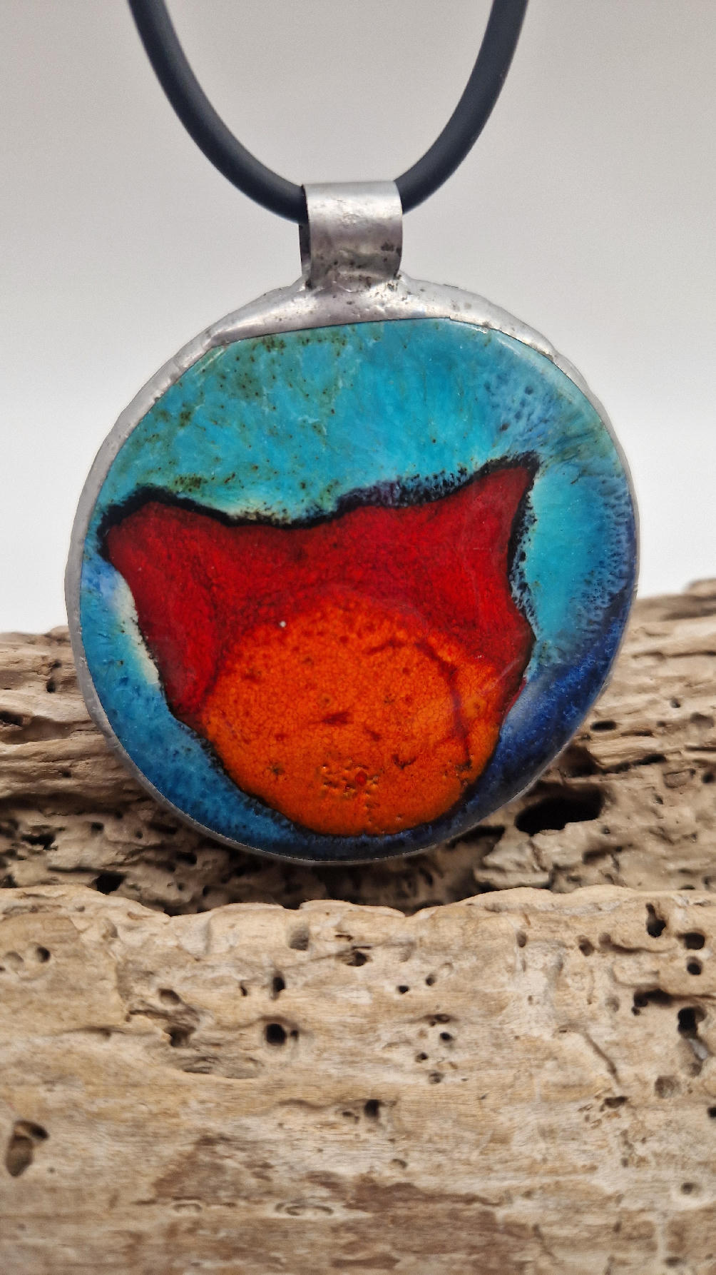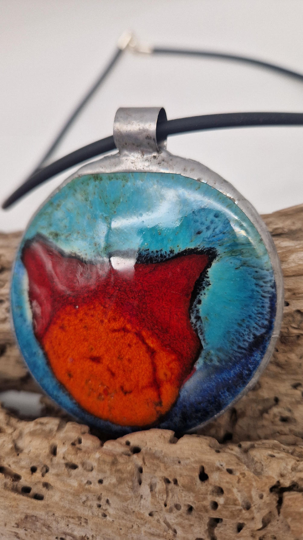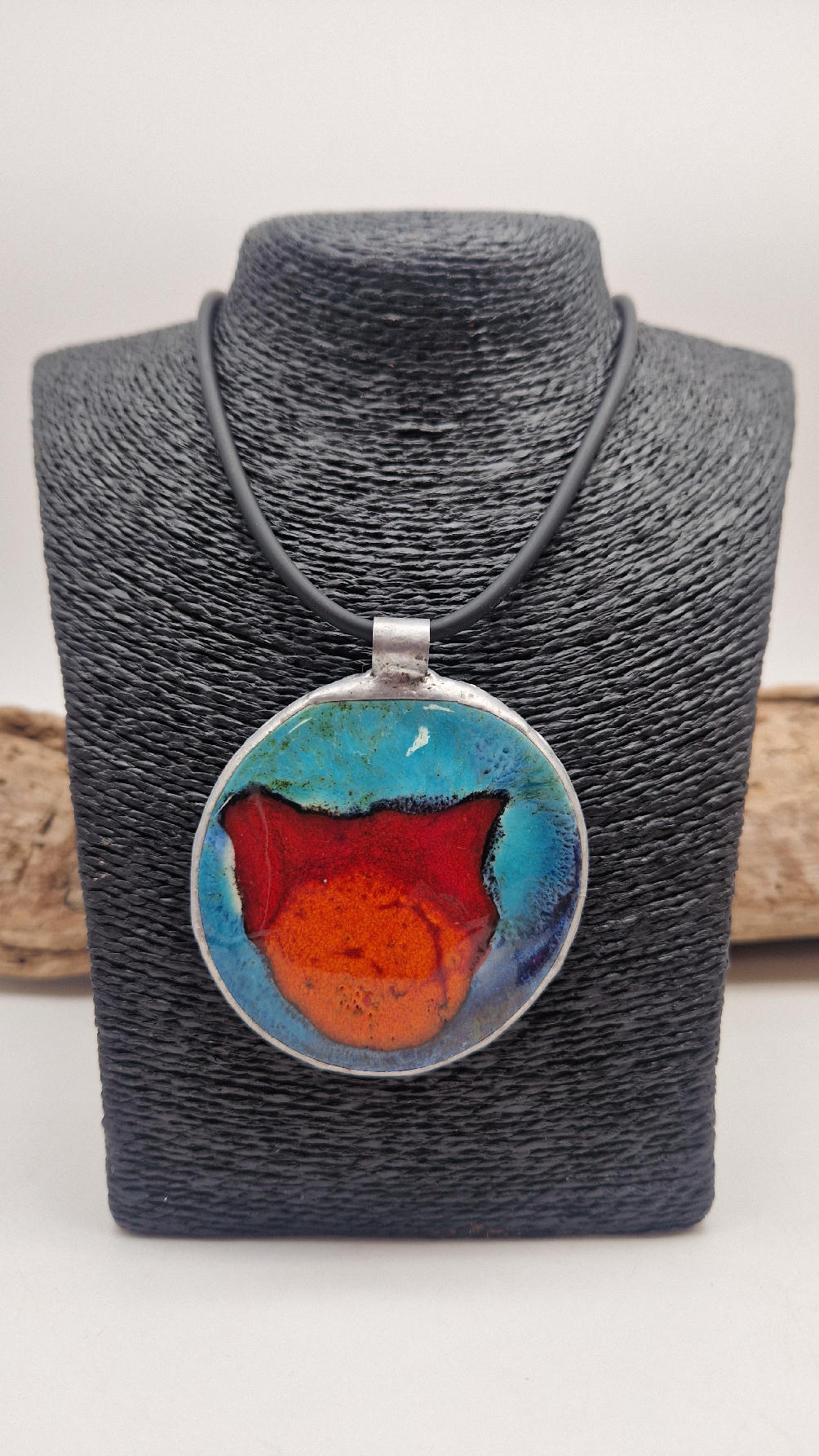 Cudny, ceramiczny kolorowy, energetyczny, wypukły, nieduży wisior, ceramika oprawiona w metal,  która będzie piękną dekoracją Twojego dekoltu.