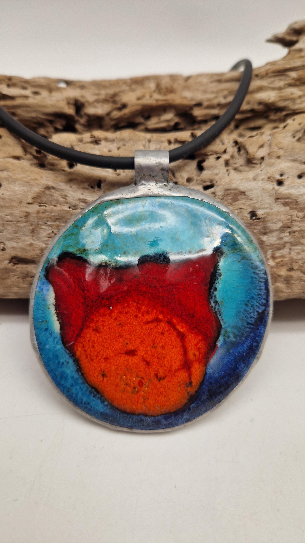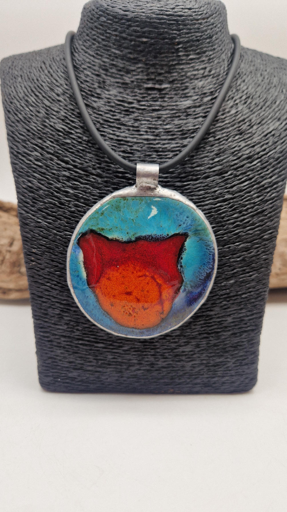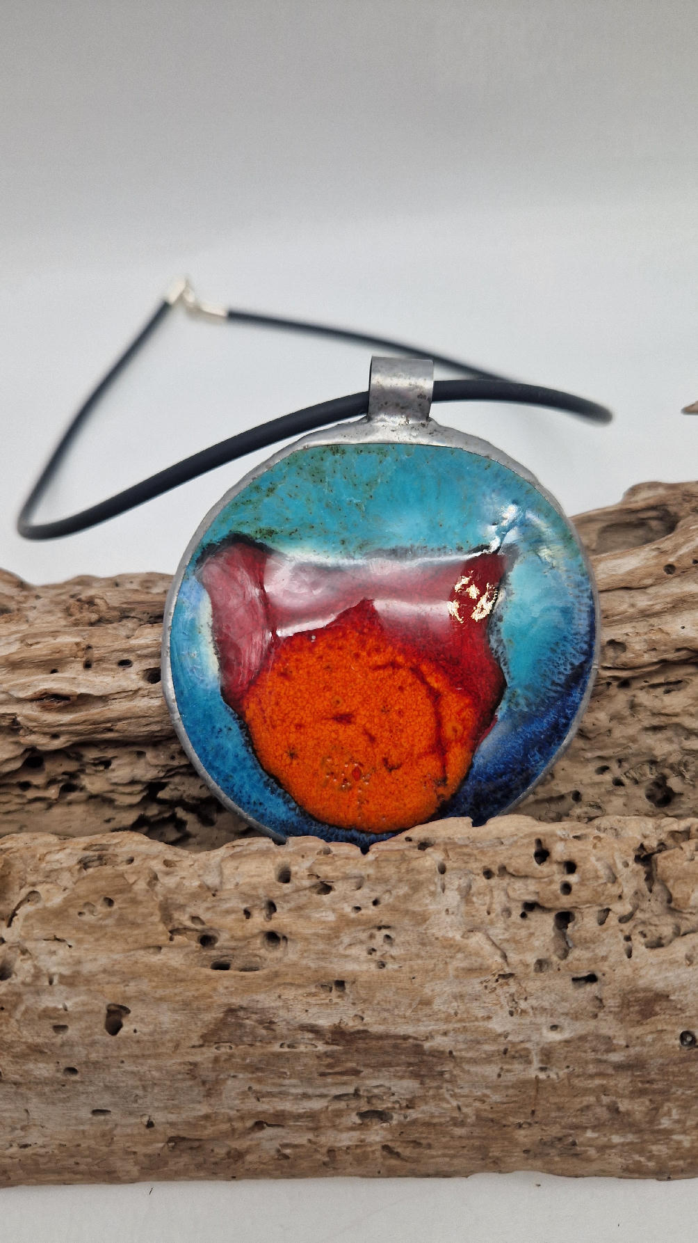 Cudny, ceramiczny kolorowy, energetyczny, wypukły, nieduży wisior, ceramika oprawiona w metal,  która będzie piękną dekoracją Twojego dekoltu.