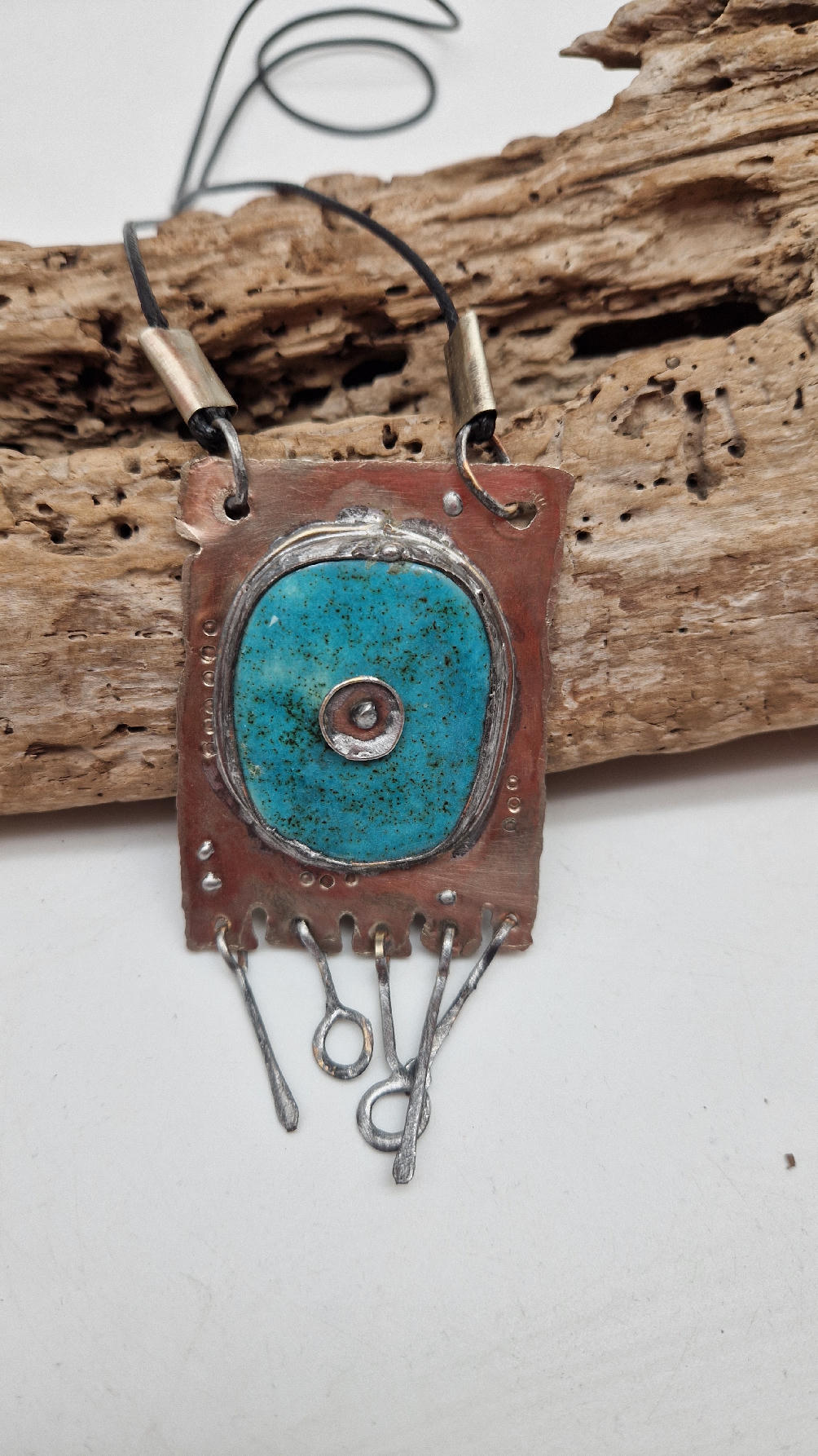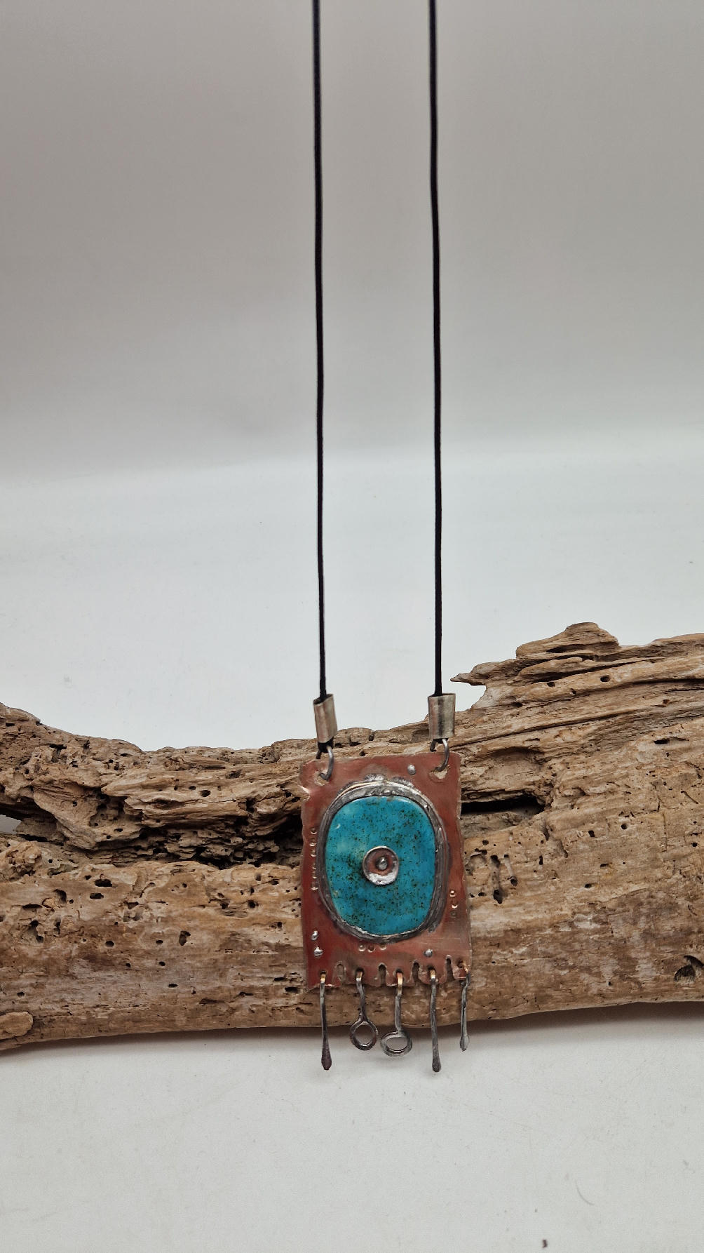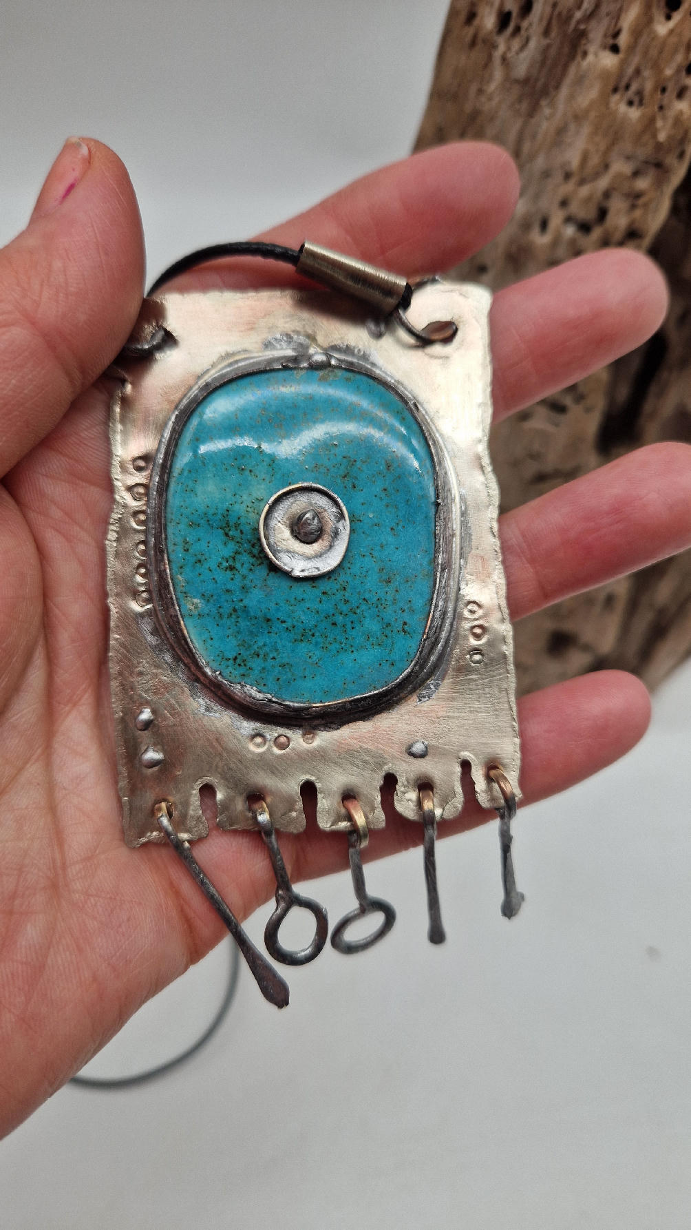 Obłędny , duży wisior , którego sercem jest duża, ręcznie robiona ceramika w głębokim kolorze oprawiona w alpakę. Wisior zawieszony jest na długim rzemieniu…na dole tańczące wykonane z metalu dodatkowe zawieszki, sprawiają że wisior porusza się i gra przy każdym kroku…no przecież jesteś Królową Mórz!