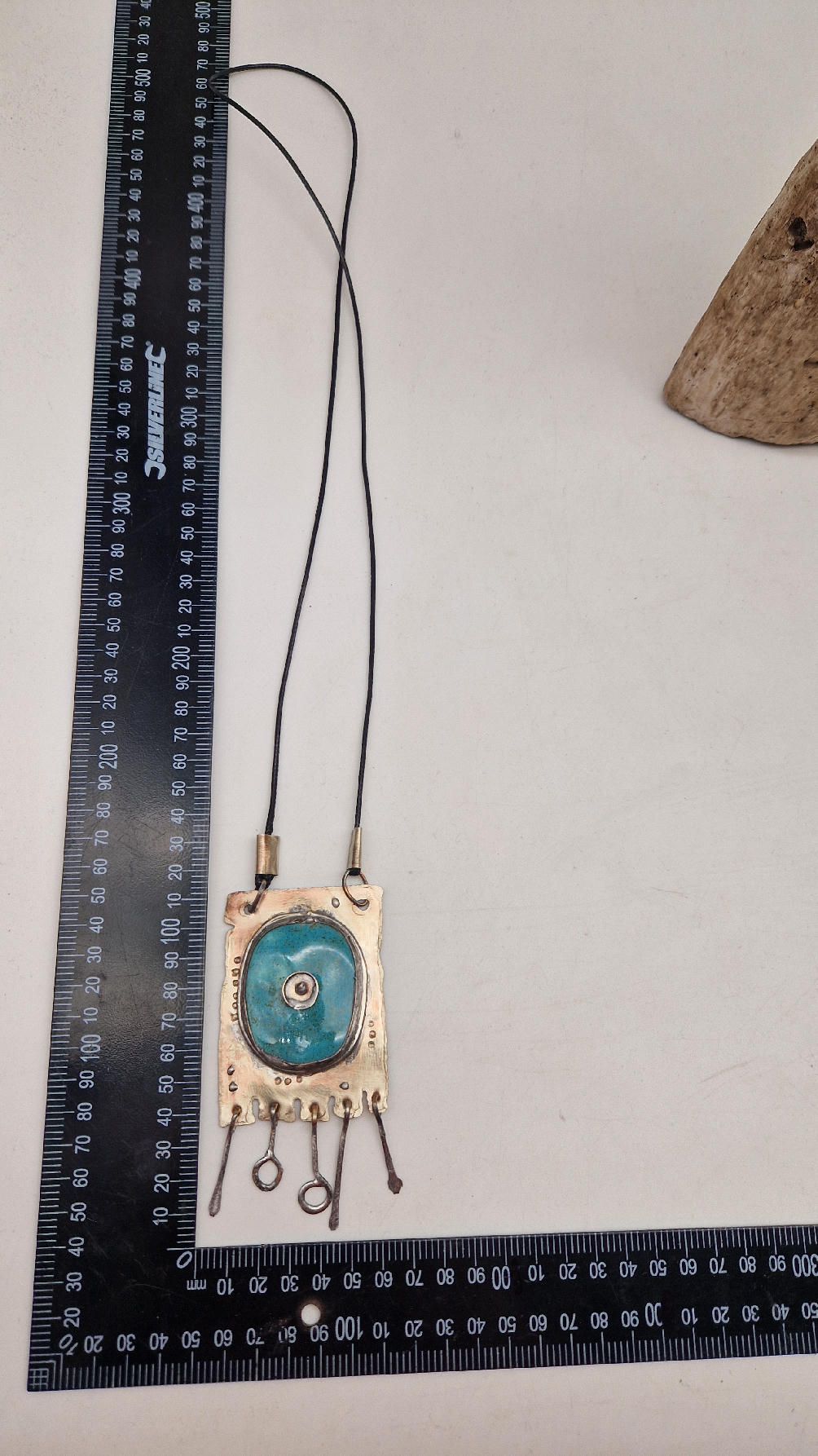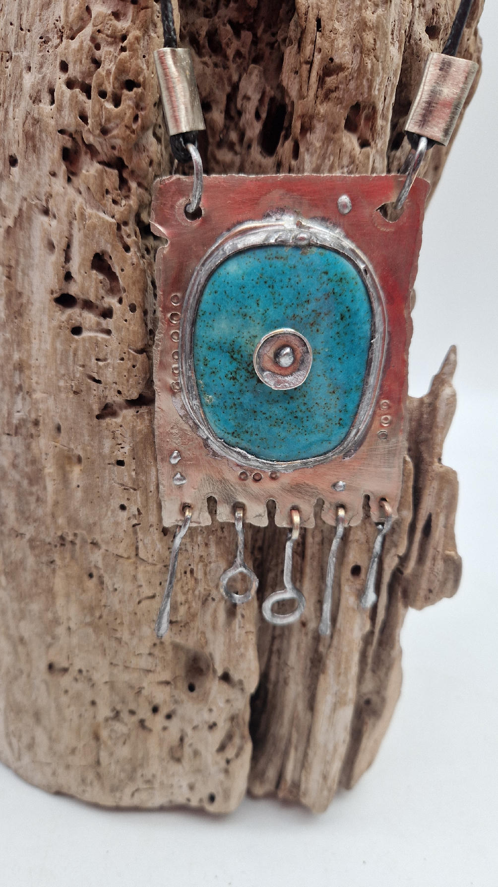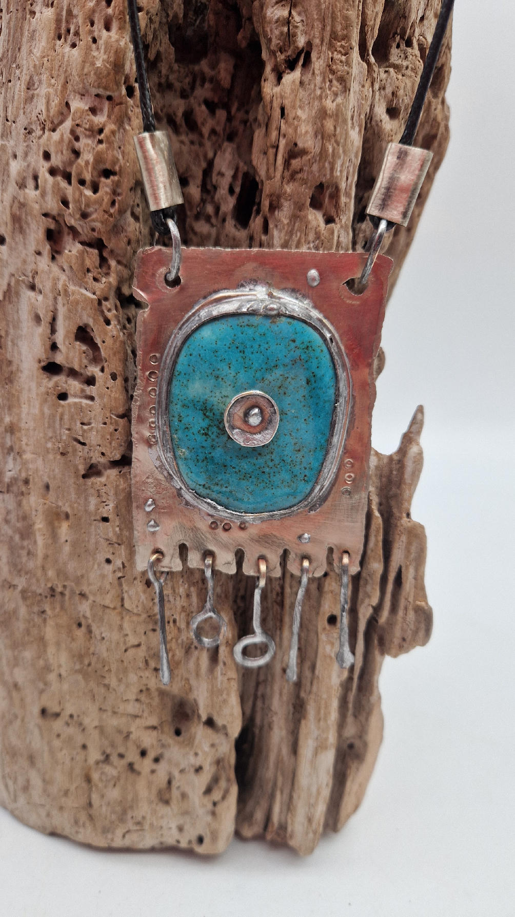 Obłędny , duży wisior , którego sercem jest duża, ręcznie robiona ceramika w głębokim kolorze oprawiona w alpakę. Wisior zawieszony jest na długim rzemieniu…na dole tańczące wykonane z metalu dodatkowe zawieszki, sprawiają że wisior porusza się i gra przy każdym kroku…no przecież jesteś Królową Mórz!