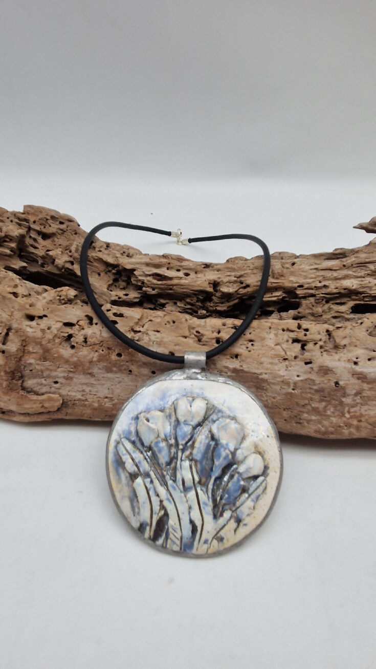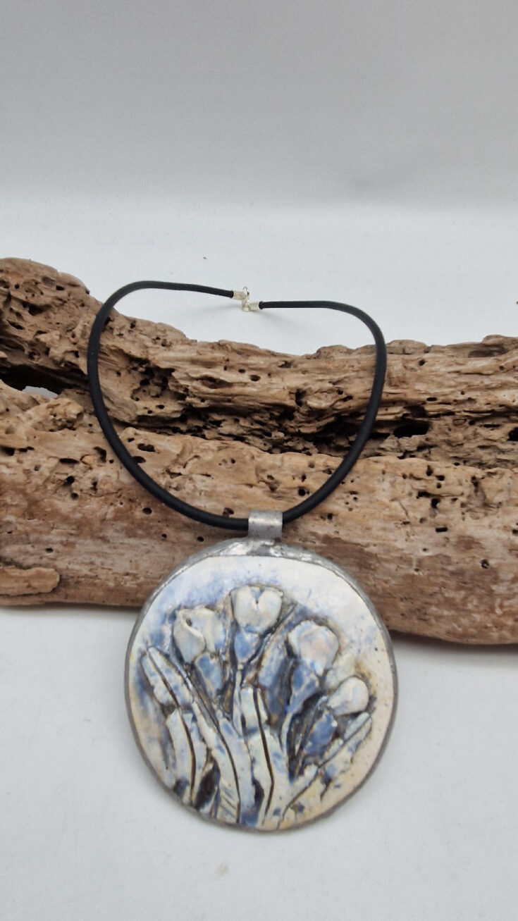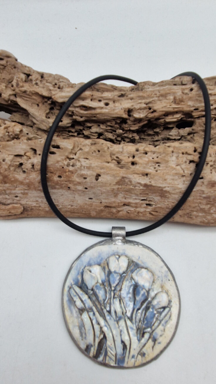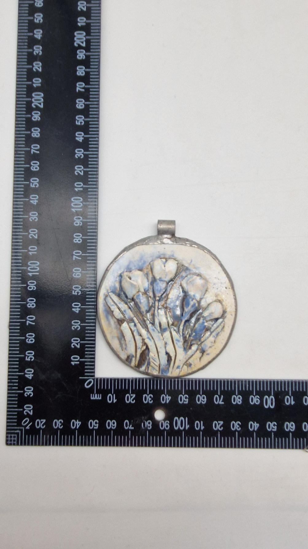 Śliczny ceramiczny, duży wisior zawieszony na kauczukowym rzemieniu. Kwiaty, ale takie niewiędnące i śliczne ,które będą cieszyć oczy niezmiennie przez długi czas..
