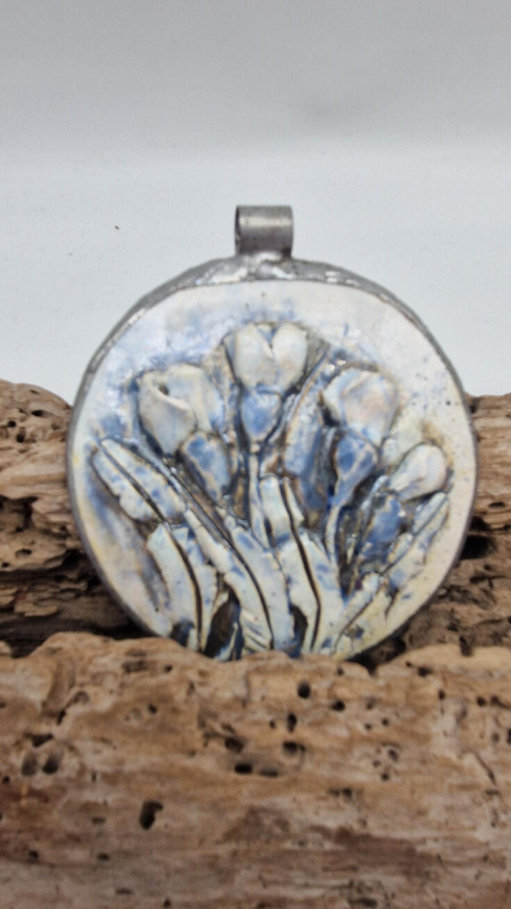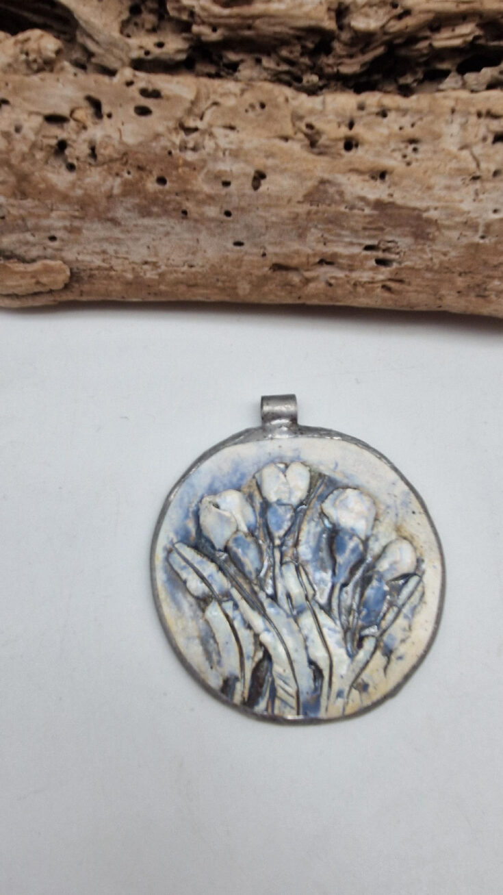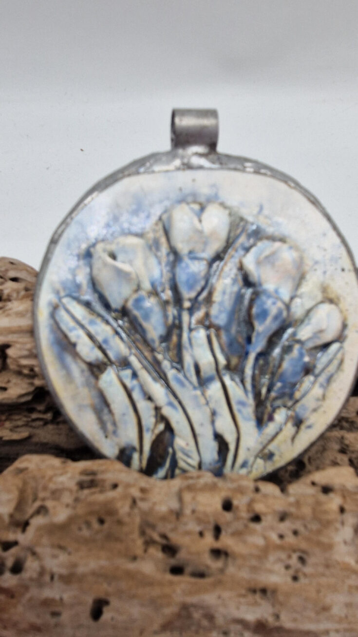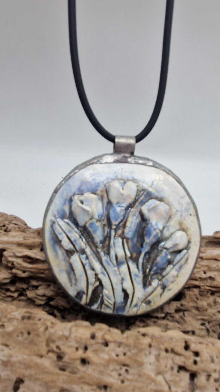 Śliczny ceramiczny, duży wisior zawieszony na kauczukowym rzemieniu. Kwiaty, ale takie niewiędnące i śliczne ,które będą cieszyć oczy niezmiennie przez długi czas..