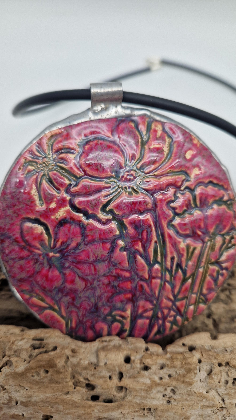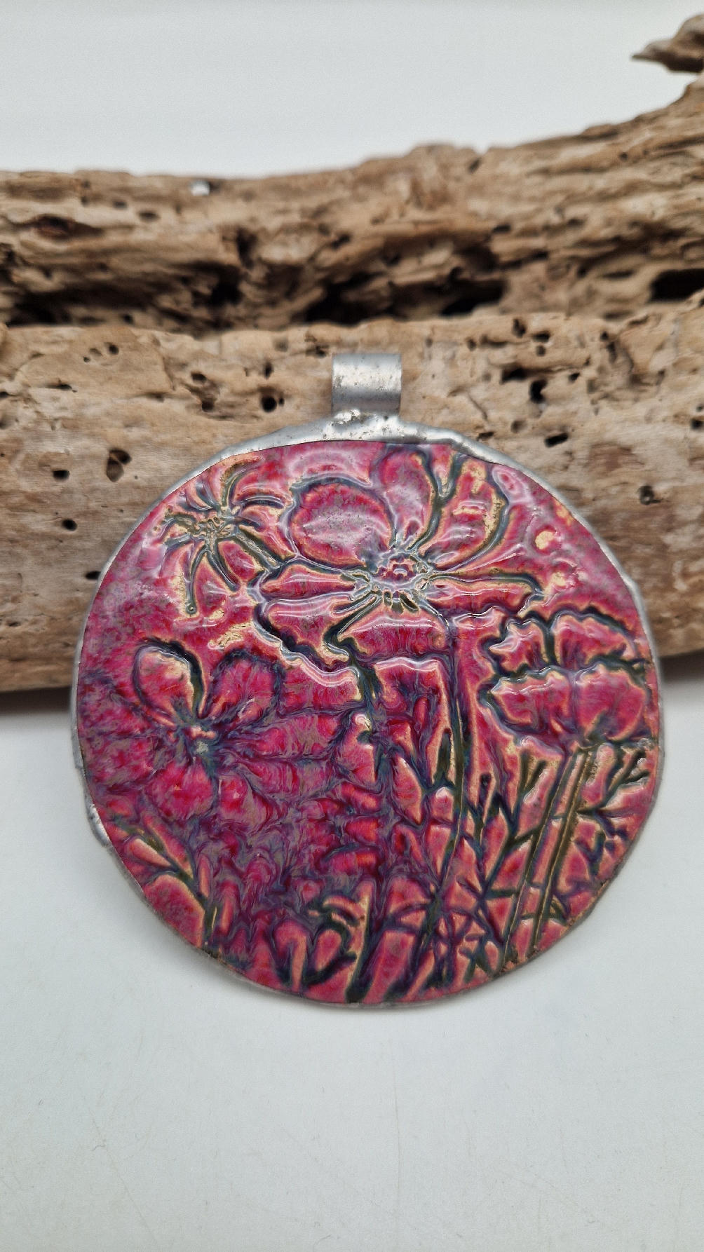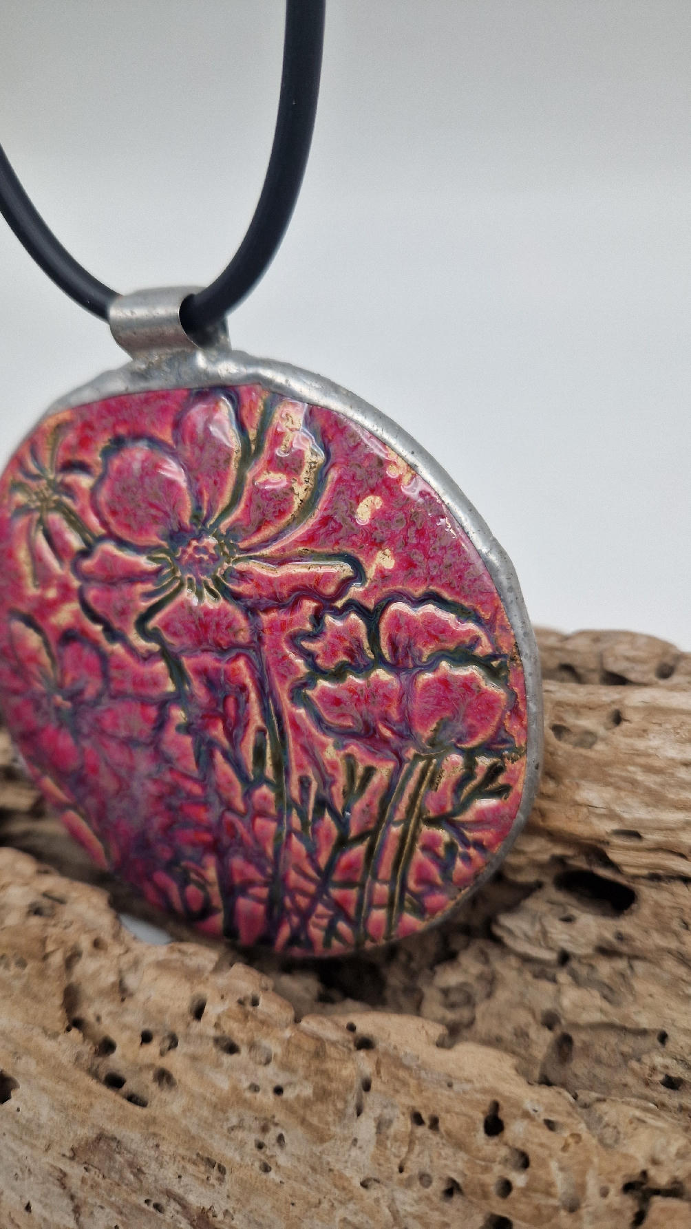 Cudny, ceramiczny, różowy, duży ( jak na wisiory inne) wisior w kwiaty, a właściwie mini rzeźba; maki na różowej łące… ceramika oprawiona w metal, która będzie piękną dekoracją Twojego dekoltu.