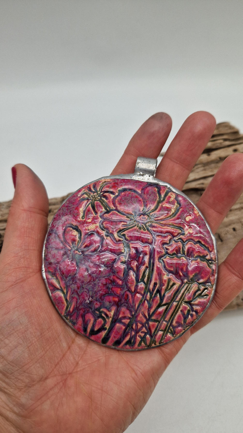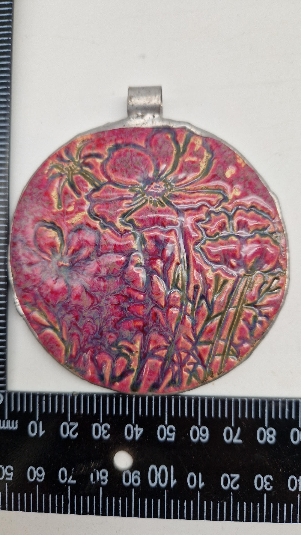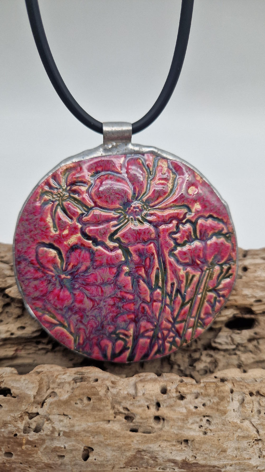 Cudny, ceramiczny, różowy, duży ( jak na wisiory inne) wisior w kwiaty, a właściwie mini rzeźba; maki na różowej łące… ceramika oprawiona w metal, która będzie piękną dekoracją Twojego dekoltu.