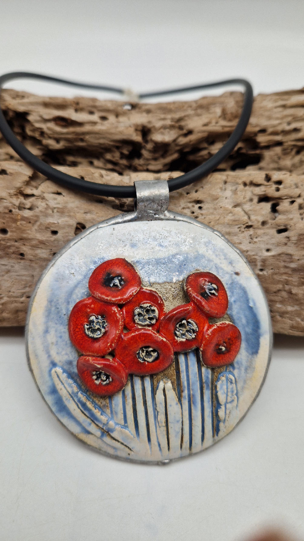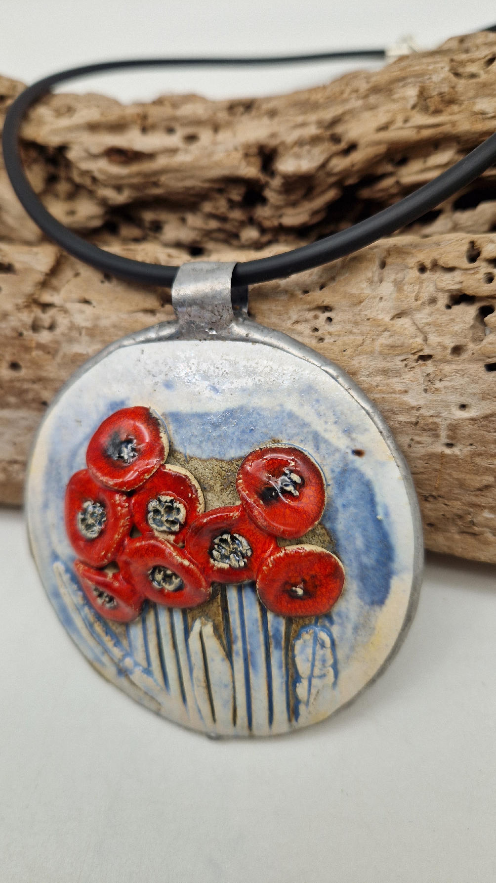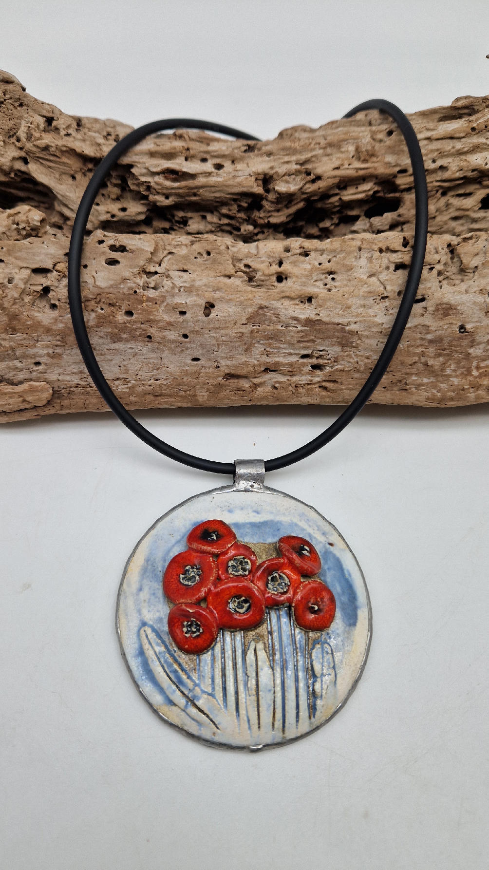 Śliczny ceramiczny, duży wisior zawieszony na kauczukowym rzemieniu. Kwiaty, ale takie niewiędnące i śliczne ,które będą cieszyć oczy niezmiennie przez długi czas..