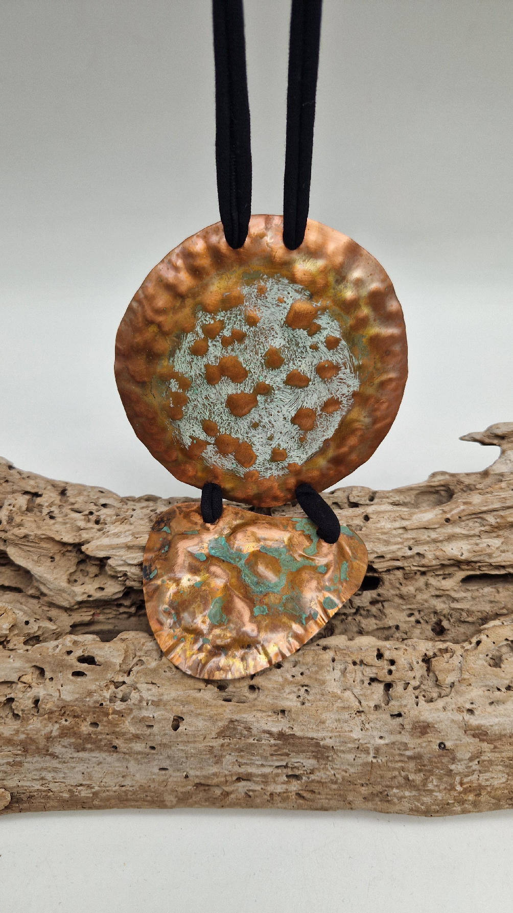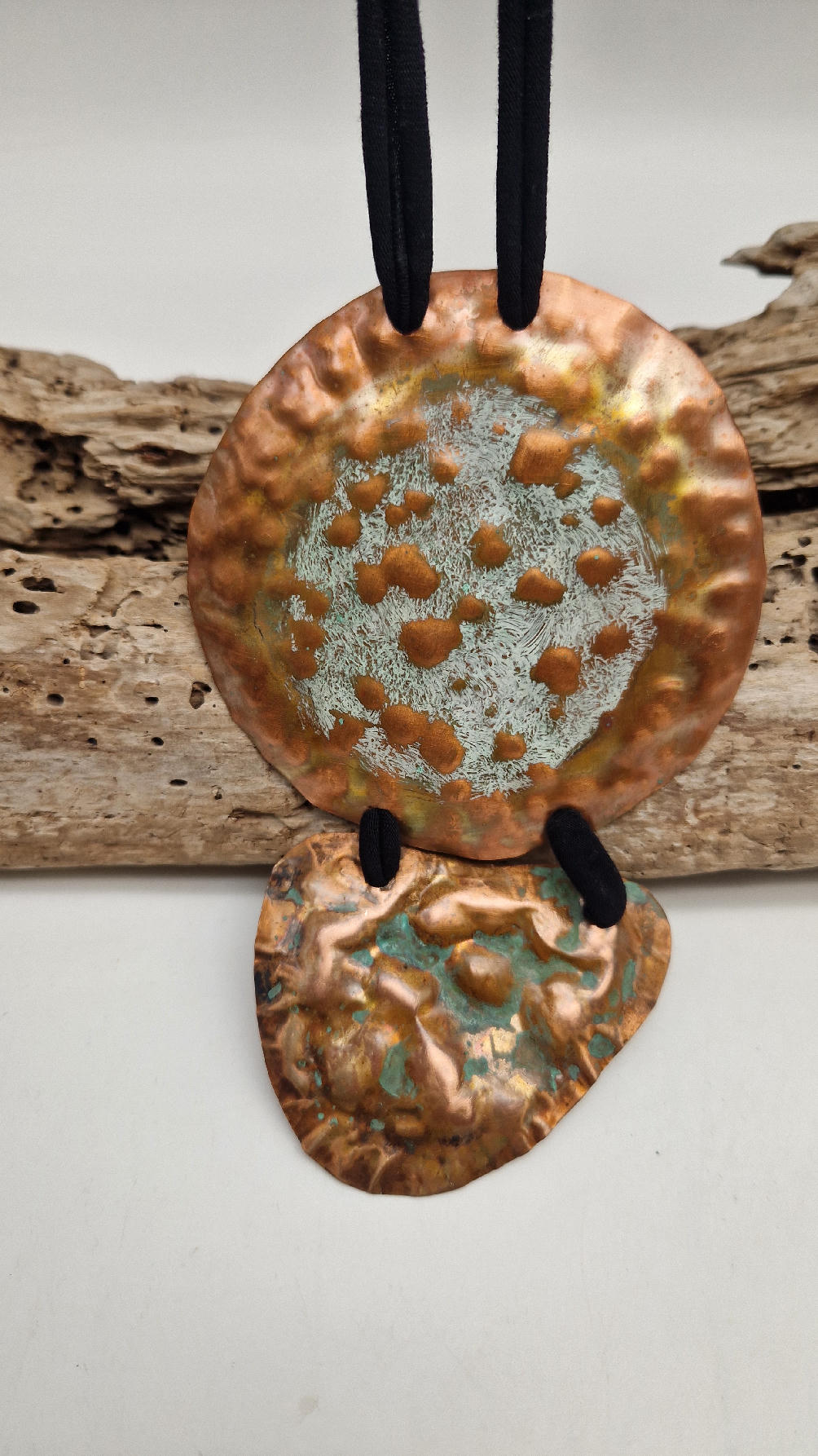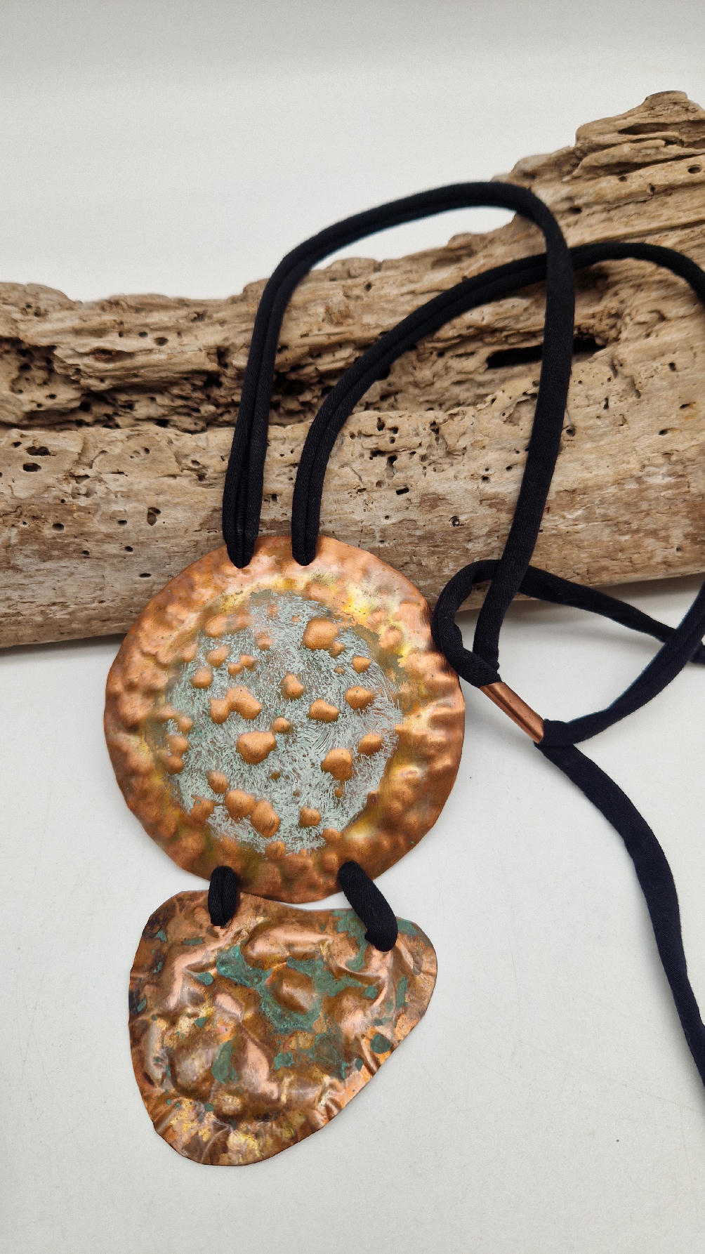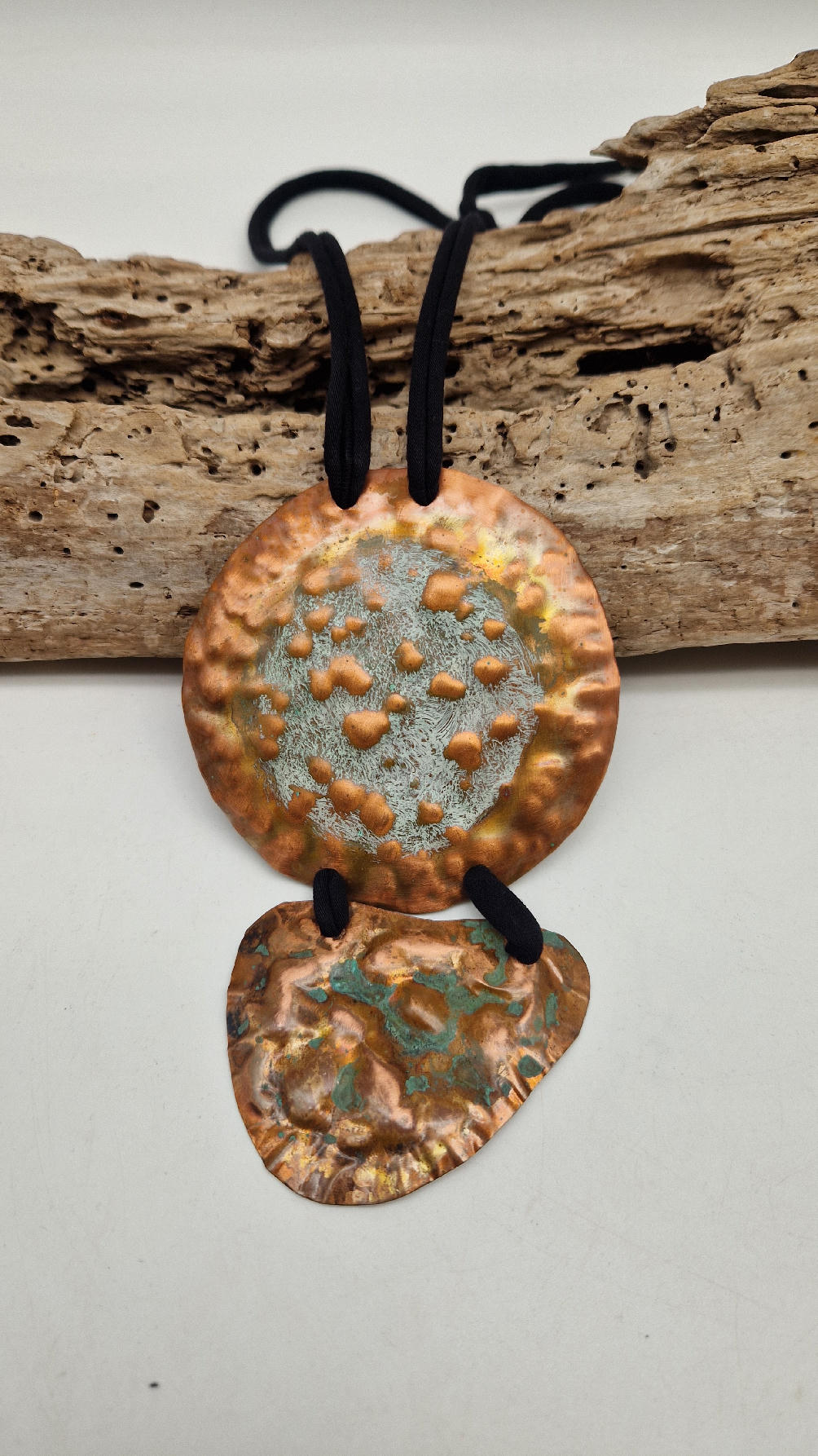 Duży, długi, dwuelementowy , kuty, patynowany, miedziany, ale jedna część patynowana na biało, druga zielono-szmaragdowa… przestrzenny, niepłaski wisior zawieszony na bawełnianej ,,obroży,, której długość możesz regulować, przy pomocy fajowej tutki…przepiękny!
