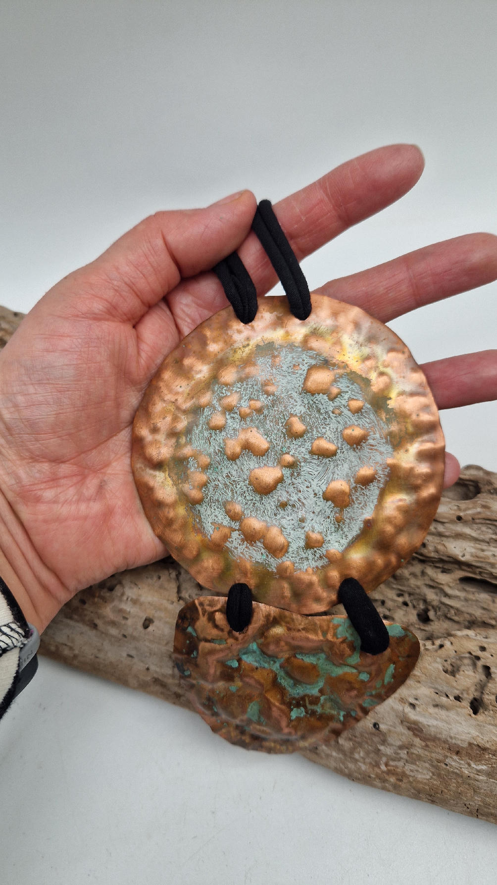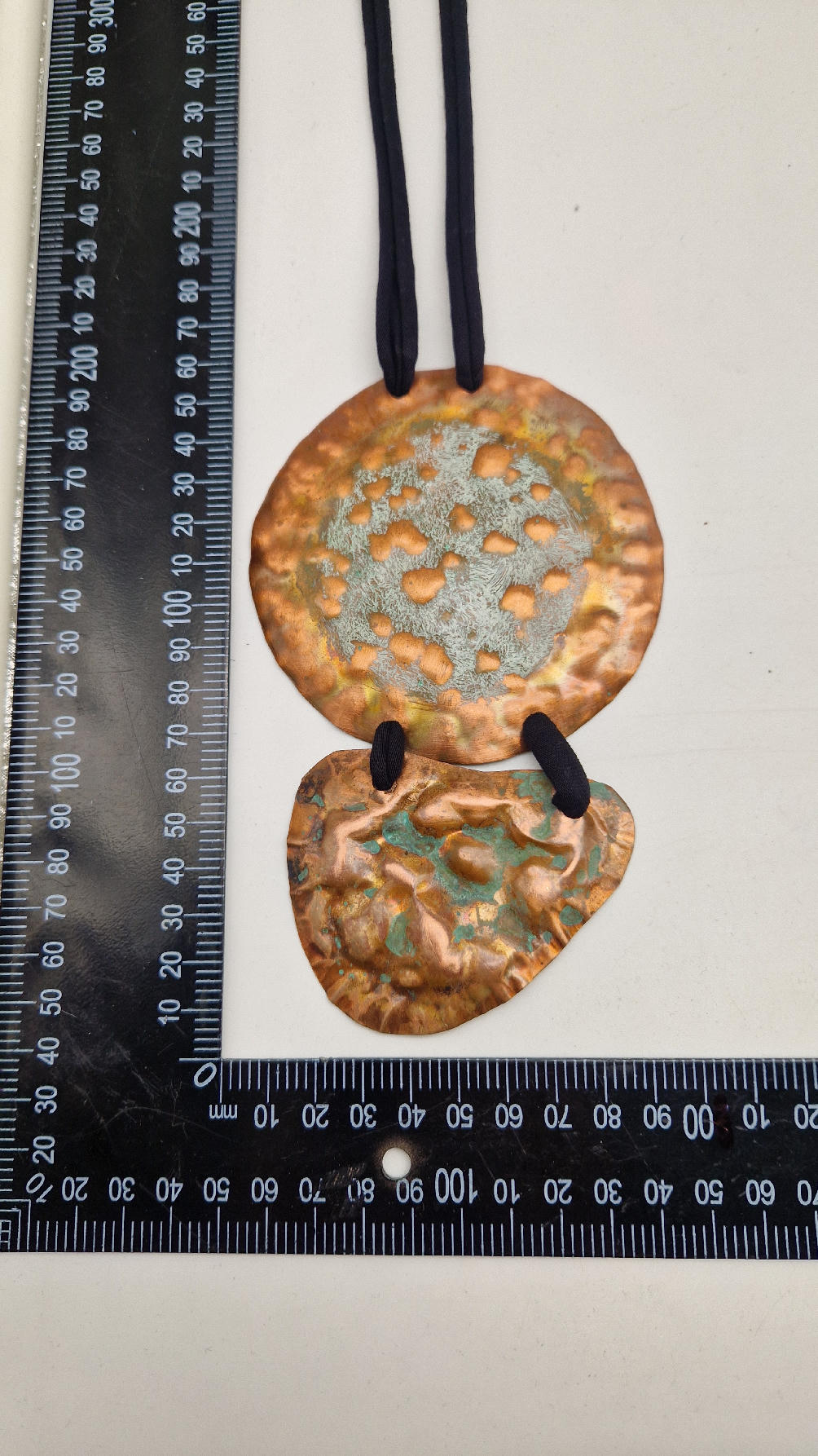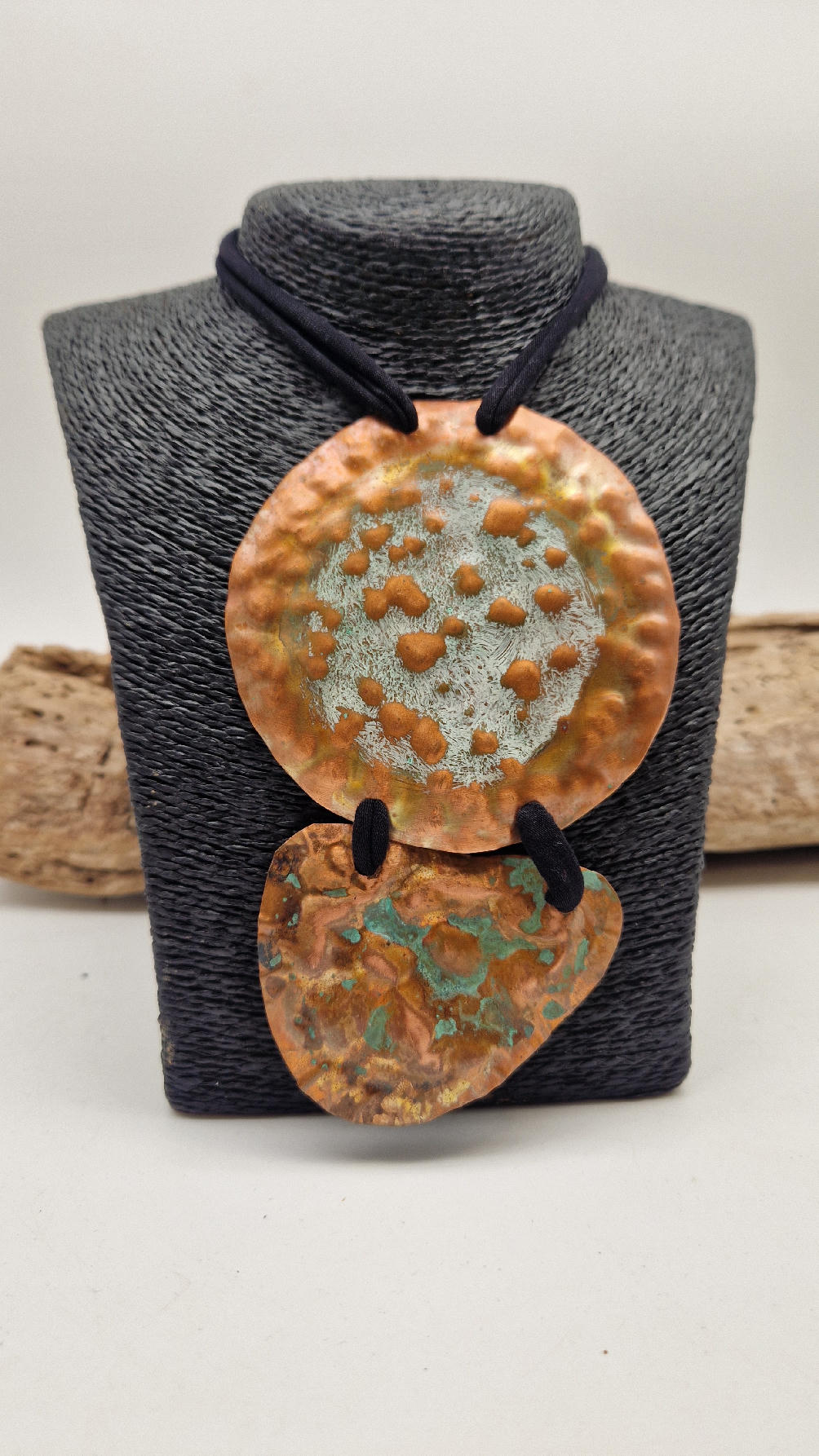 Duży, długi, dwuelementowy , kuty, patynowany, miedziany, ale jedna część patynowana na biało, druga zielono-szmaragdowa… przestrzenny, niepłaski wisior zawieszony na bawełnianej ,,obroży,, której długość możesz regulować, przy pomocy fajowej tutki…przepiękny!