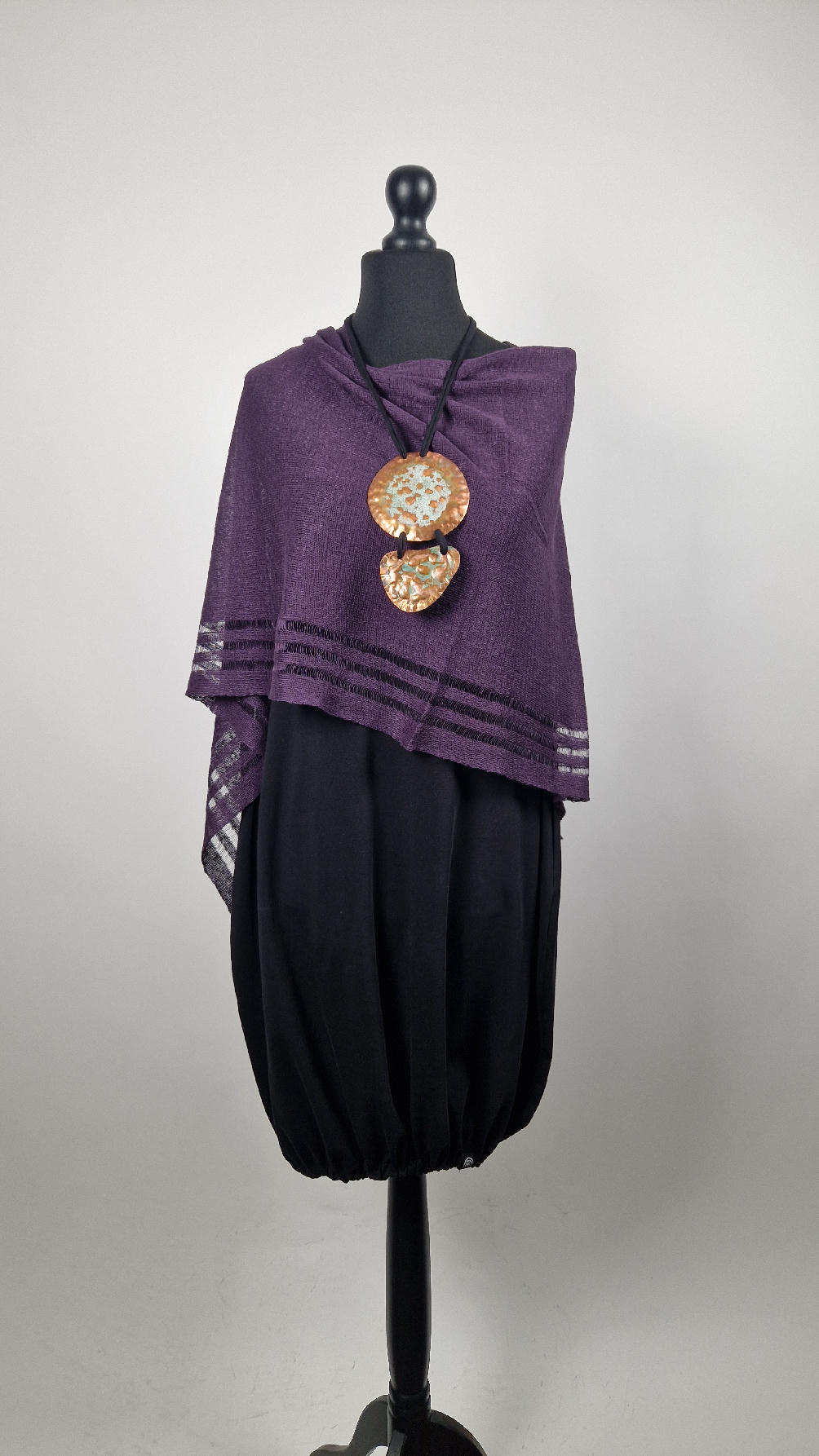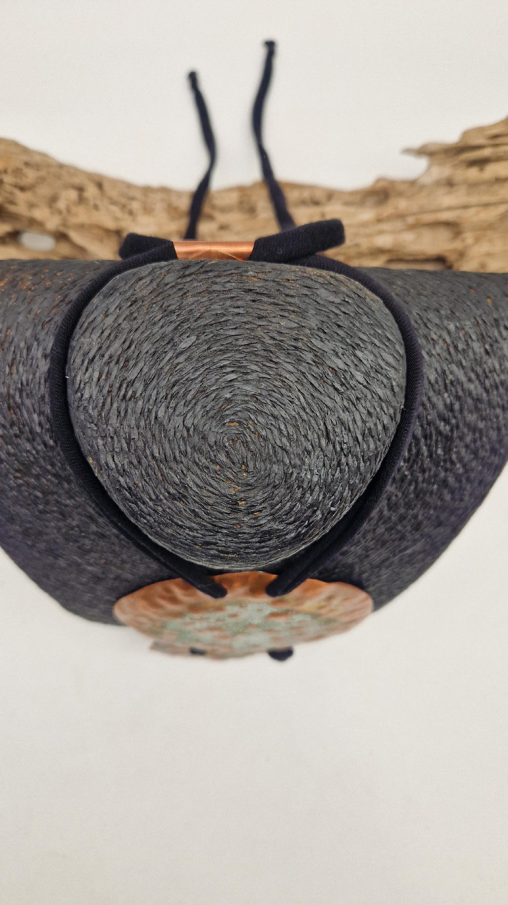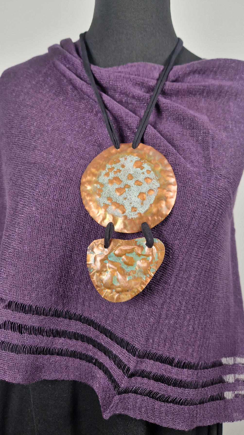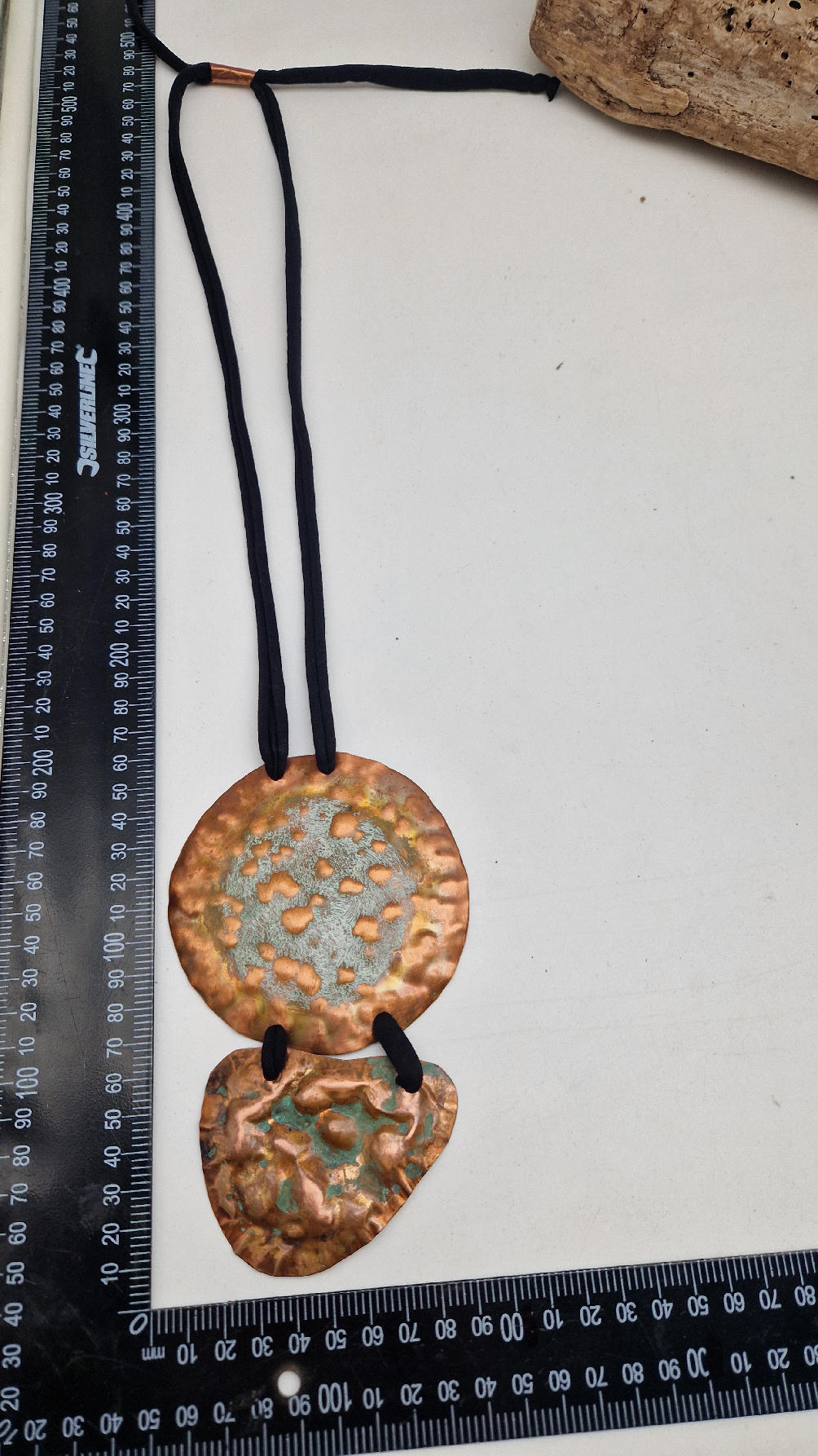 Duży, długi, dwuelementowy , kuty, patynowany, miedziany, ale jedna część patynowana na biało, druga zielono-szmaragdowa… przestrzenny, niepłaski wisior zawieszony na bawełnianej ,,obroży,, której długość możesz regulować, przy pomocy fajowej tutki…przepiękny!
