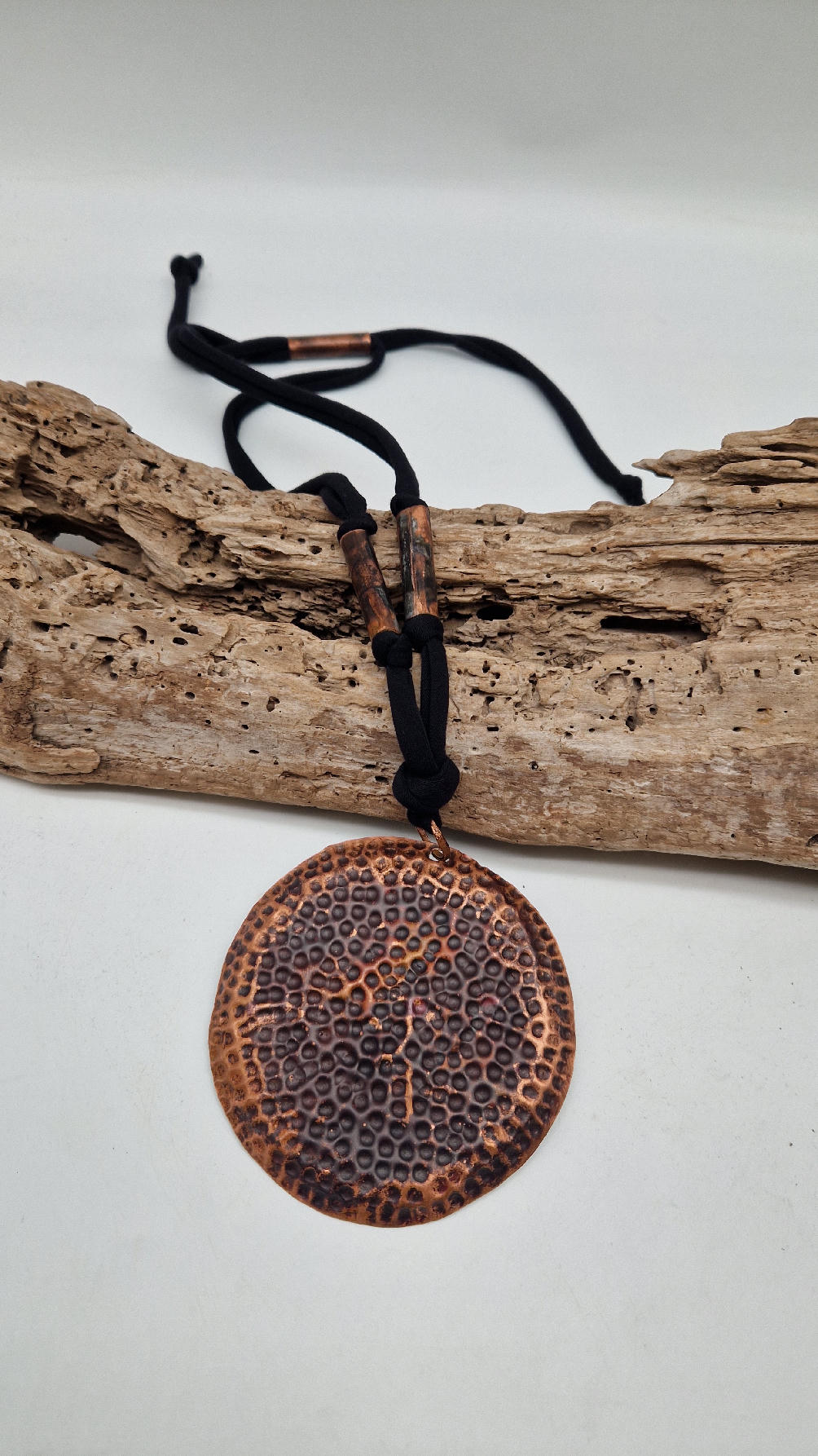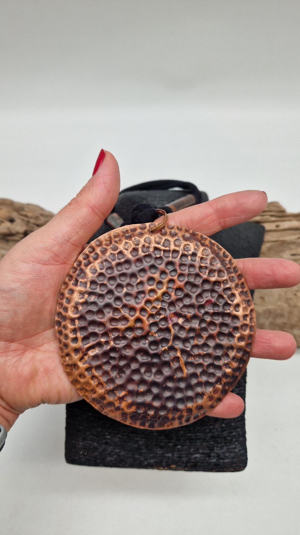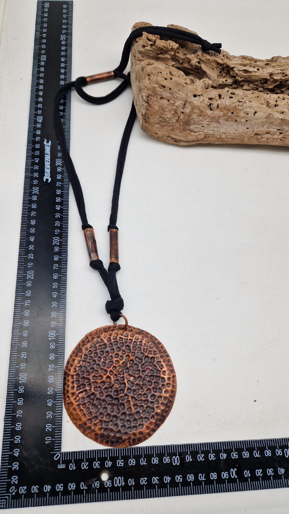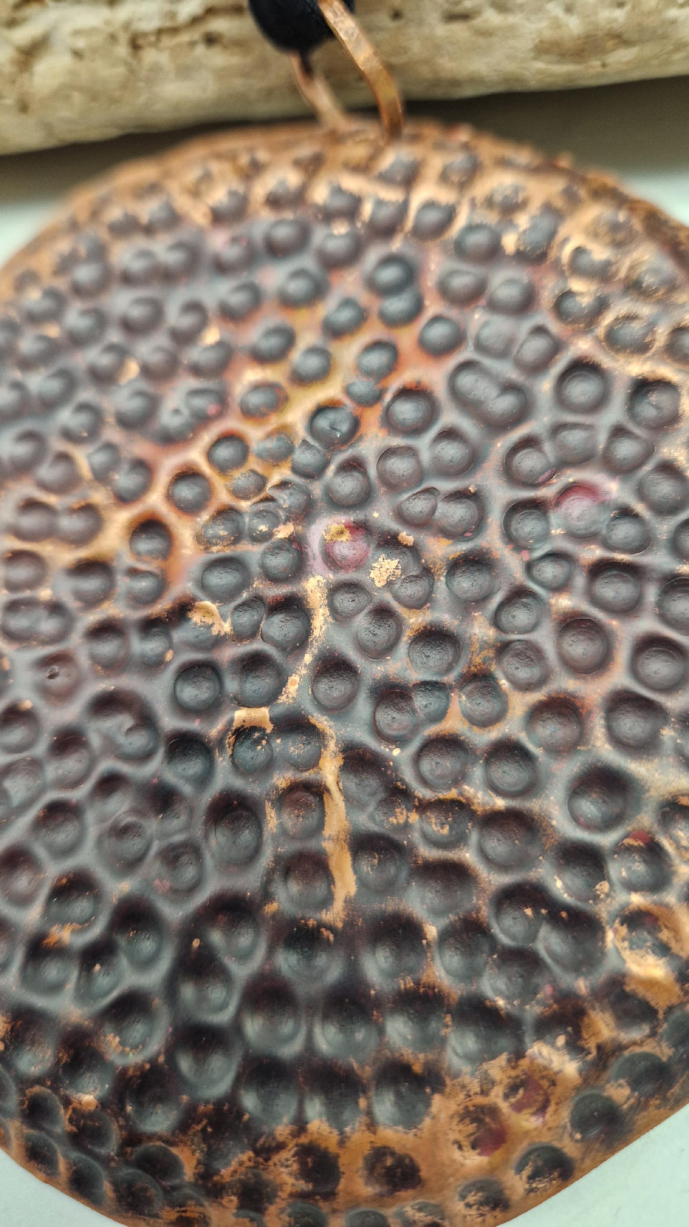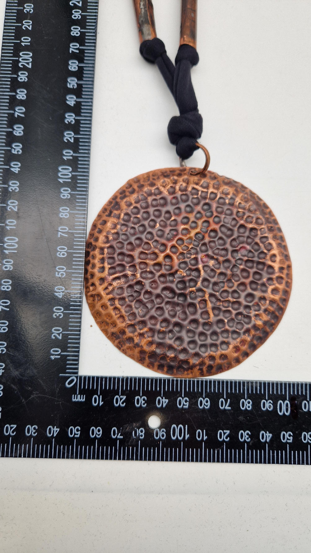 Wyjątkowy…piękny, duży, bo przecież kochamy duże wisiory….wykonany z miedzi, okrągły, kuty, patynowany, wypukły, cudny wisior zawieszony na bawełnianych sznurkach, które możesz łatwo regulować przy pomocy tutki, która jest na karku.