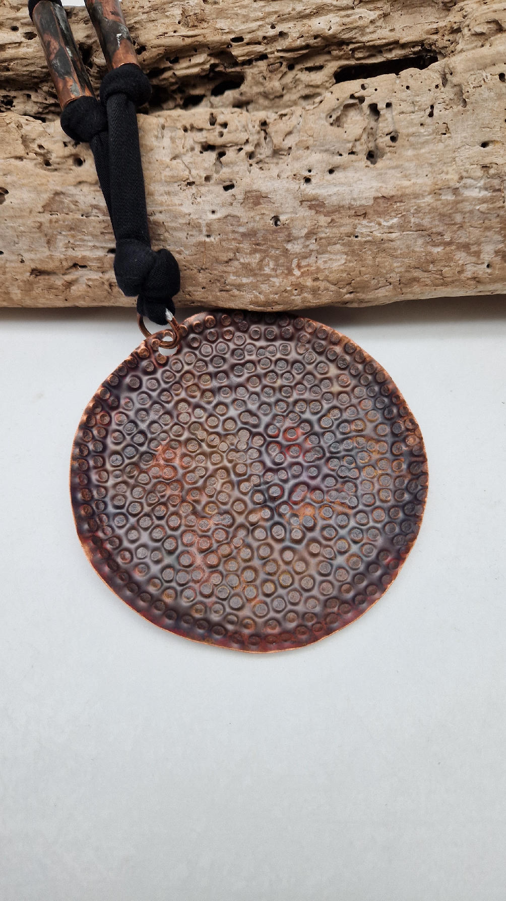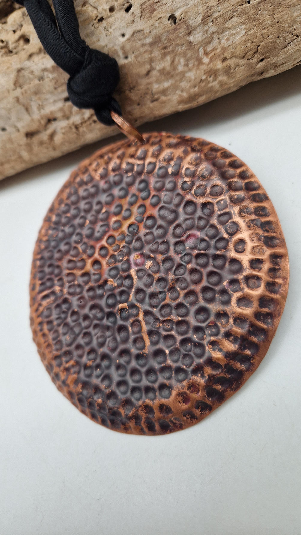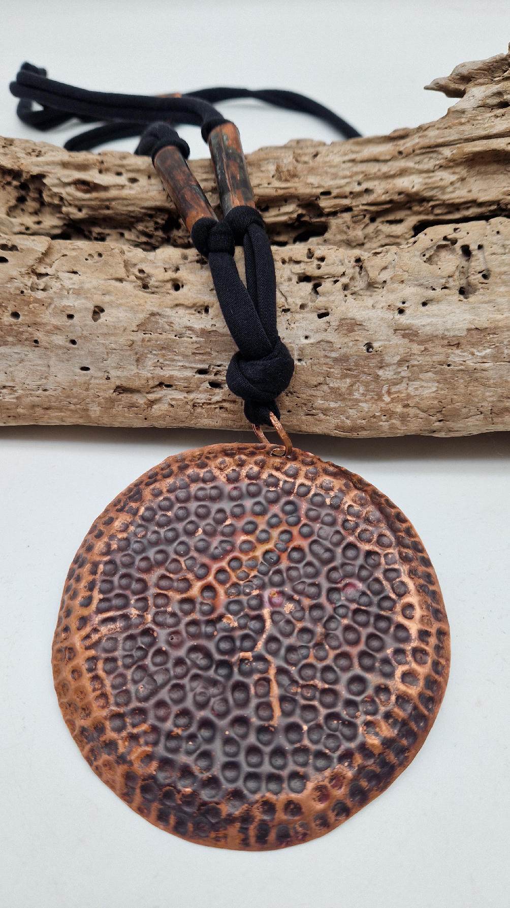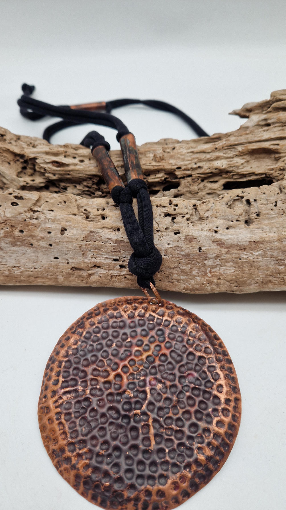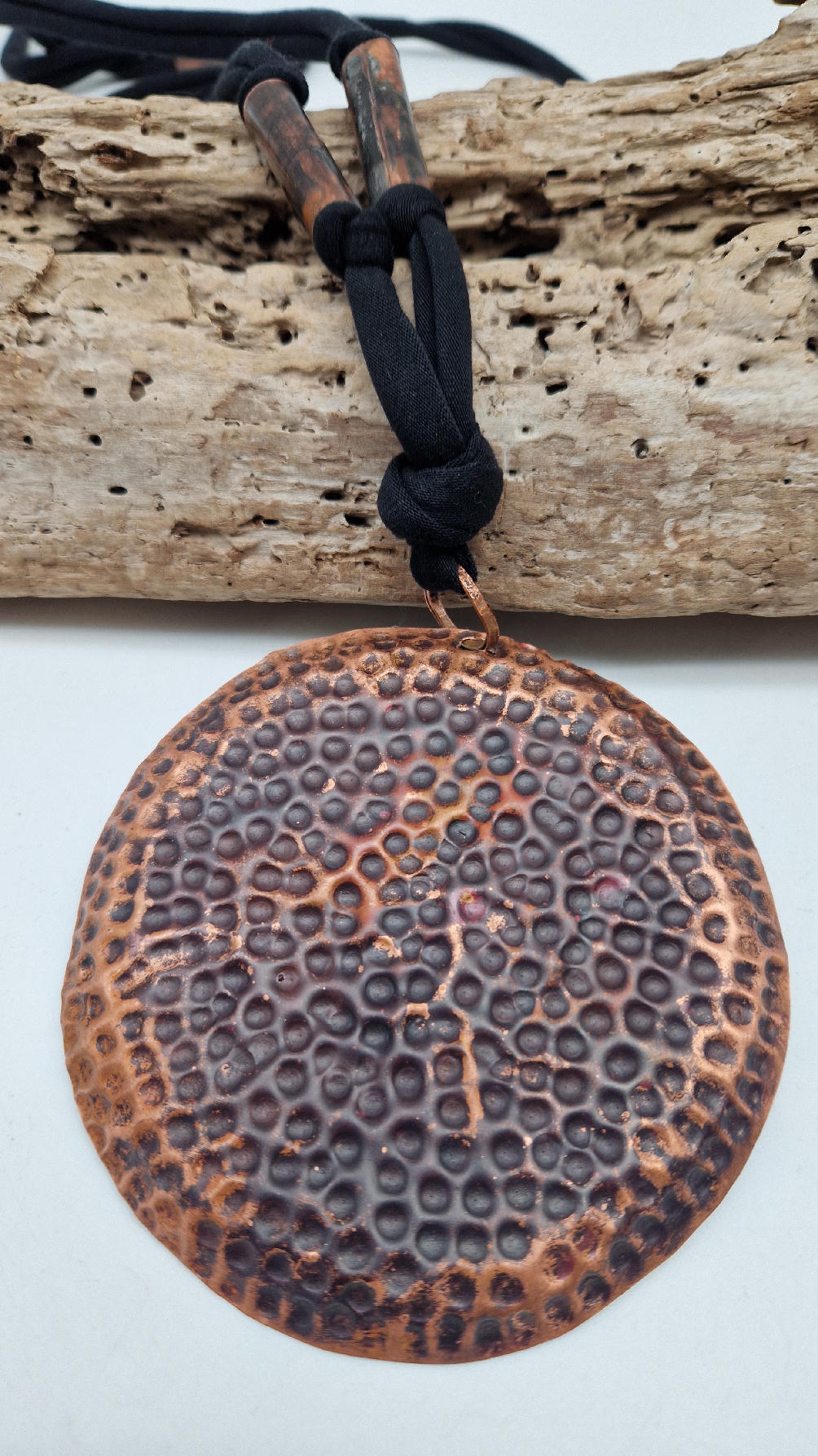 Wyjątkowy…piękny, duży, bo przecież kochamy duże wisiory….wykonany z miedzi, okrągły, kuty, patynowany, wypukły, cudny wisior zawieszony na bawełnianych sznurkach, które możesz łatwo regulować przy pomocy tutki, która jest na karku.