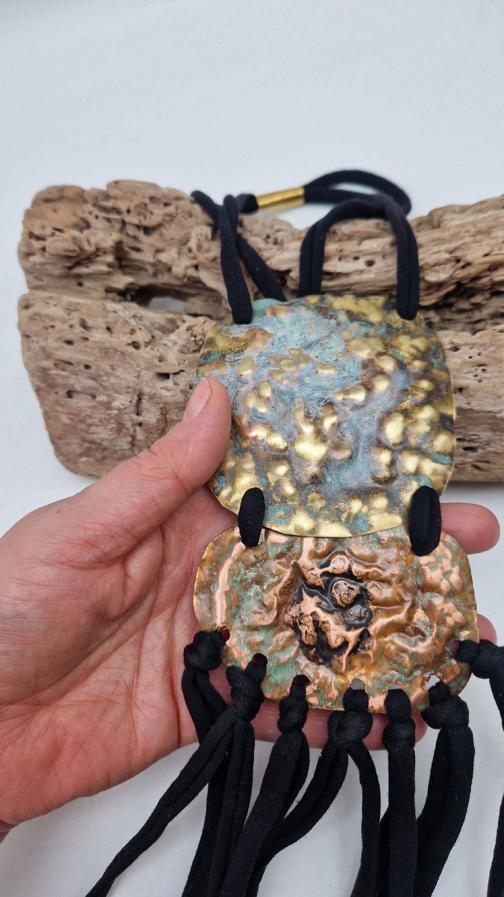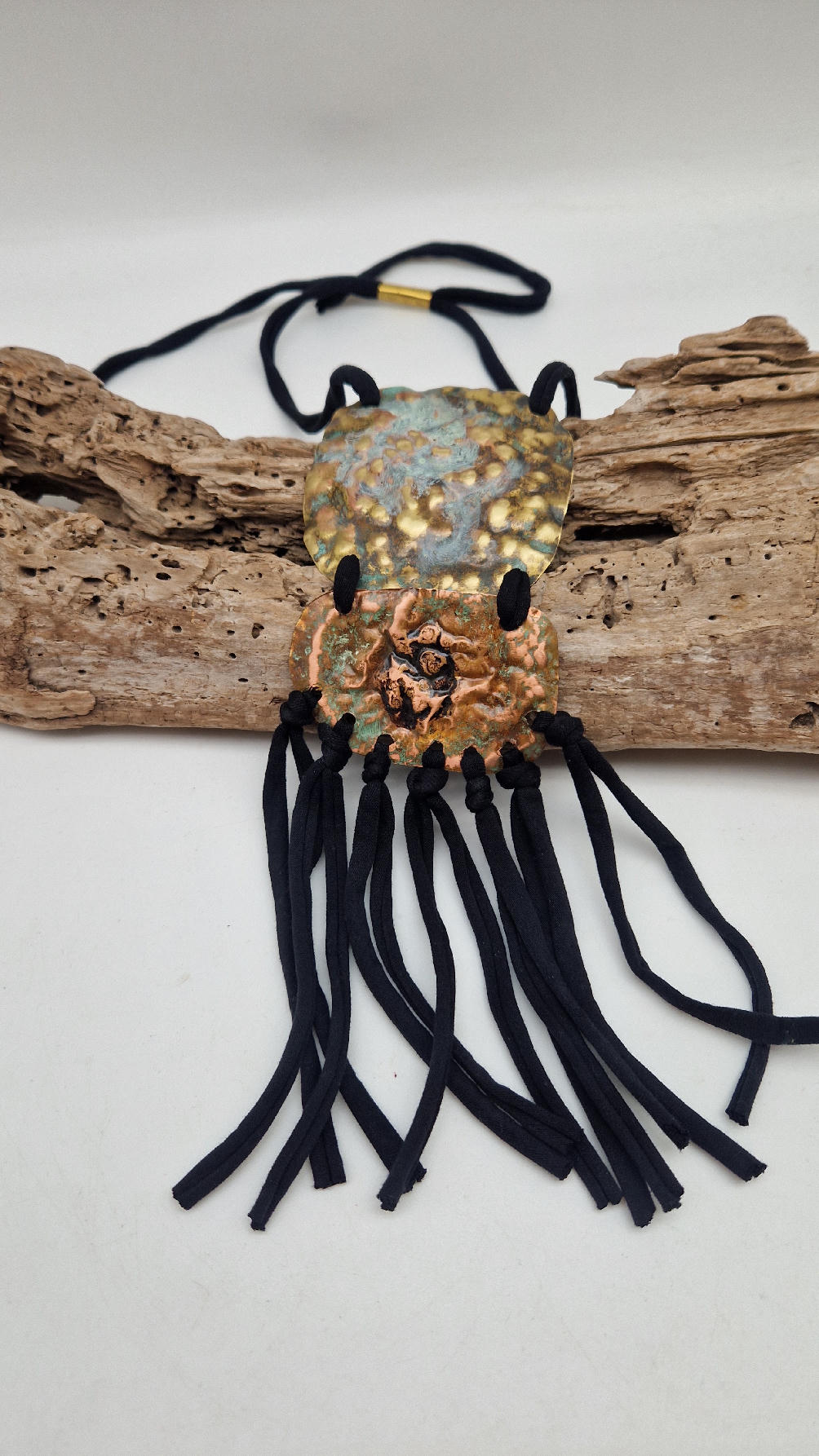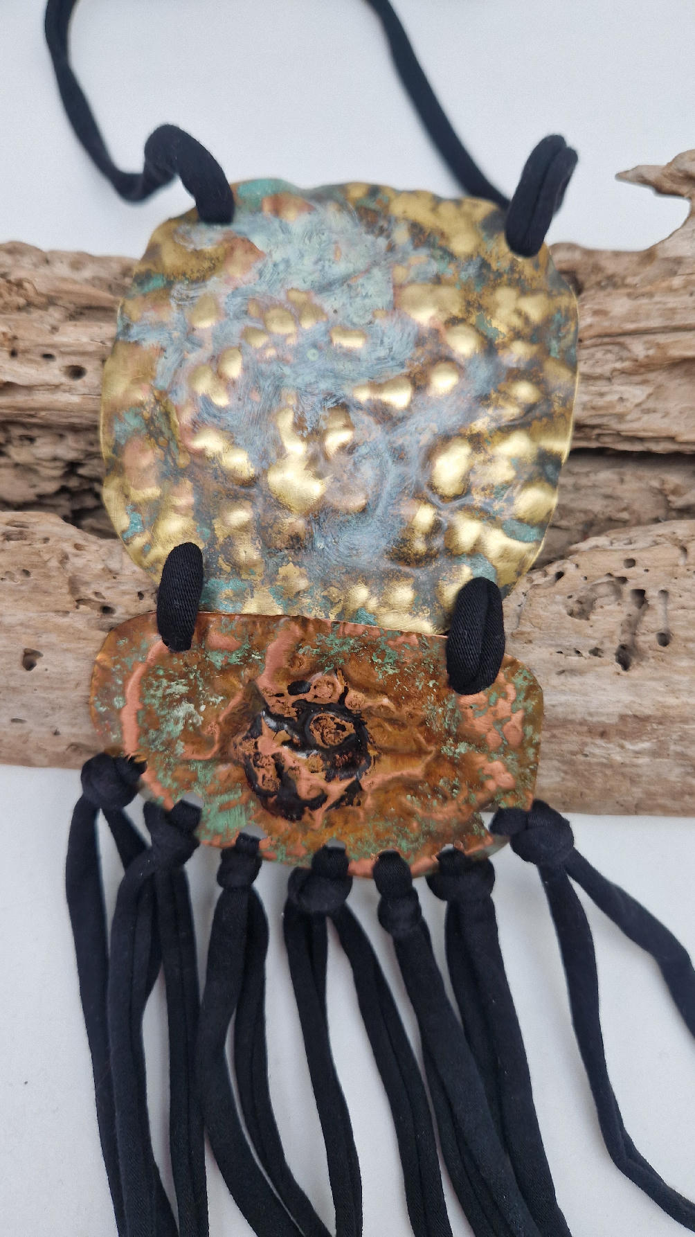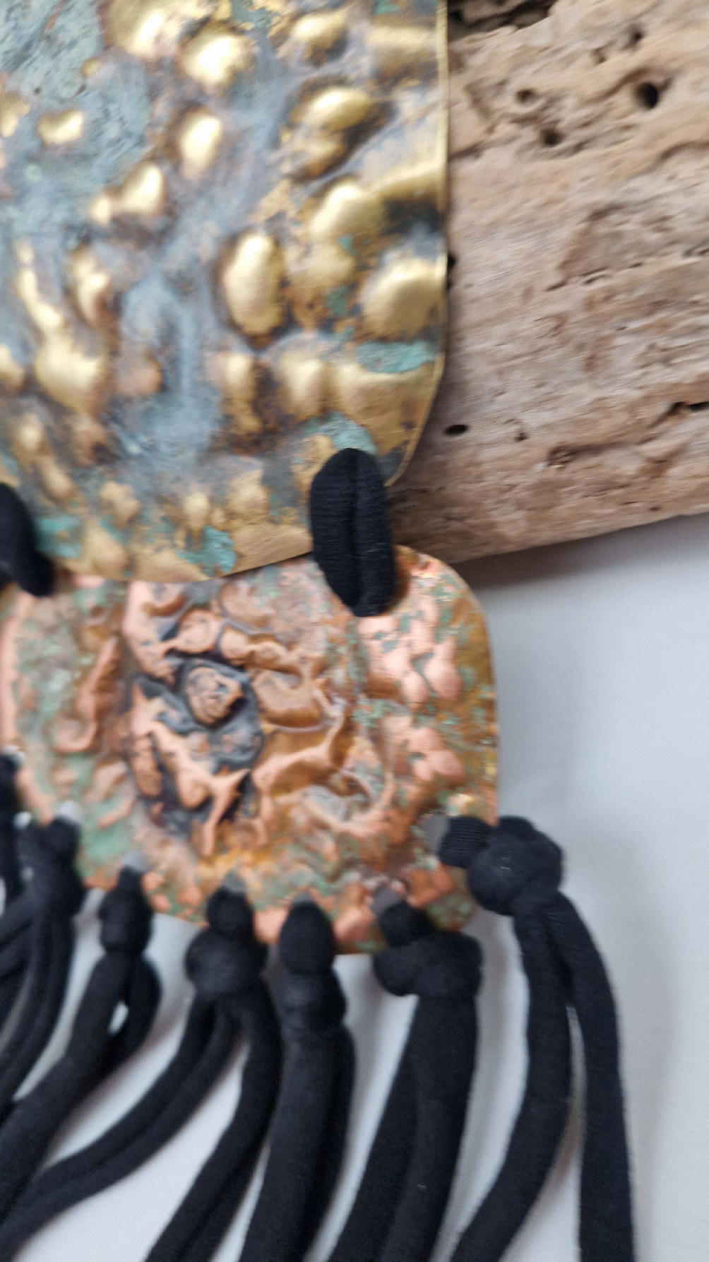Duży, długi, dwuelementowy, kuty, patynowany, mosiężno-miedziany wisior, z długimi, bawełnianymi wąsami na dole, które świetnie wydłużają sylwetkę górna część jest z mosiądzu, dolna z miedzi…. przestrzenny, niepłaski wisior zawieszony na bawełnianej ,,obroży,, której długość możesz regulować, przy pomocy fajowej tutki…przepiękny!