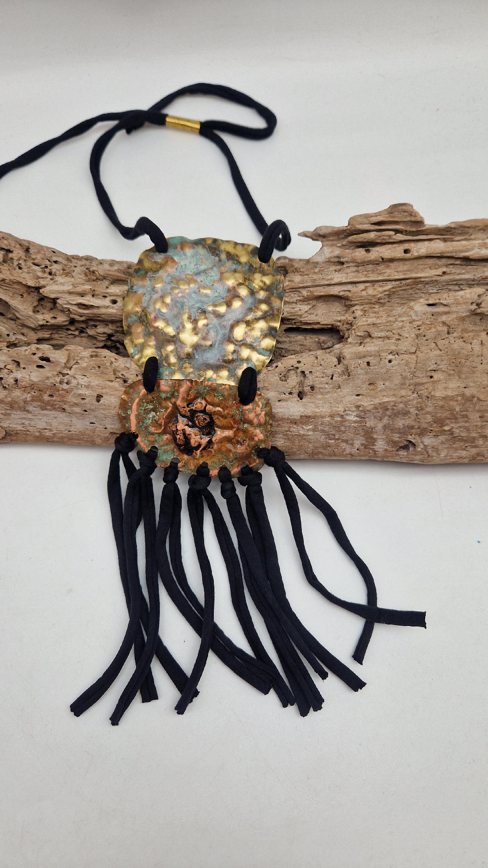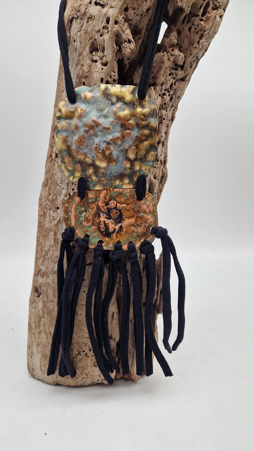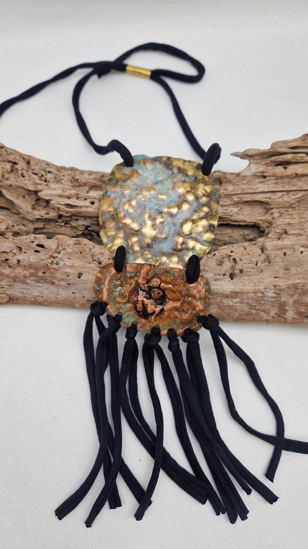 Duży, długi, dwuelementowy, kuty, patynowany, mosiężno-miedziany wisior, z długimi, bawełnianymi wąsami na dole, które świetnie wydłużają sylwetkę górna część jest z mosiądzu, dolna z miedzi…. przestrzenny, niepłaski wisior zawieszony na bawełnianej ,,obroży,, której długość możesz regulować, przy pomocy fajowej tutki…przepiękny!
