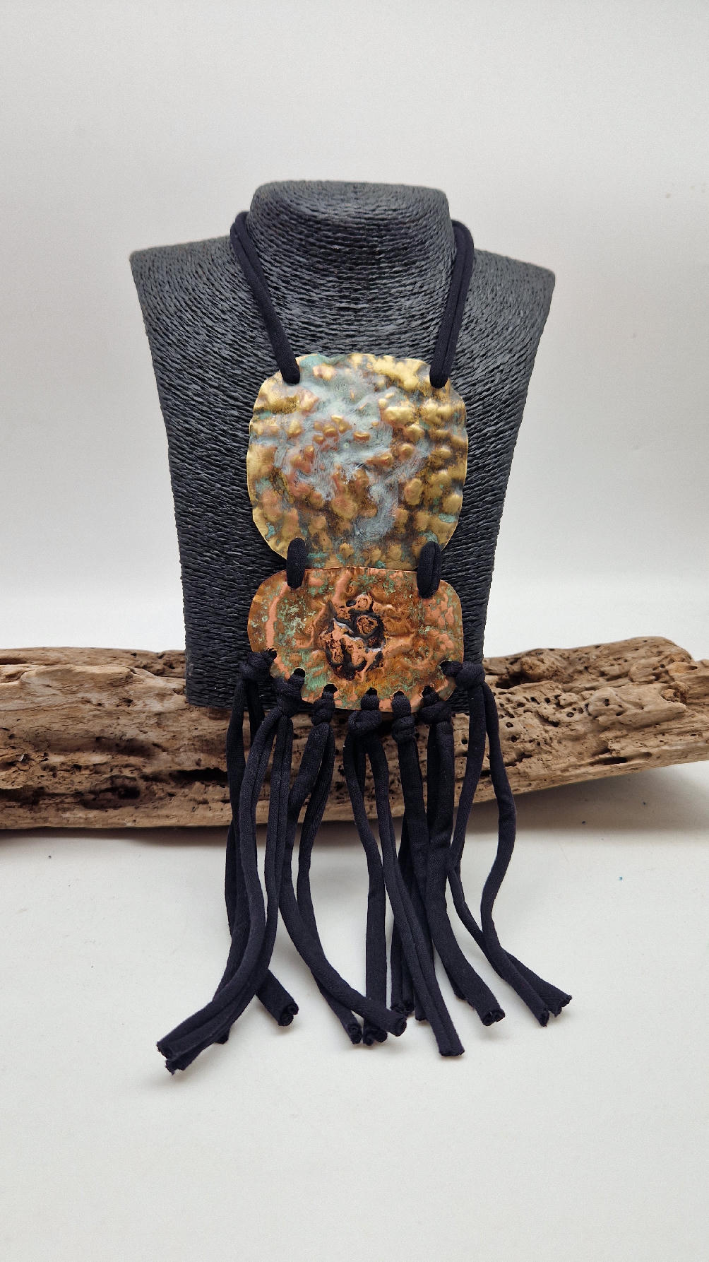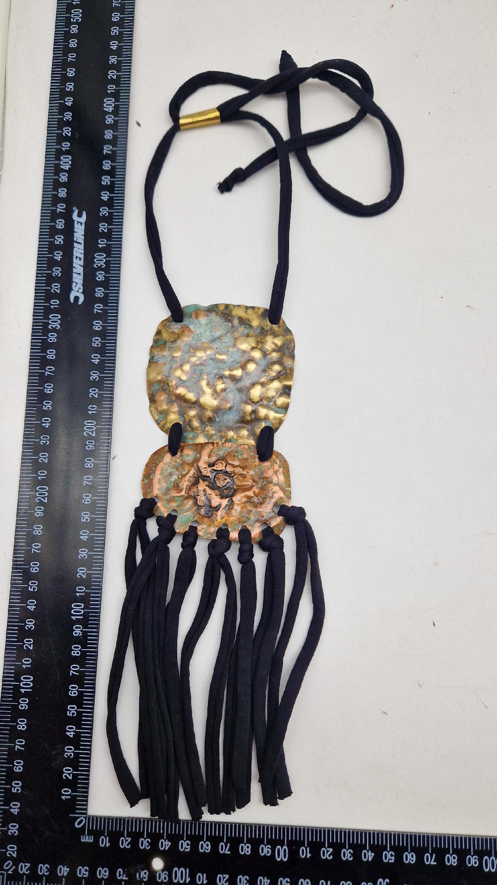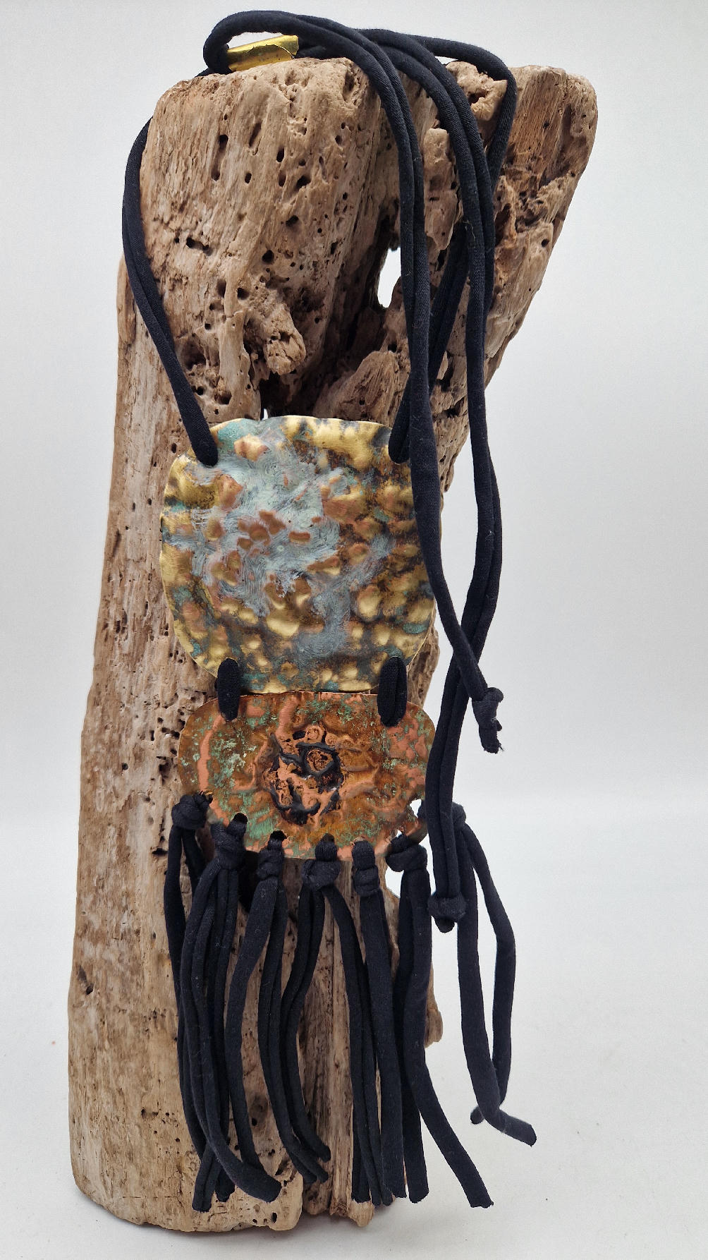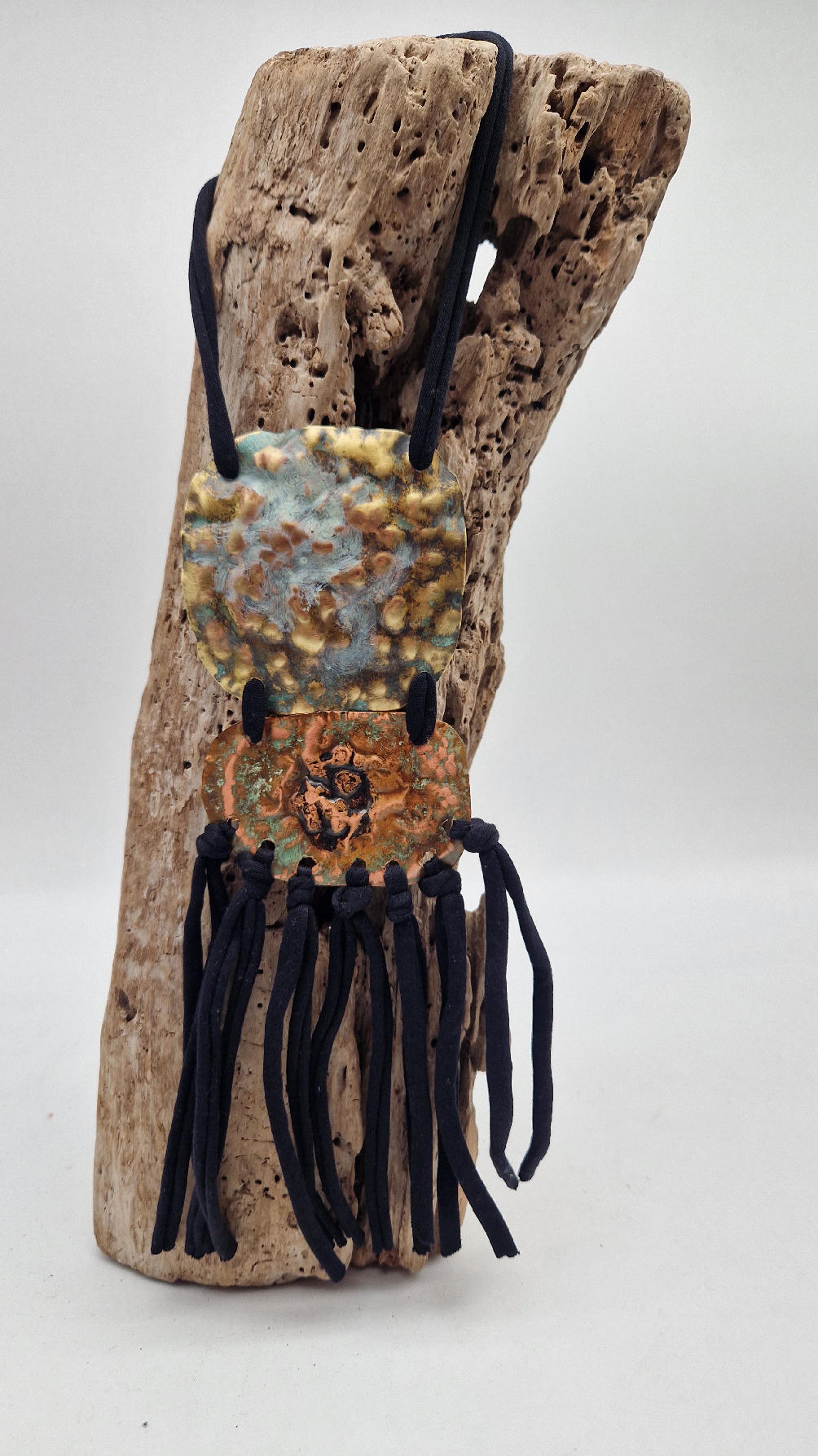 Duży, długi, dwuelementowy, kuty, patynowany, mosiężno-miedziany wisior, z długimi, bawełnianymi wąsami na dole, które świetnie wydłużają sylwetkę górna część jest z mosiądzu, dolna z miedzi…. przestrzenny, niepłaski wisior zawieszony na bawełnianej ,,obroży,, której długość możesz regulować, przy pomocy fajowej tutki…przepiękny!