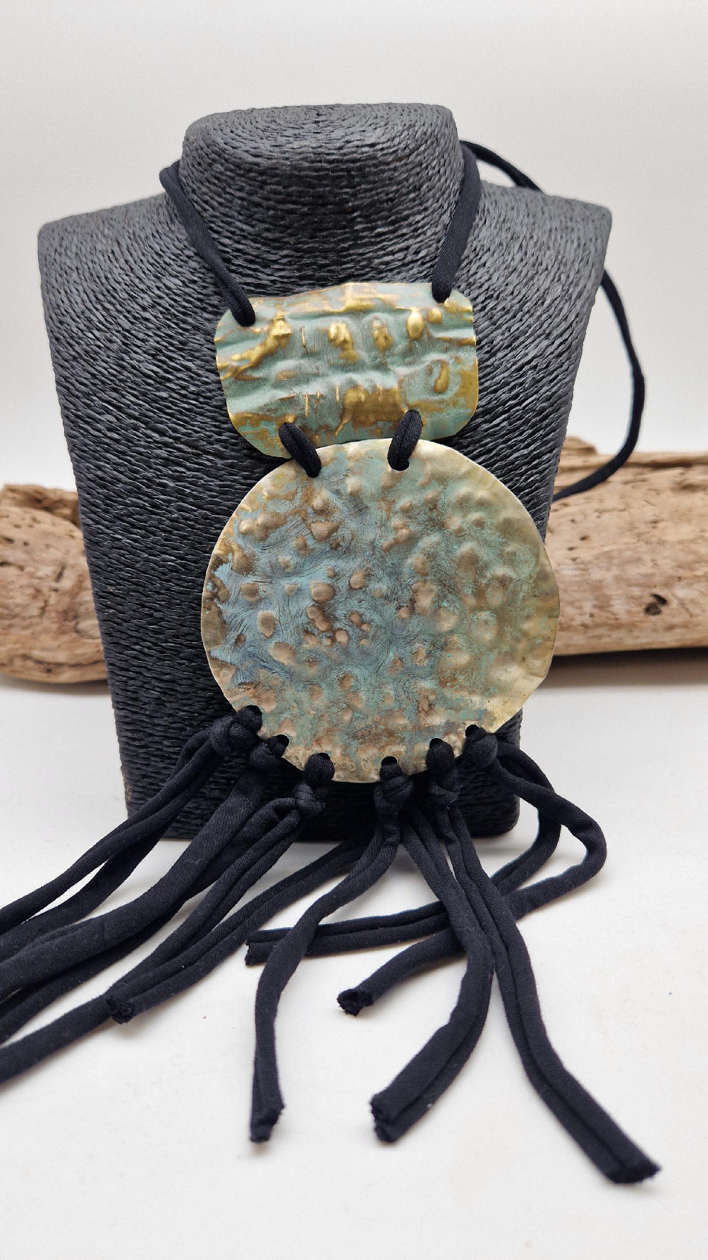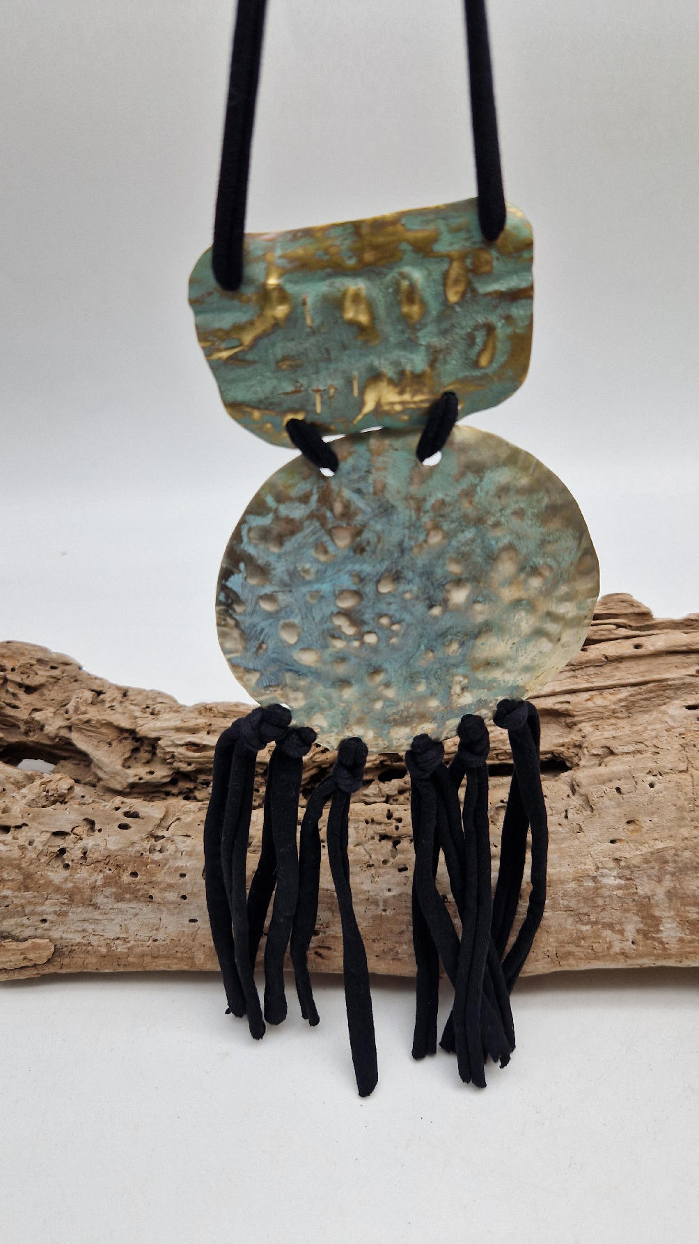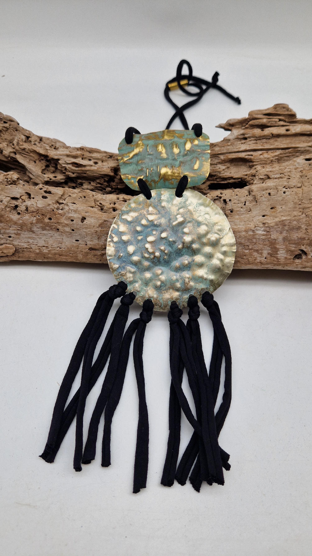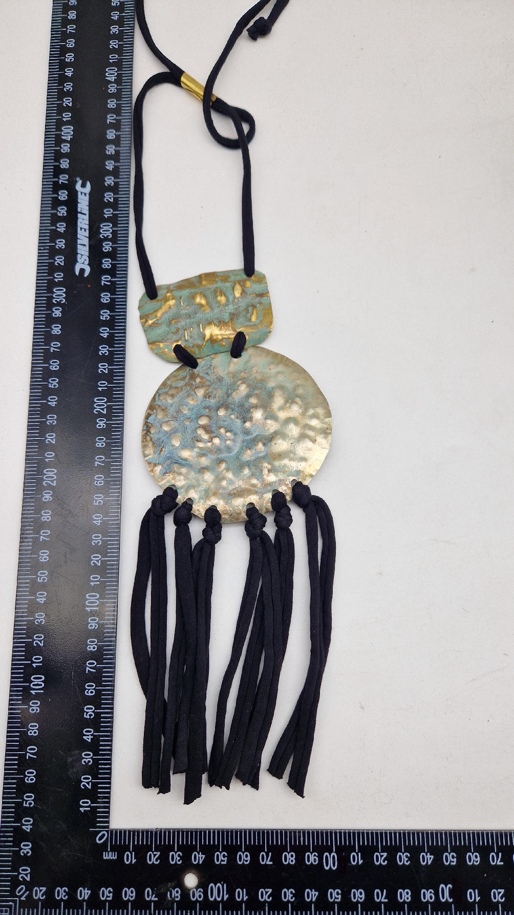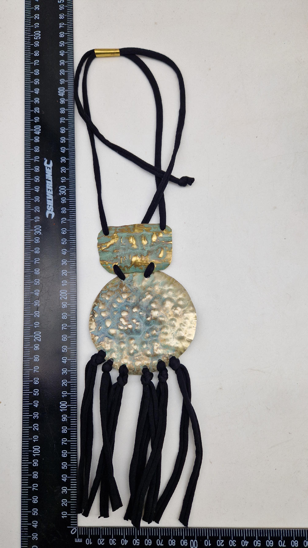 Duży, długi, dwuelementowy, kuty, patynowany, mosiężno-alpakowy wisior, z długimi, bawełnianymi wąsami na dole, które świetnie wydłużają sylwetkę górna część jest z mosiądzu, dolna z alpaki….złoto-srebrno-szmaragdowy… przestrzenny, niepłaski wisior zawieszony na bawełnianej ,,obroży,, której długość możesz regulować, przy pomocy fajowej tutki…przepiękny!