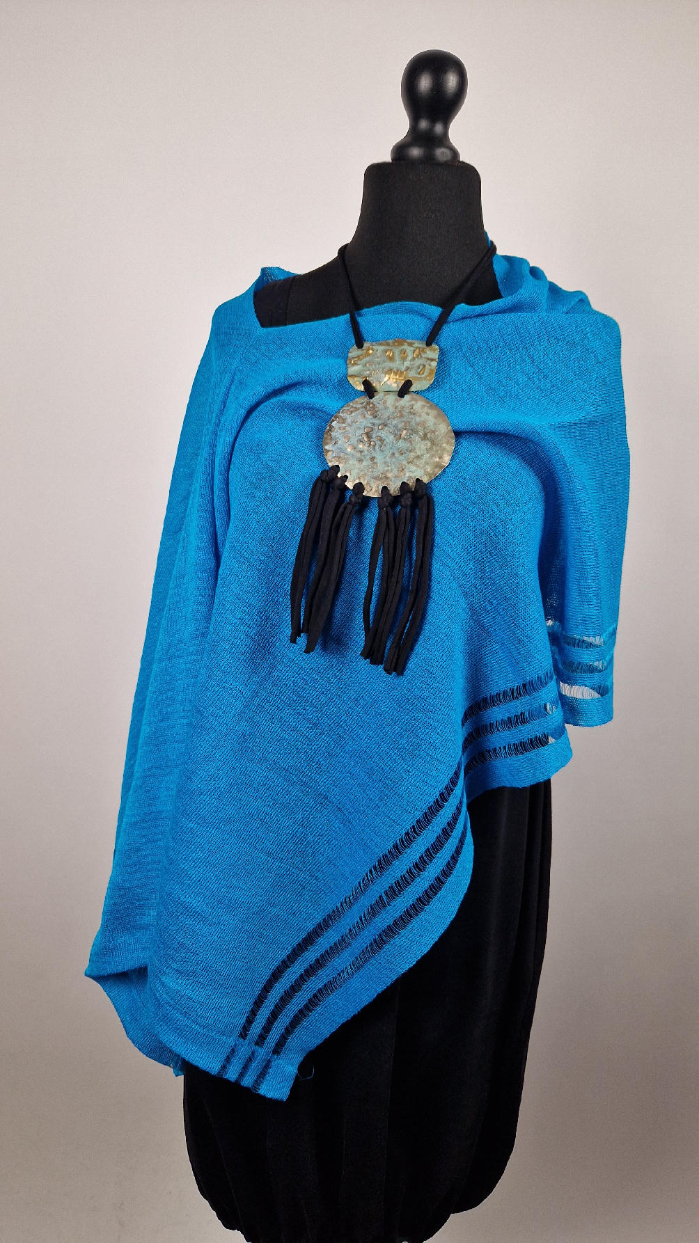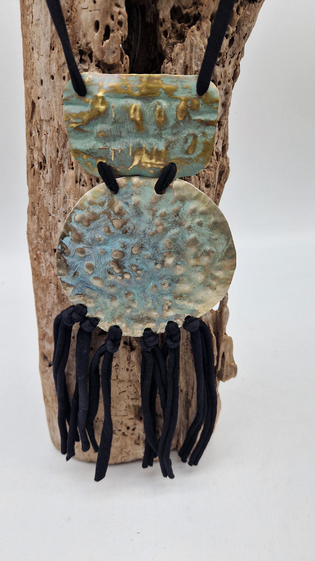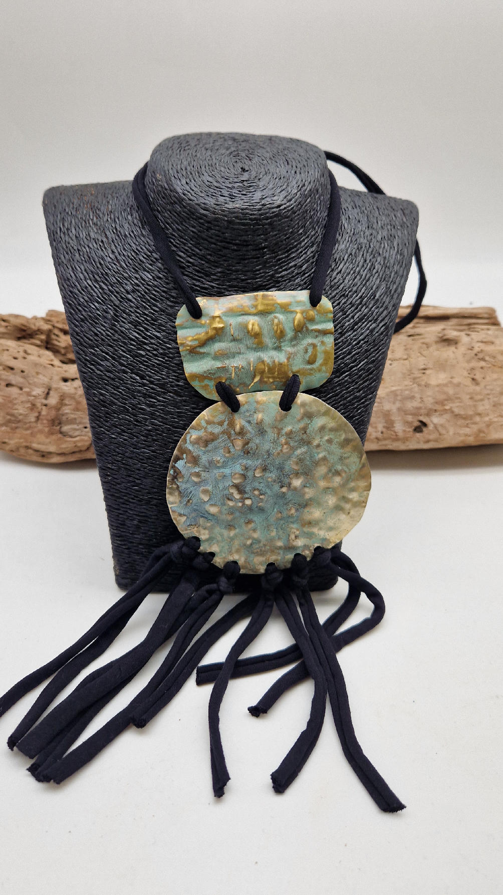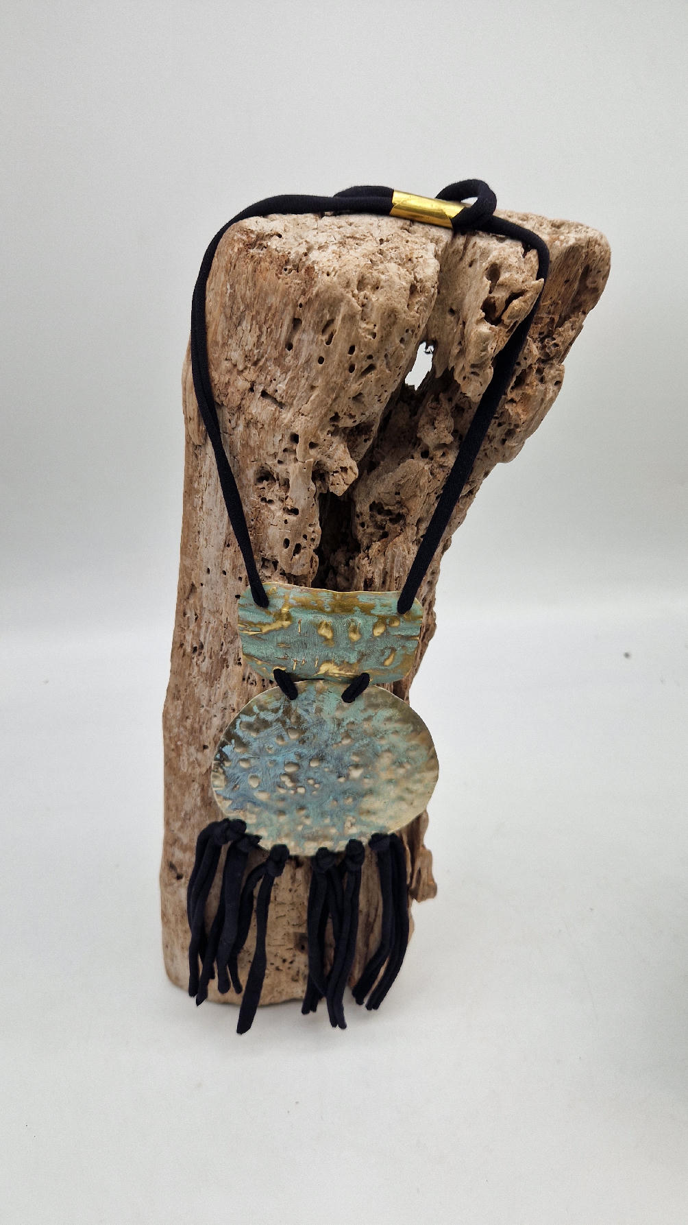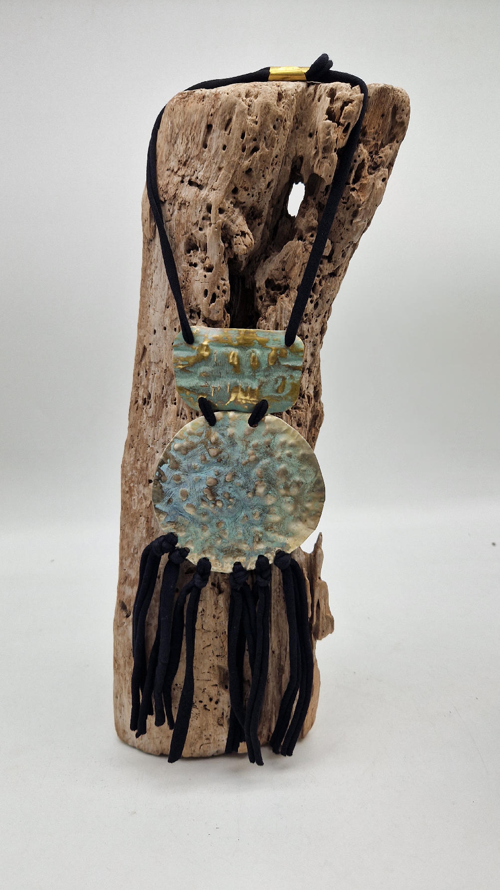 Duży, długi, dwuelementowy, kuty, patynowany, mosiężno-alpakowy wisior, z długimi, bawełnianymi wąsami na dole, które świetnie wydłużają sylwetkę górna część jest z mosiądzu, dolna z alpaki….złoto-srebrno-szmaragdowy… przestrzenny, niepłaski wisior zawieszony na bawełnianej ,,obroży,, której długość możesz regulować, przy pomocy fajowej tutki…przepiękny!