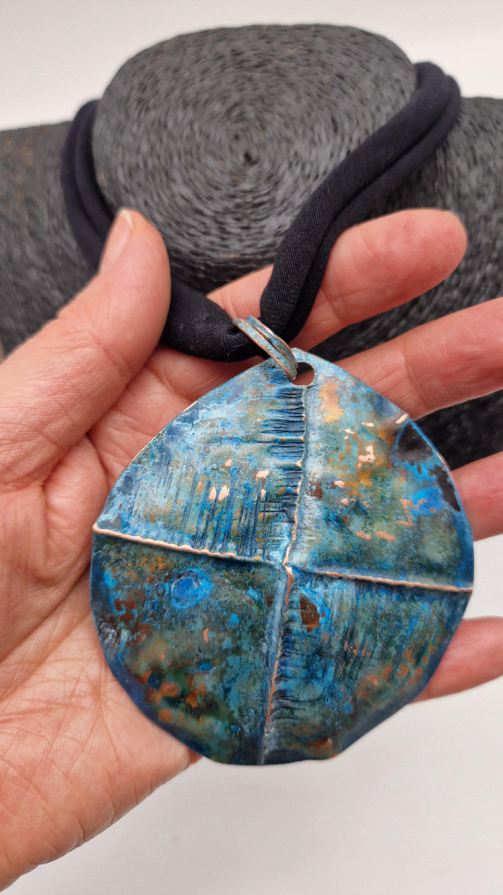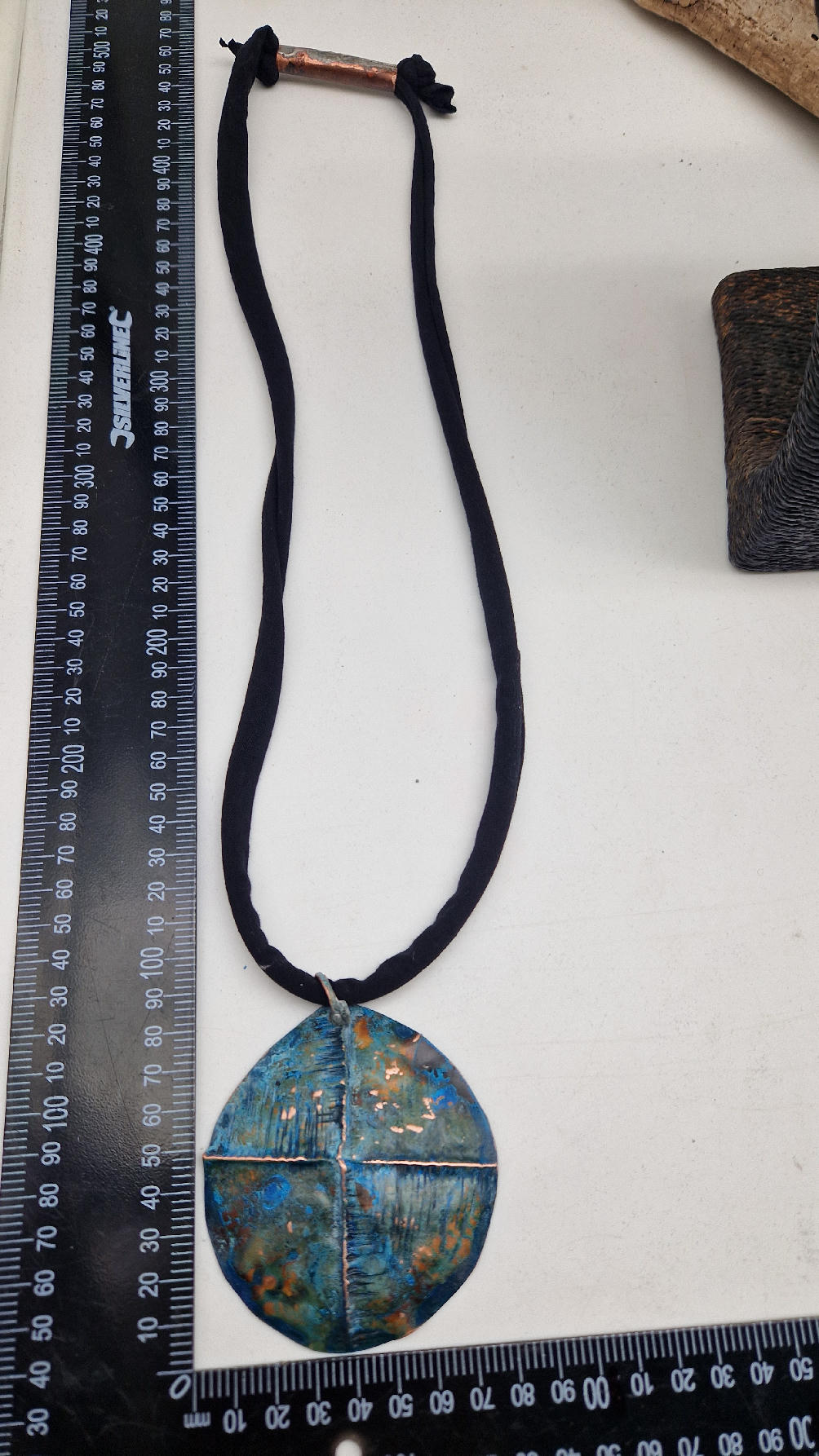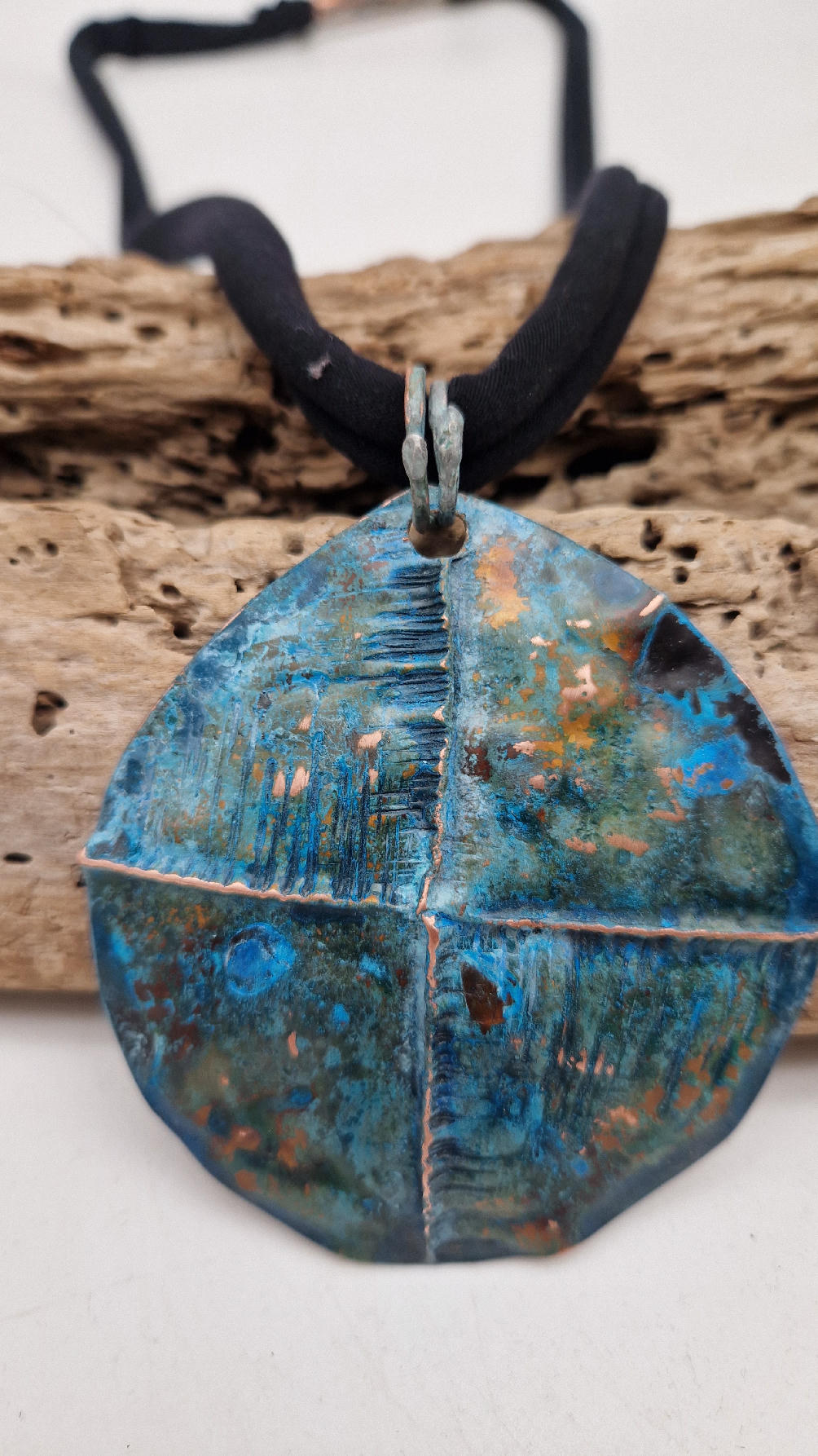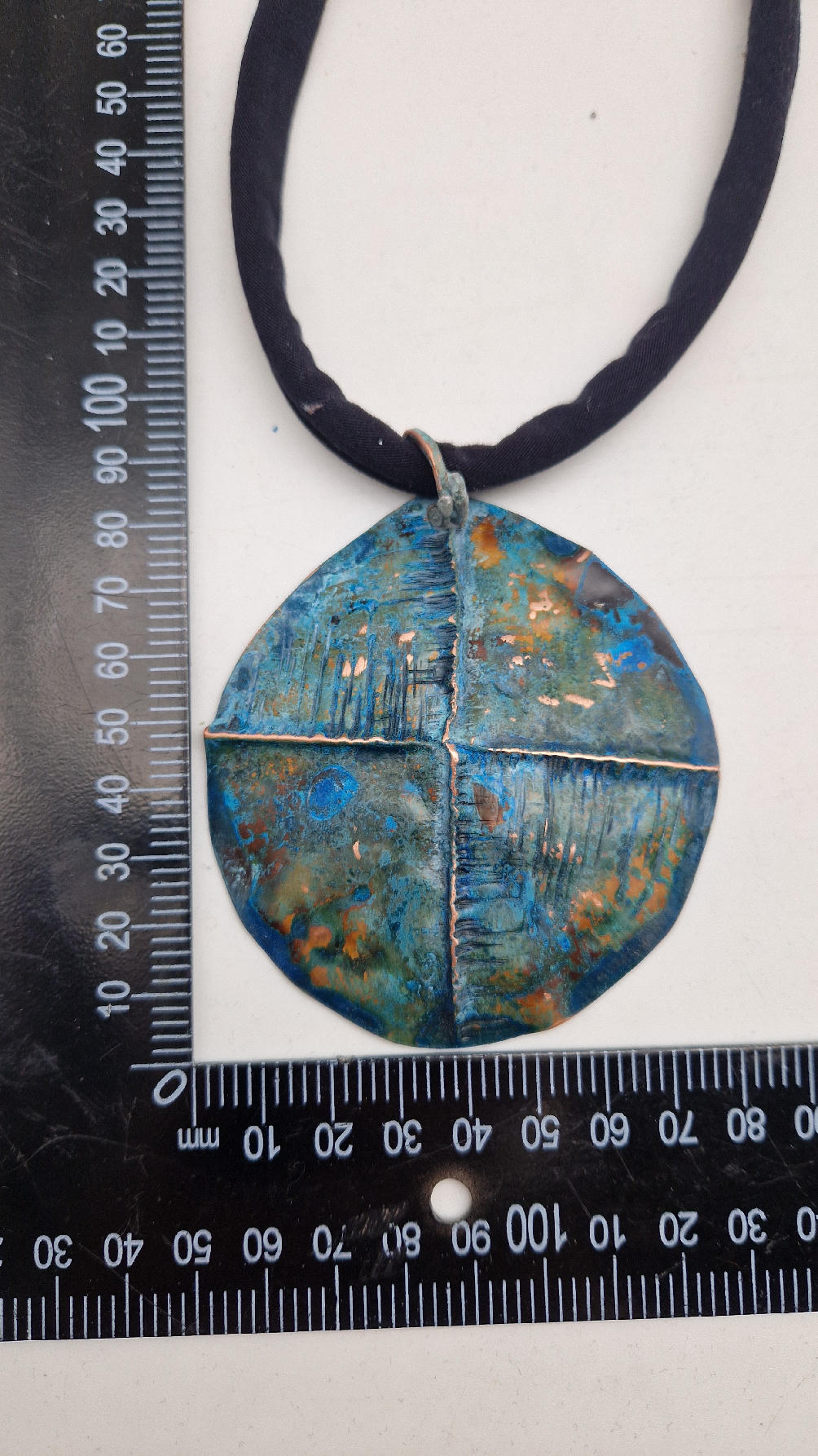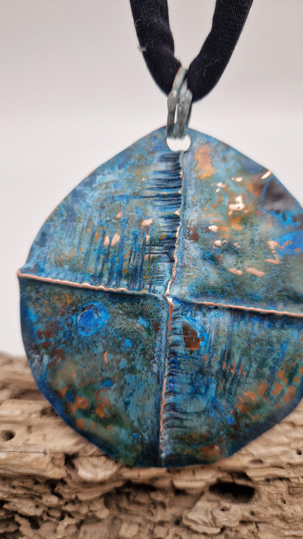 Wyjątkowy, wydłużony, przestrzenny , niebanalny i po prostu piękny wisior…wykonany z miedzi, ale kuty i patynowany, niebiesko-rudy, z lekkimi przebłyskami blasku, wypukły, cudny wisior zawieszony na bawełnianych sznurkach, które możesz łatwo regulować przy pomocy tutki, która jest na karku.