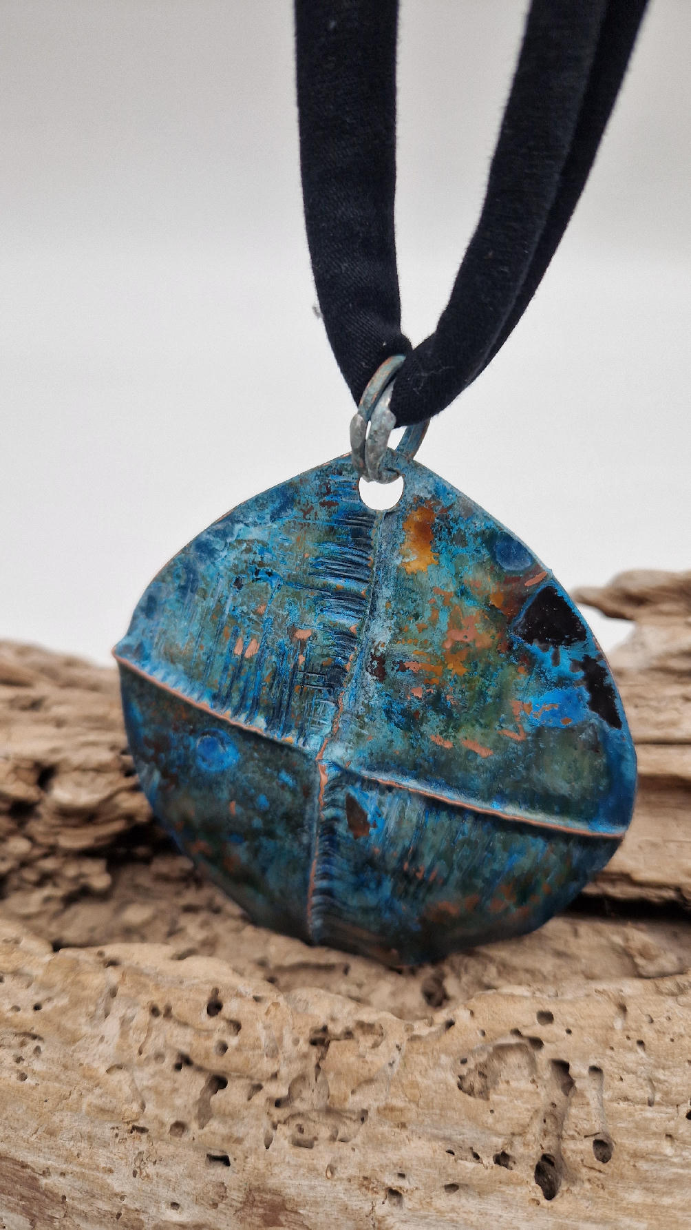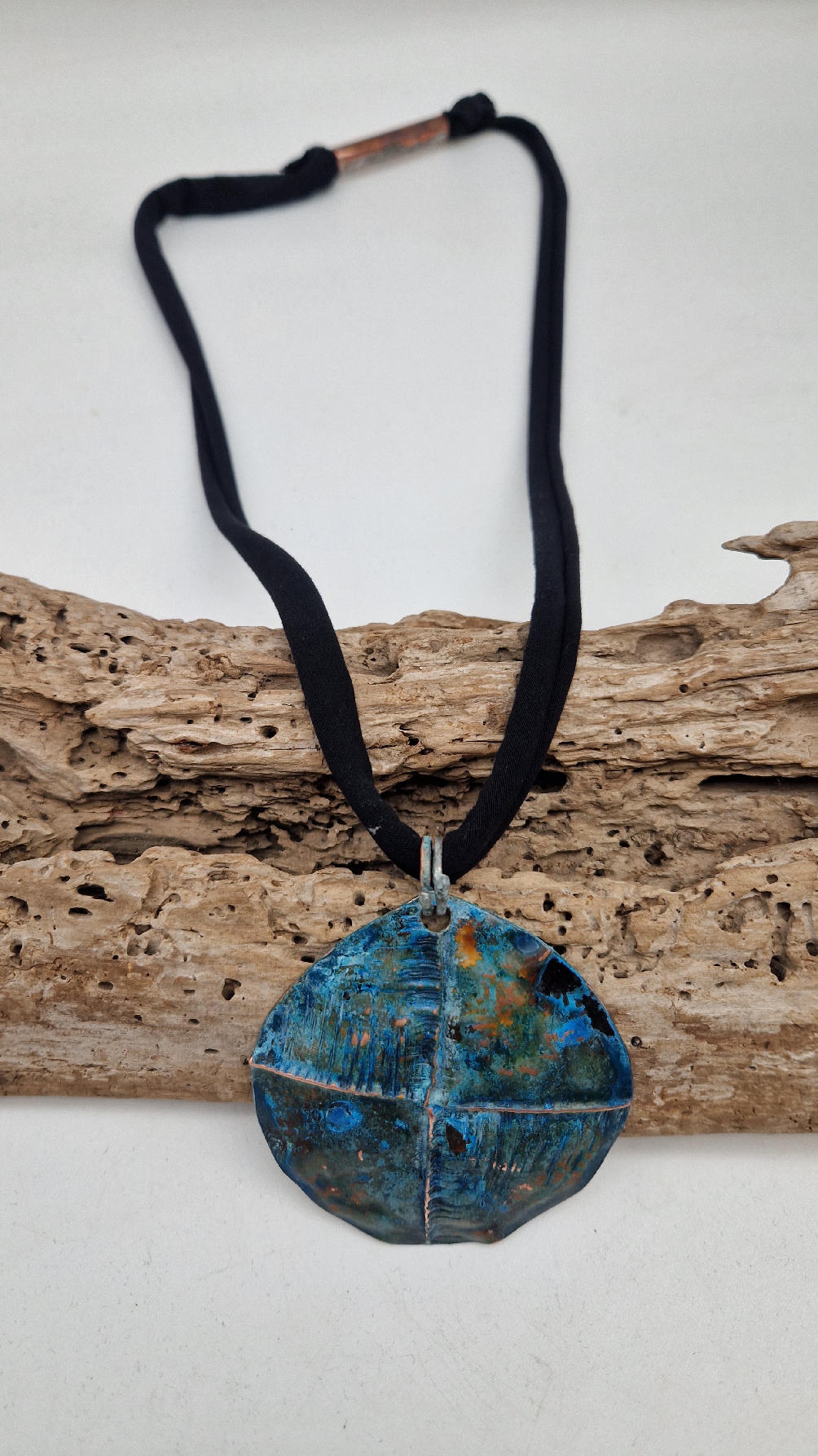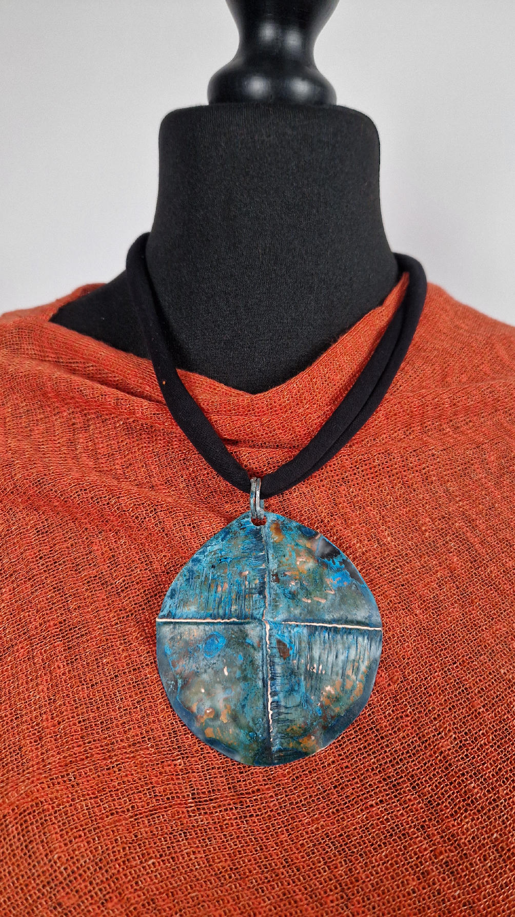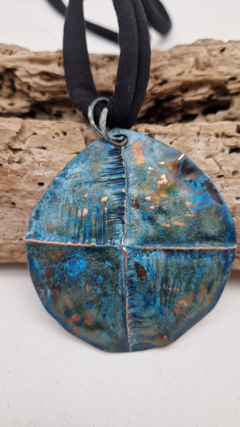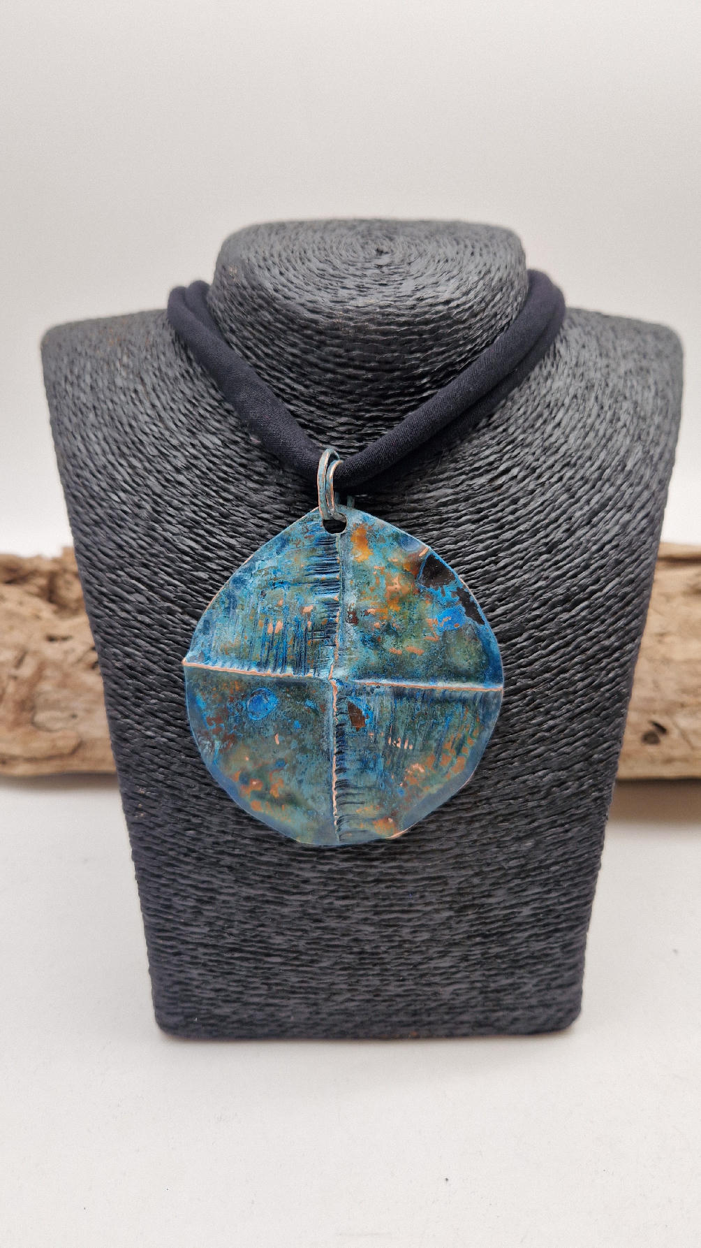Wyjątkowy, wydłużony, przestrzenny , niebanalny i po prostu piękny wisior…wykonany z miedzi, ale kuty i patynowany, niebiesko-rudy, z lekkimi przebłyskami blasku, wypukły, cudny wisior zawieszony na bawełnianych sznurkach, które możesz łatwo regulować przy pomocy tutki, która jest na karku.