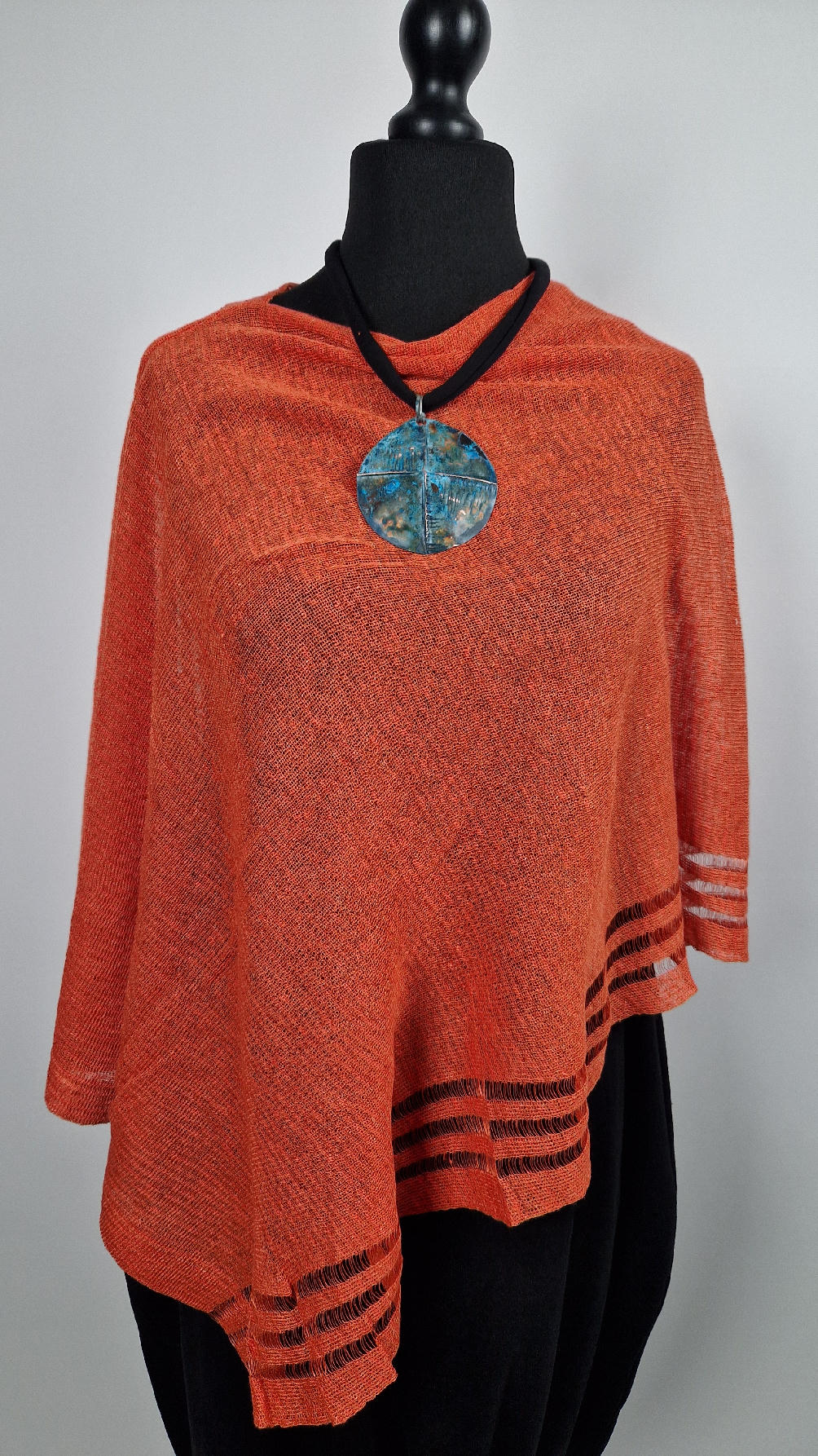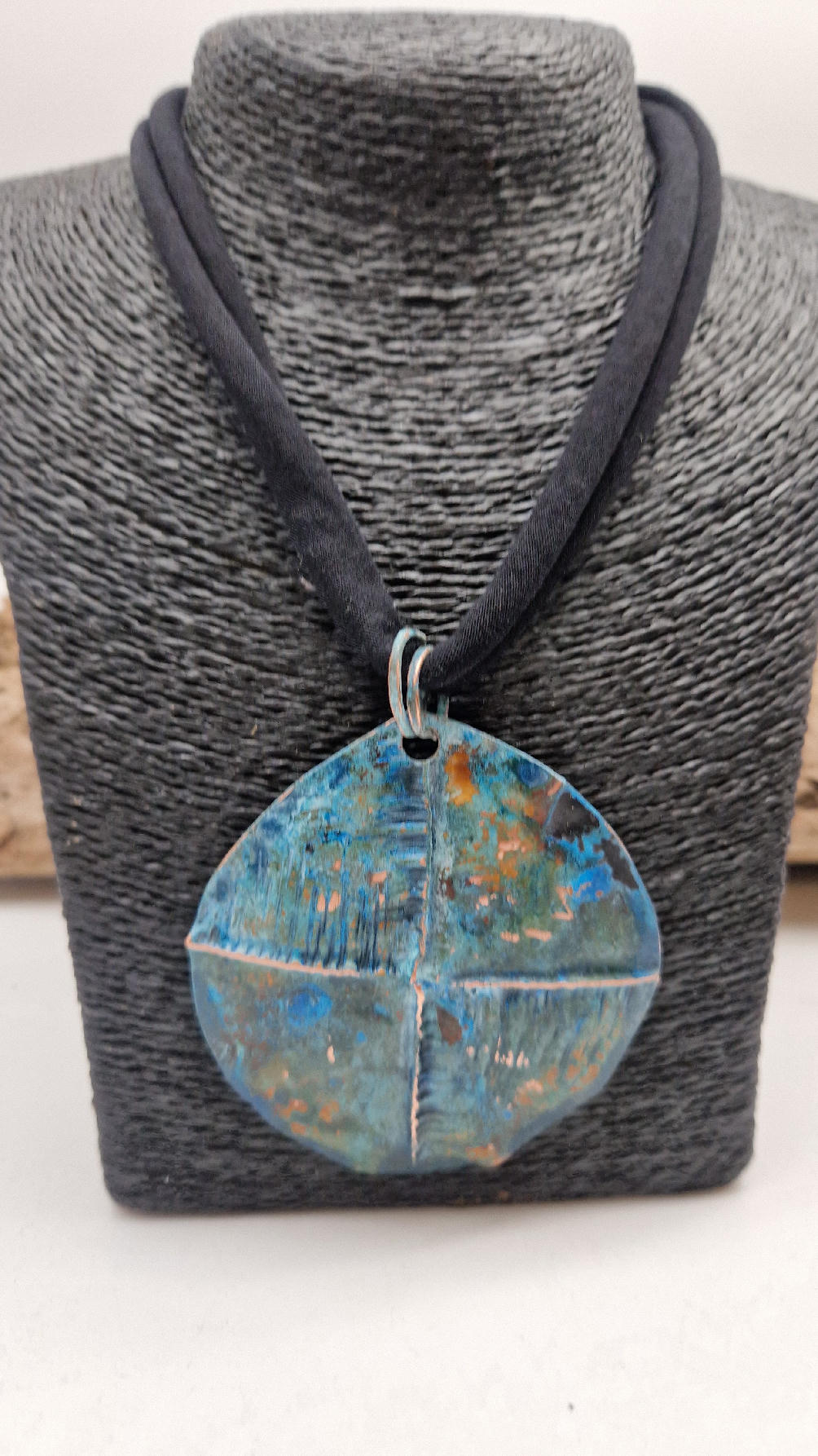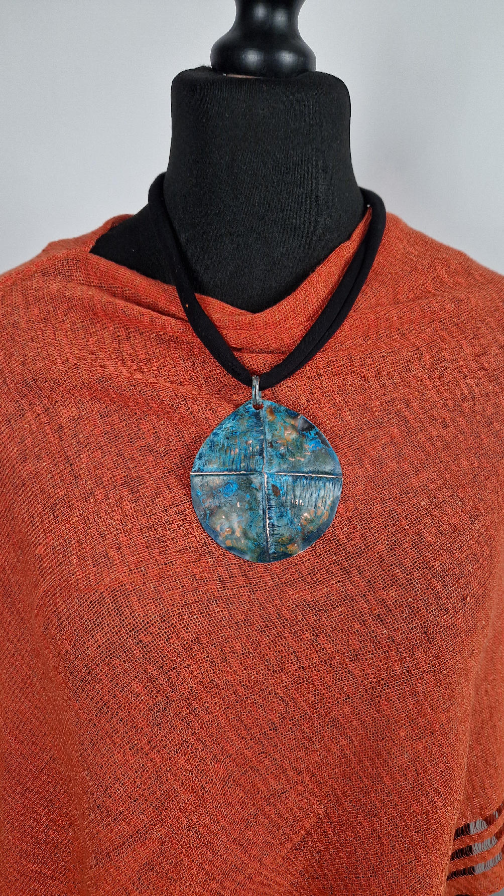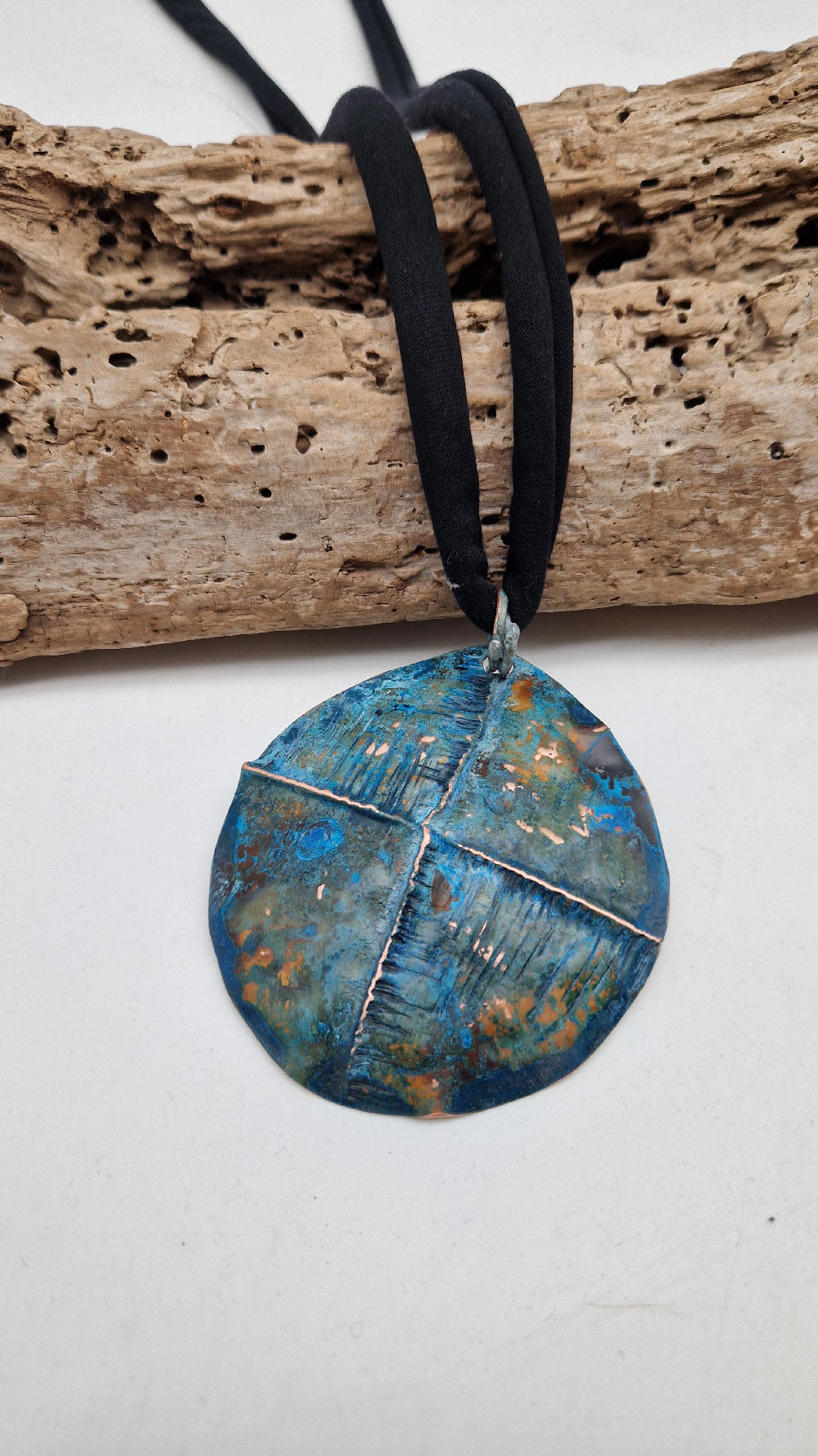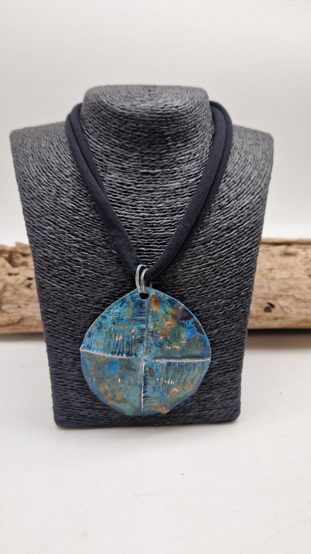 Wyjątkowy, wydłużony, przestrzenny , niebanalny i po prostu piękny wisior…wykonany z miedzi, ale kuty i patynowany, niebiesko-rudy, z lekkimi przebłyskami blasku, wypukły, cudny wisior zawieszony na bawełnianych sznurkach, które możesz łatwo regulować przy pomocy tutki, która jest na karku.