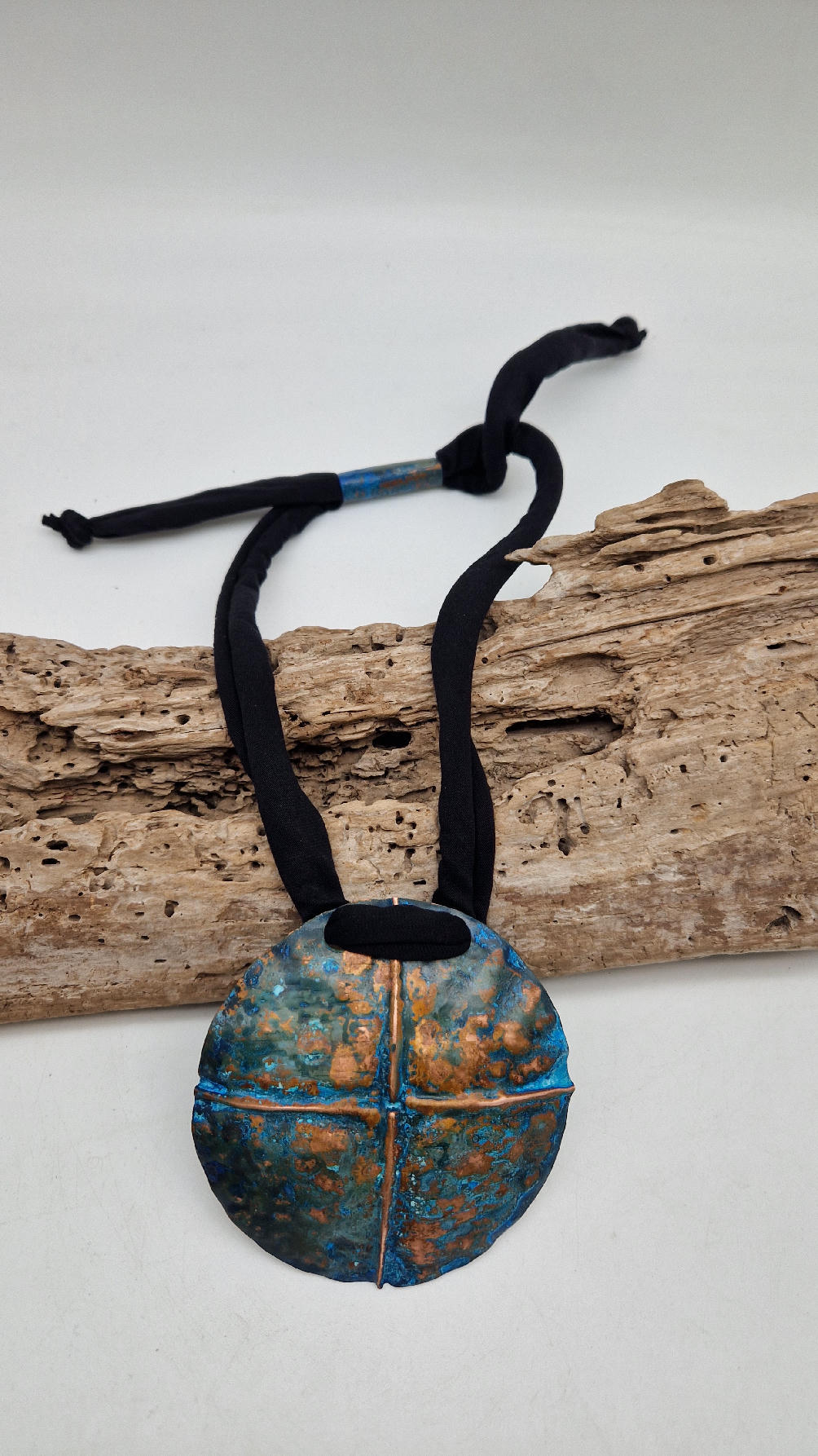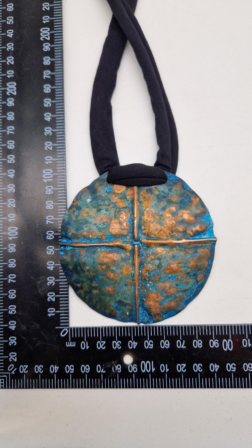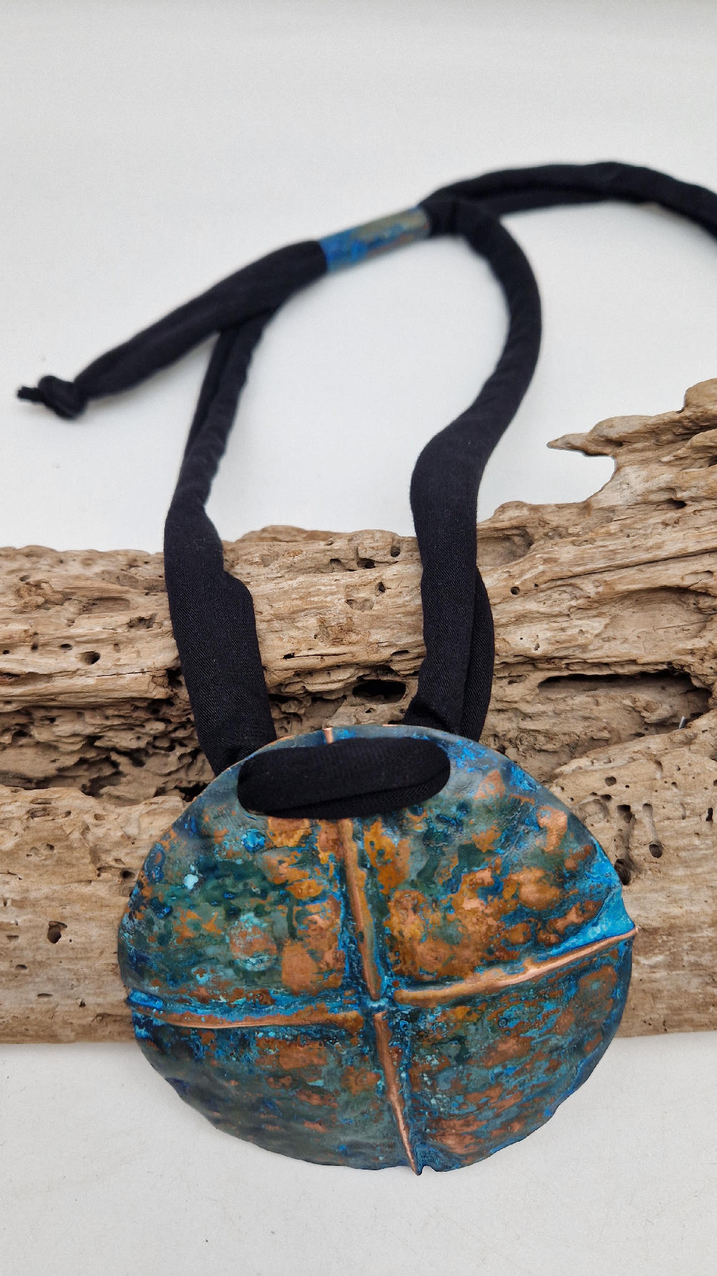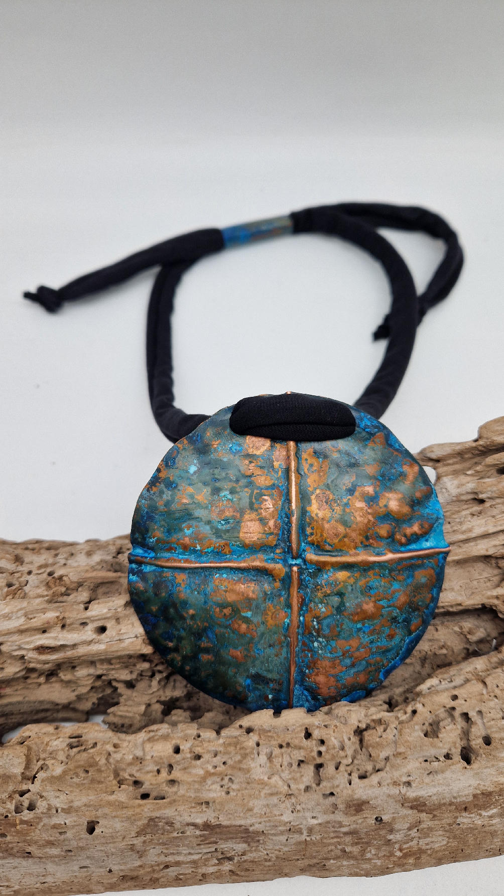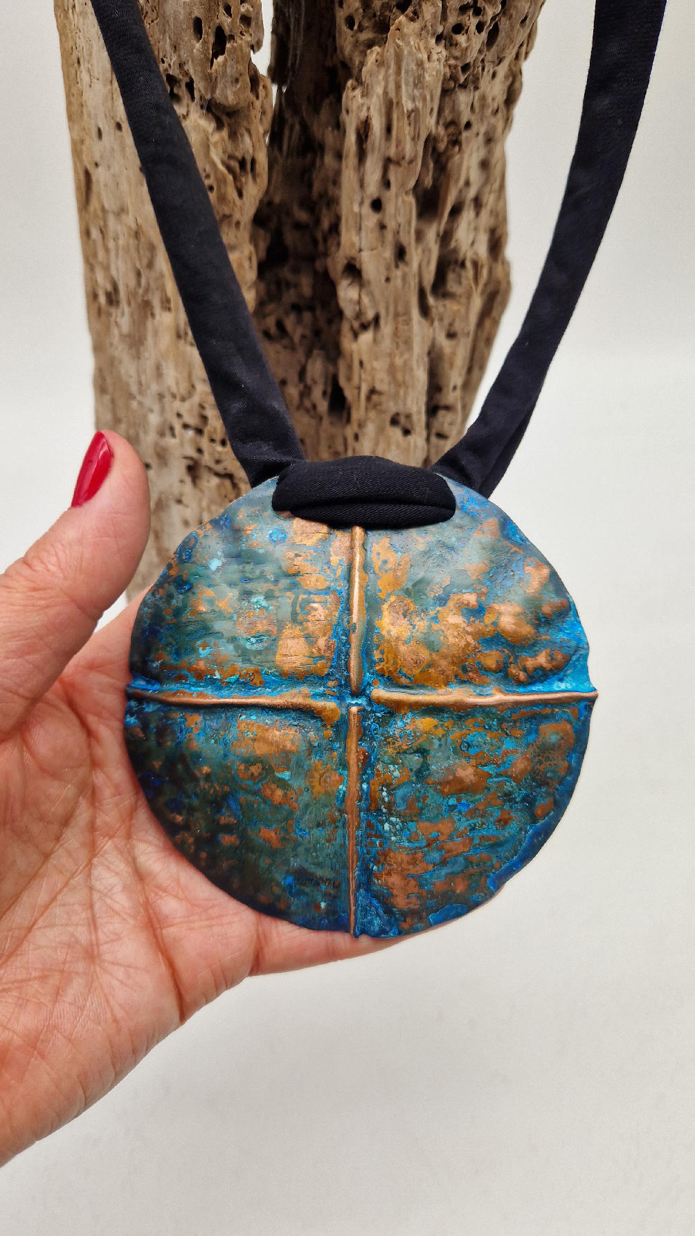 Wyjątkowy, okrągły, ale przestrzenny , niepłaski, niebanalny i po prostu piękny wisior…wykonany z miedzi, ale kuty i patynowany, niebiesko-rudy, z lekkimi przebłyskami blasku, wypukły, cudny wisior zawieszony na bawełnianych sznurkach, które możesz łatwo regulować przy pomocy tutki, która jest na karku.