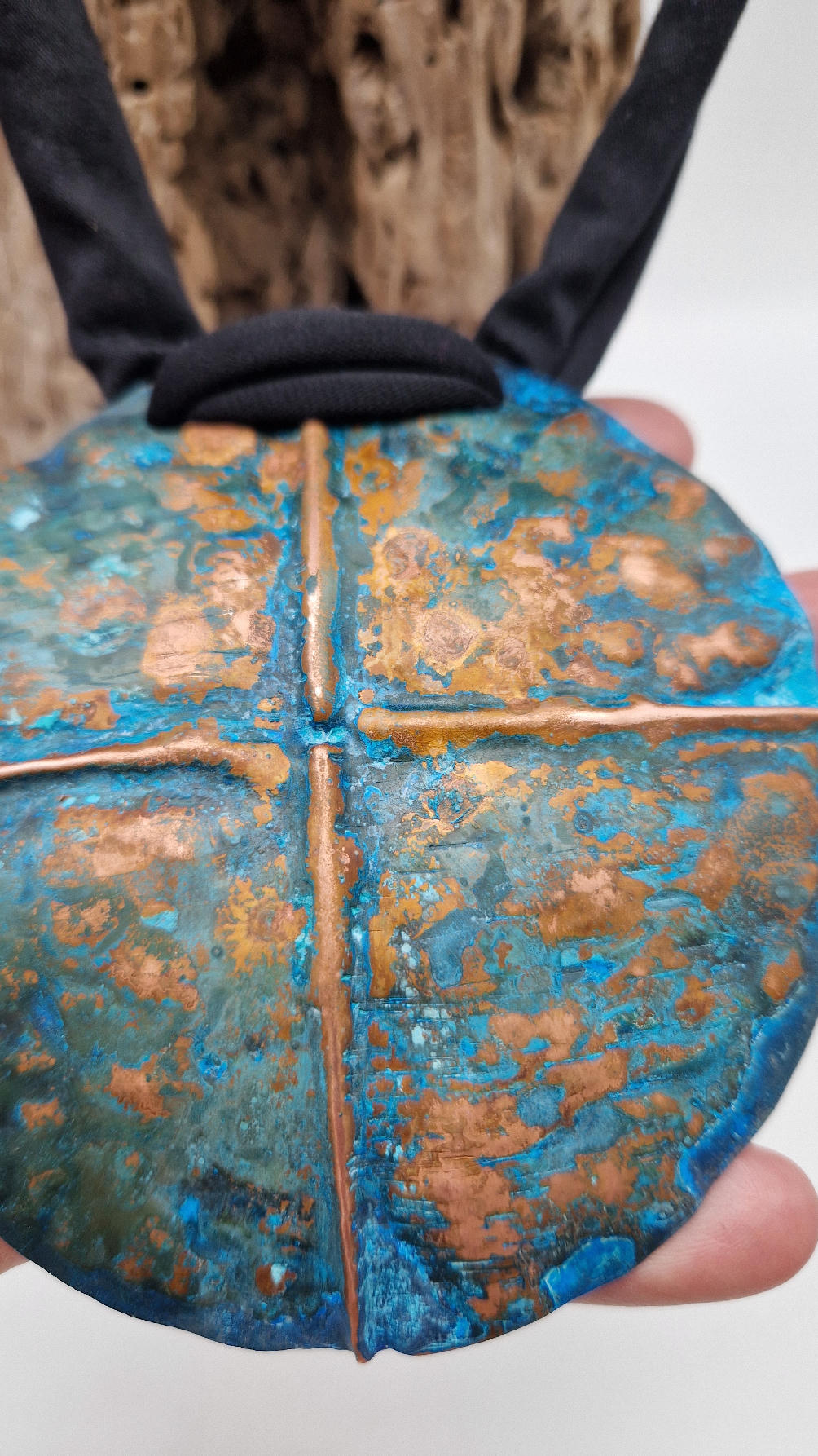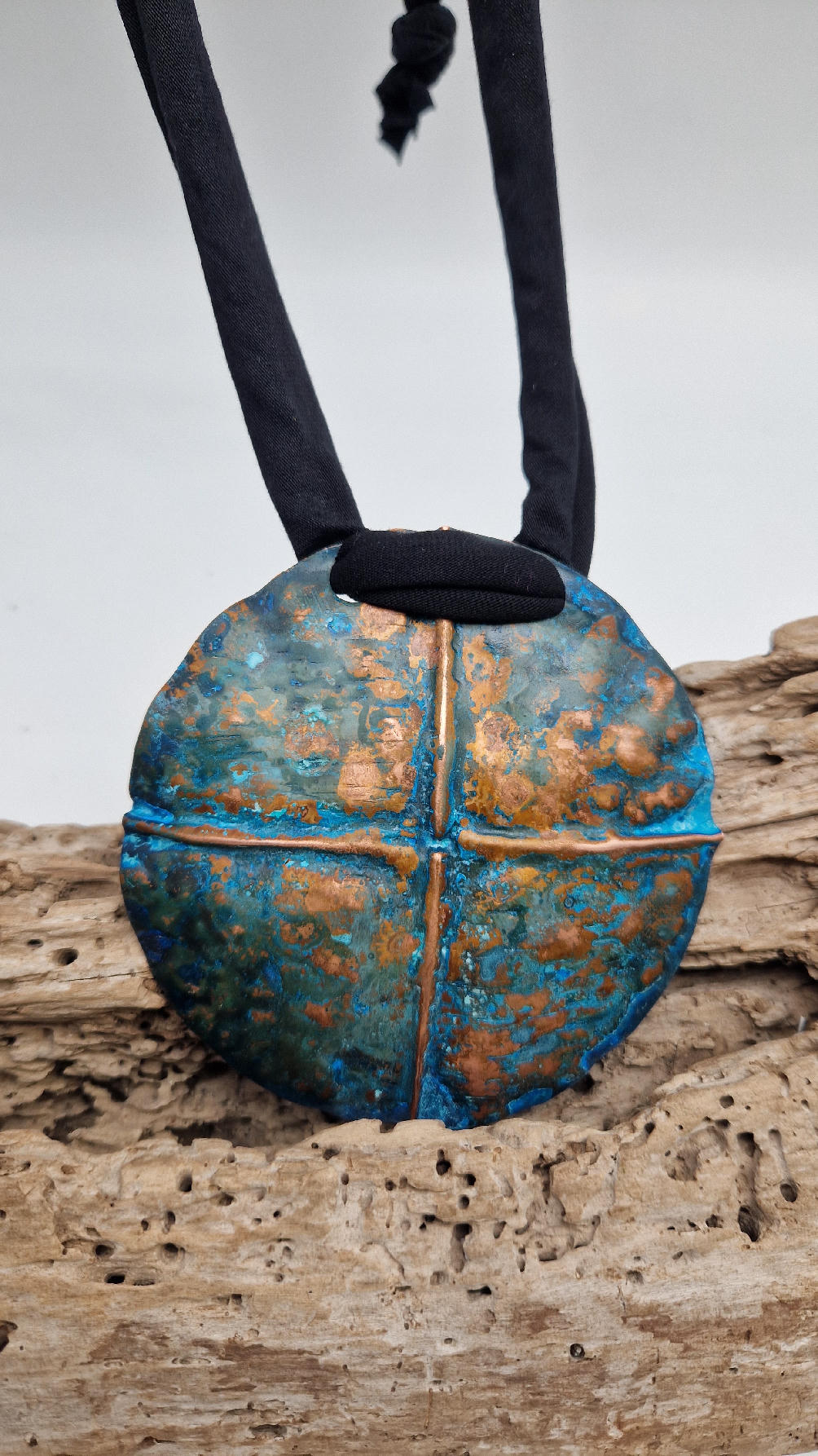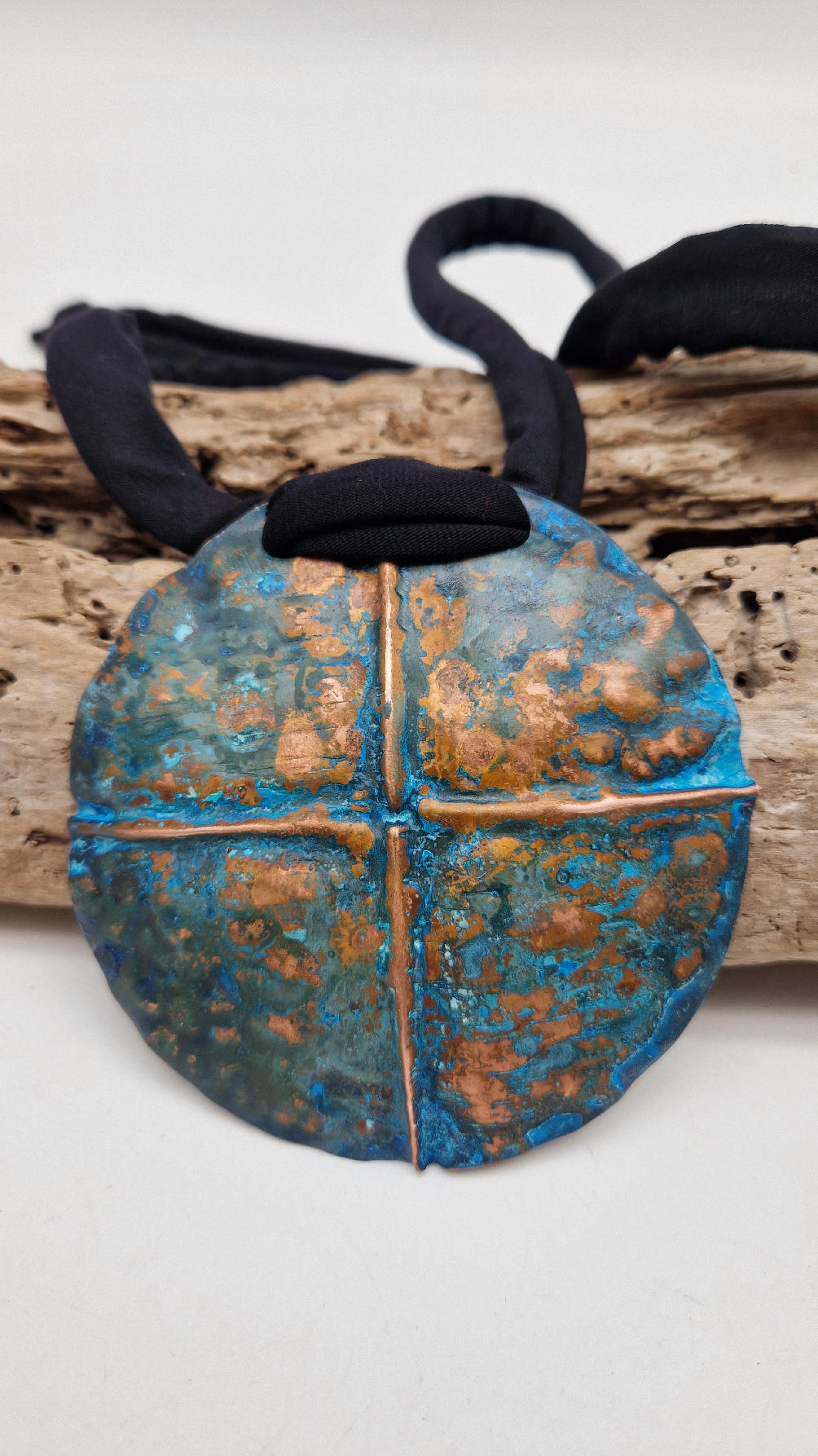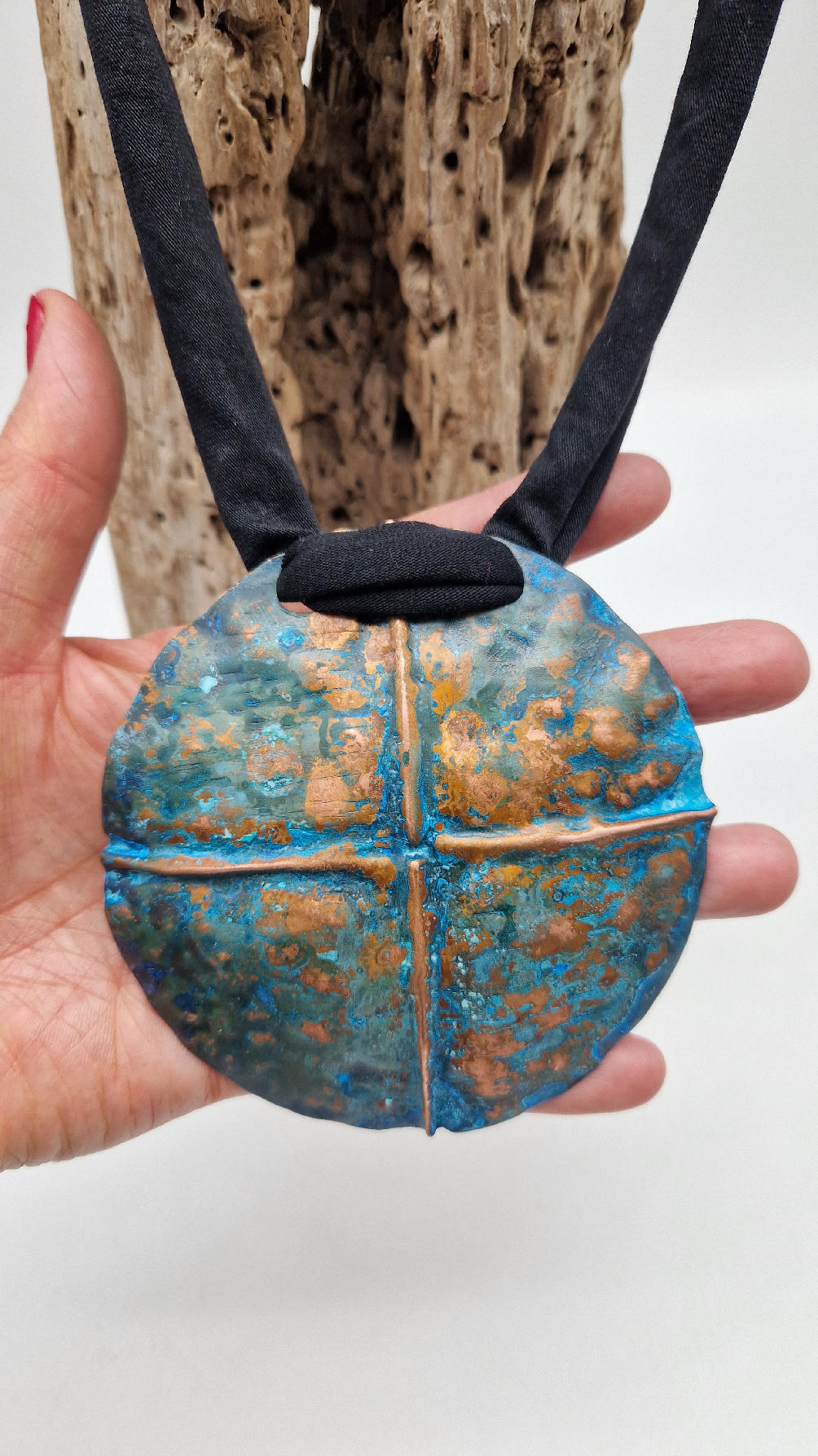 Wyjątkowy, okrągły, ale przestrzenny , niepłaski, niebanalny i po prostu piękny wisior…wykonany z miedzi, ale kuty i patynowany, niebiesko-rudy, z lekkimi przebłyskami blasku, wypukły, cudny wisior zawieszony na bawełnianych sznurkach, które możesz łatwo regulować przy pomocy tutki, która jest na karku.