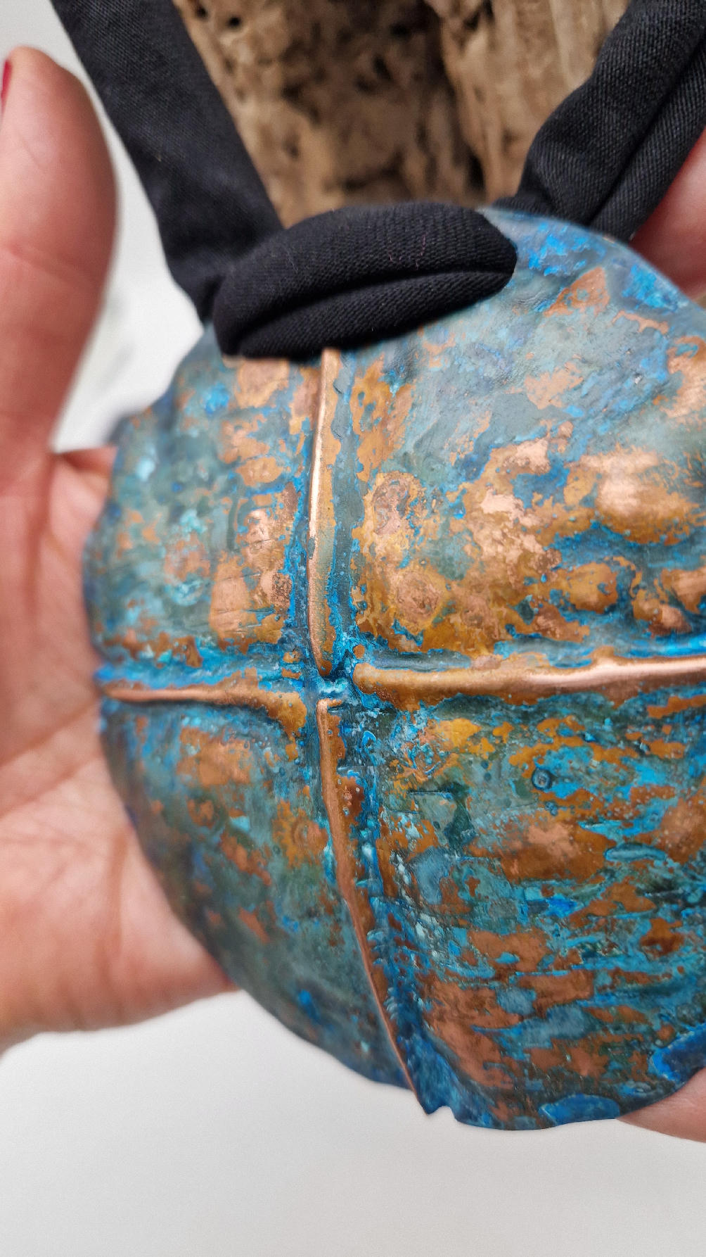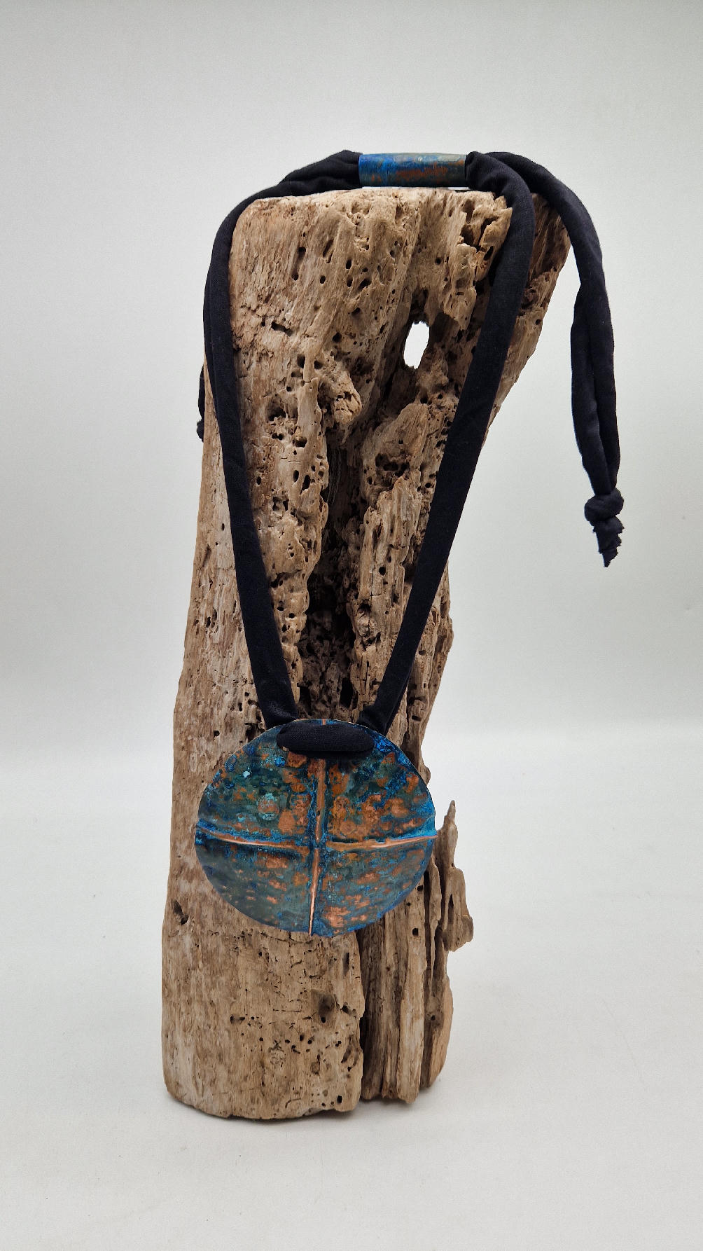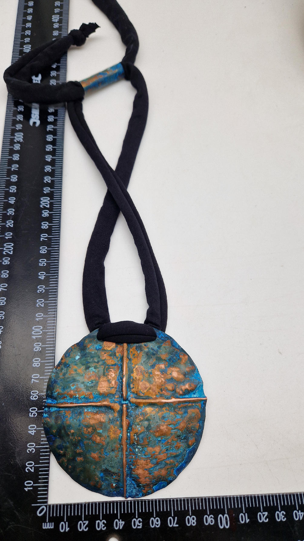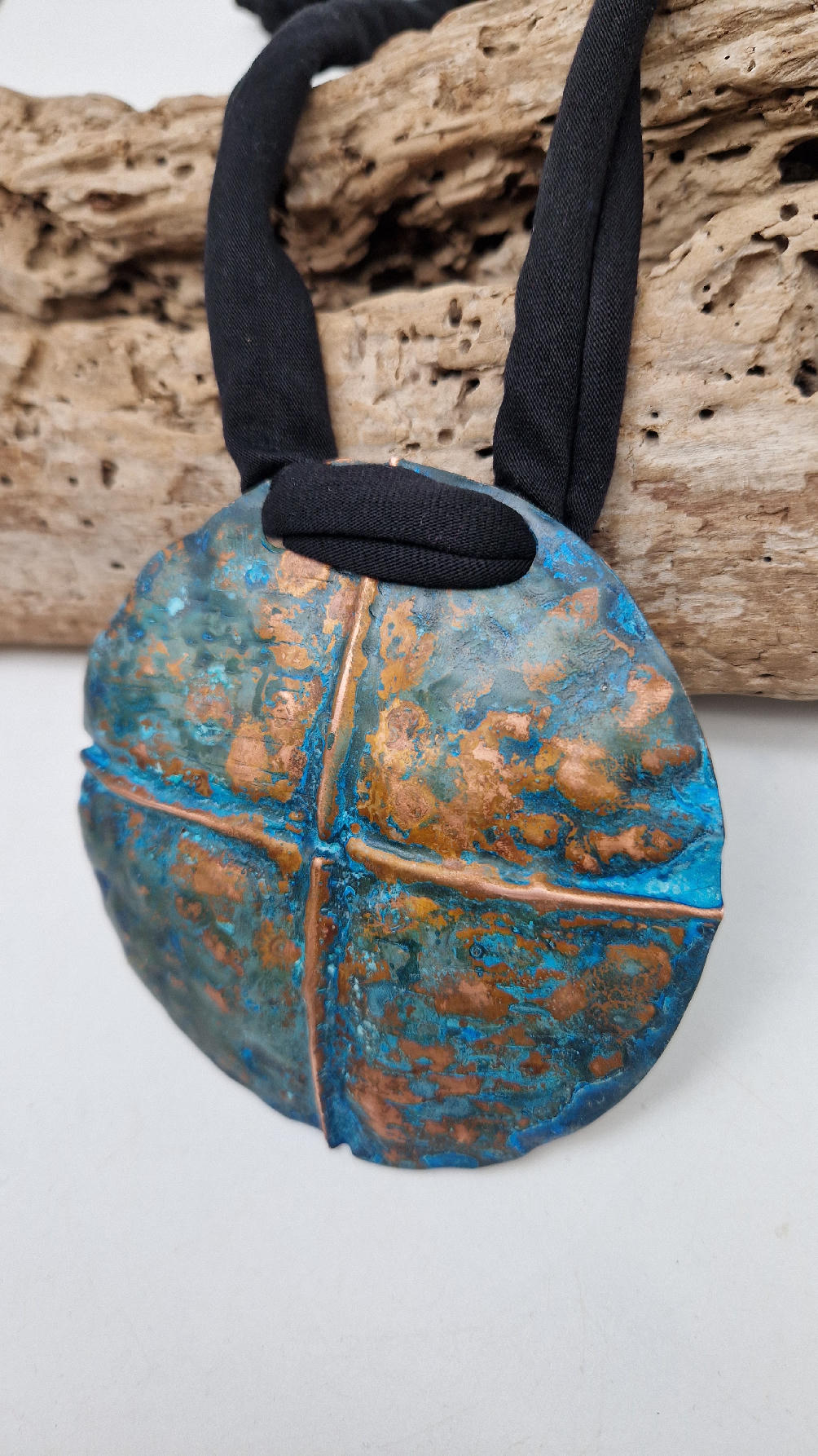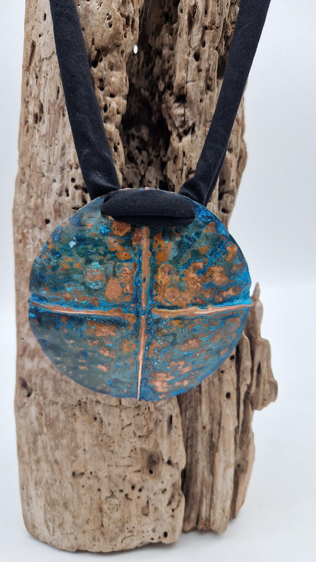 Wyjątkowy, okrągły, ale przestrzenny , niepłaski, niebanalny i po prostu piękny wisior…wykonany z miedzi, ale kuty i patynowany, niebiesko-rudy, z lekkimi przebłyskami blasku, wypukły, cudny wisior zawieszony na bawełnianych sznurkach, które możesz łatwo regulować przy pomocy tutki, która jest na karku.