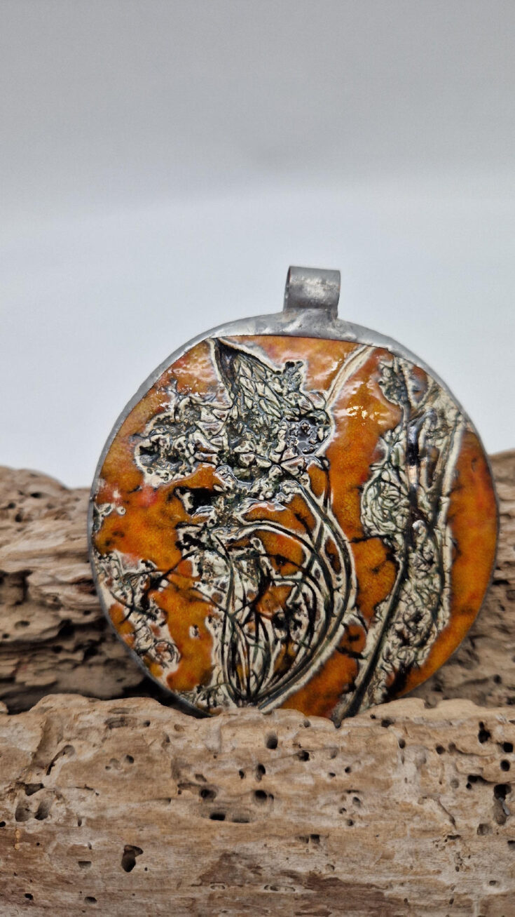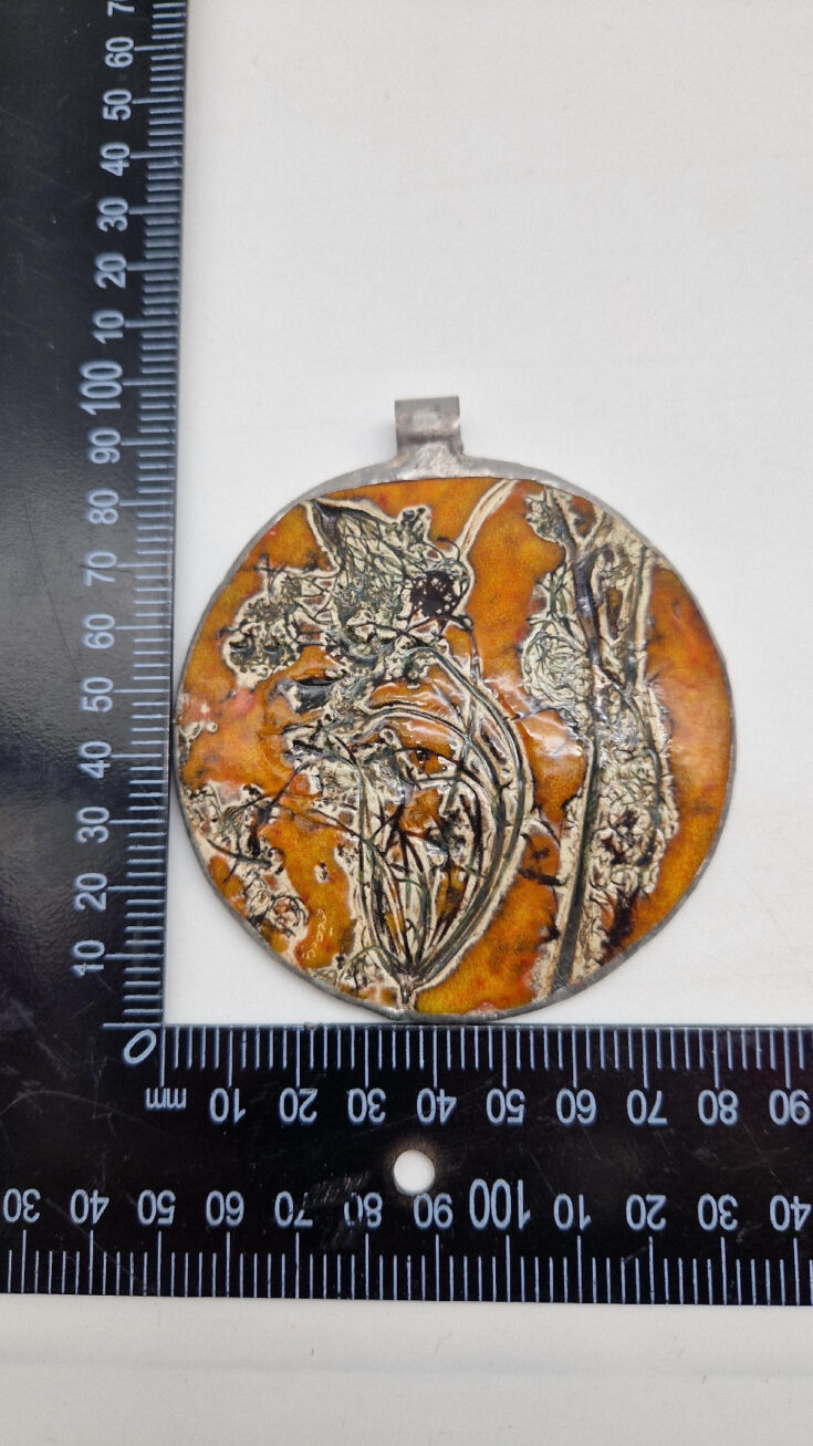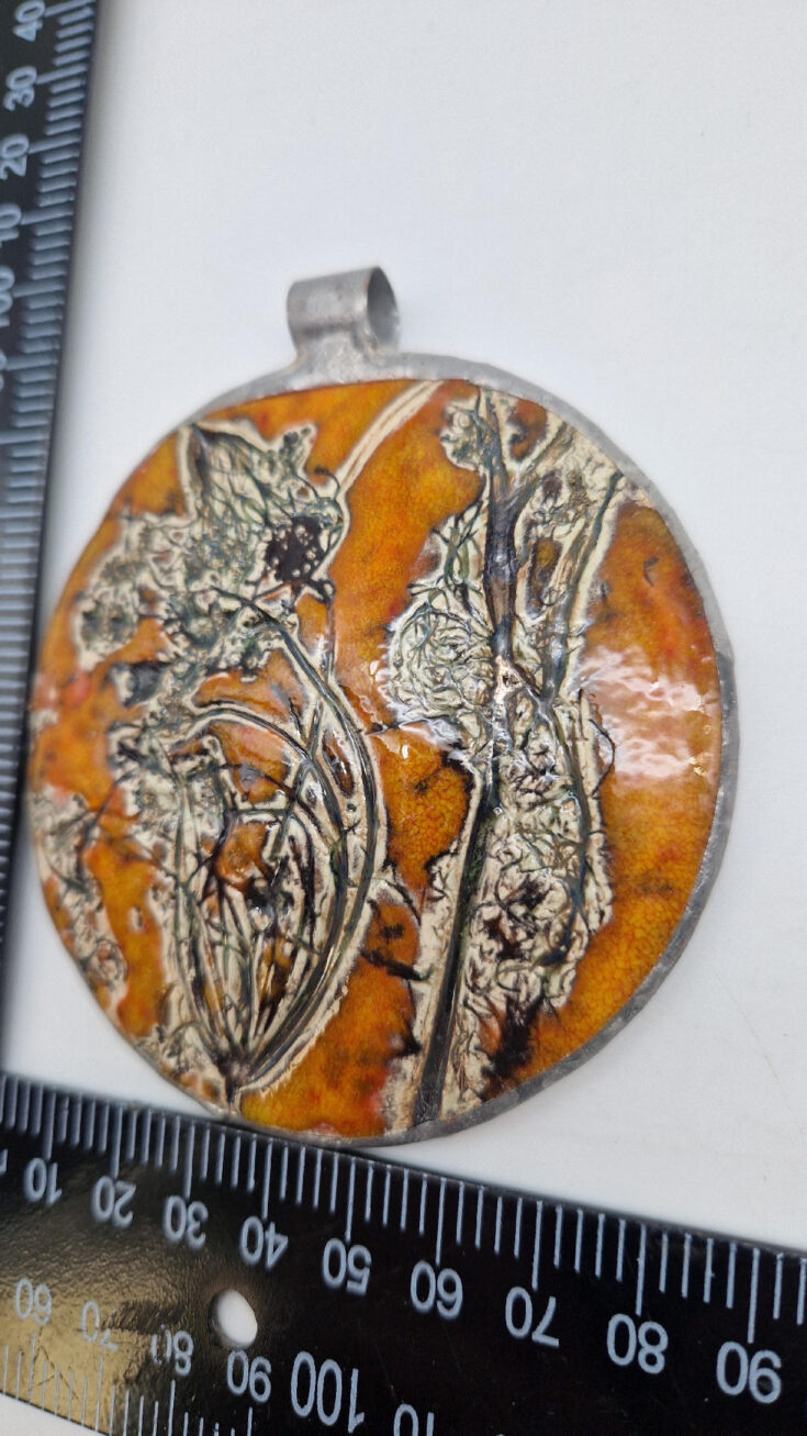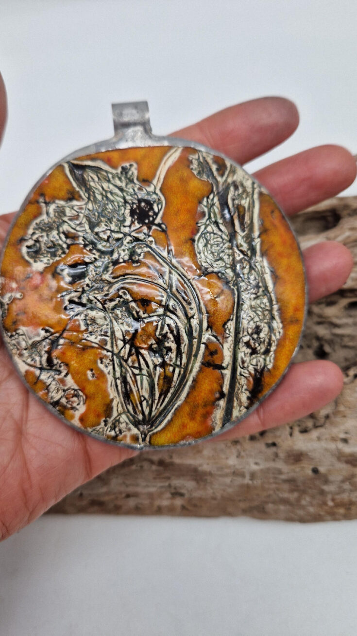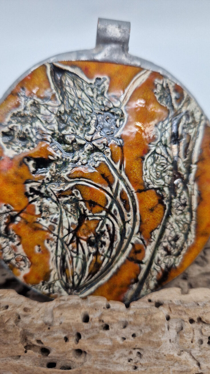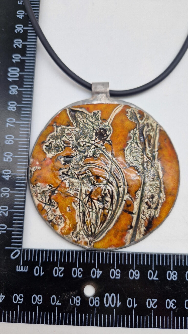 Cudny, ceramiczny, duży, prześliczny pomarańczowo-miodowy wisior, liście i kwiaty jakby odciśnięty w glinie… ceramika oprawiona w metal, która będzie piękną dekoracją Twojego dekoltu.