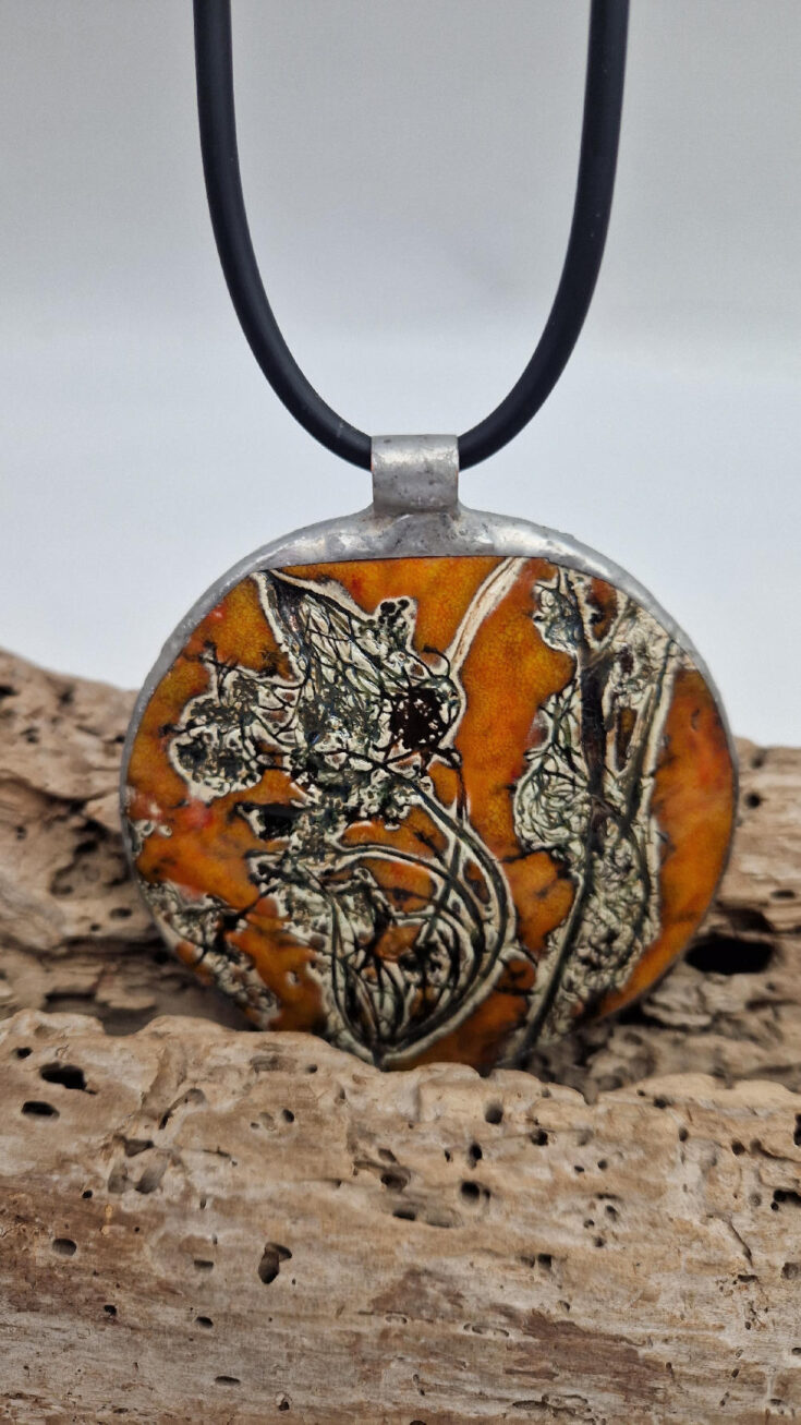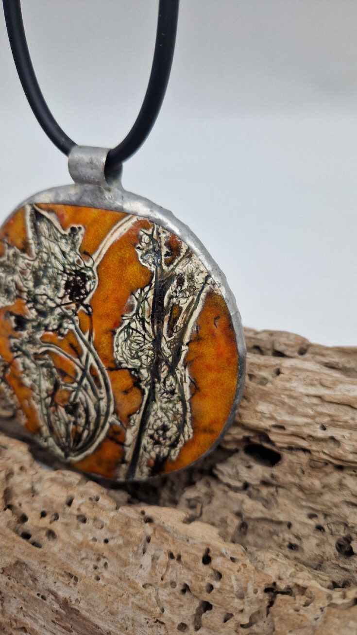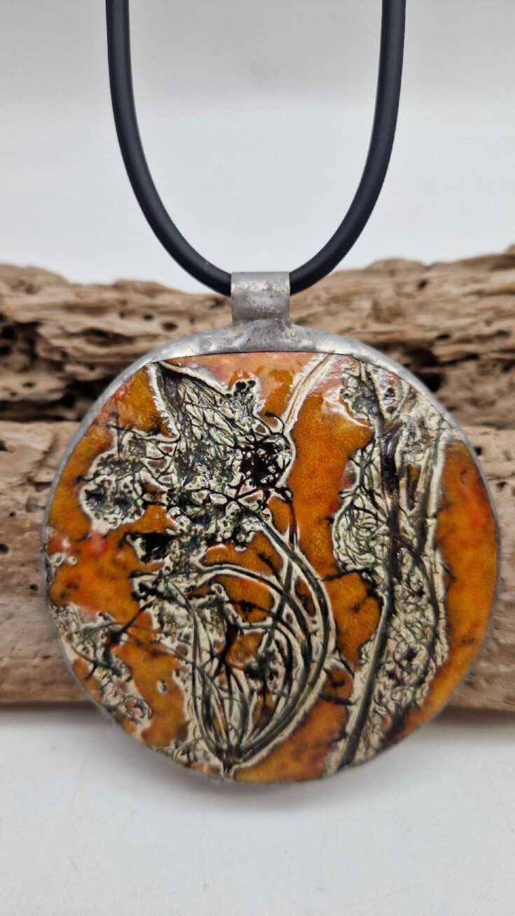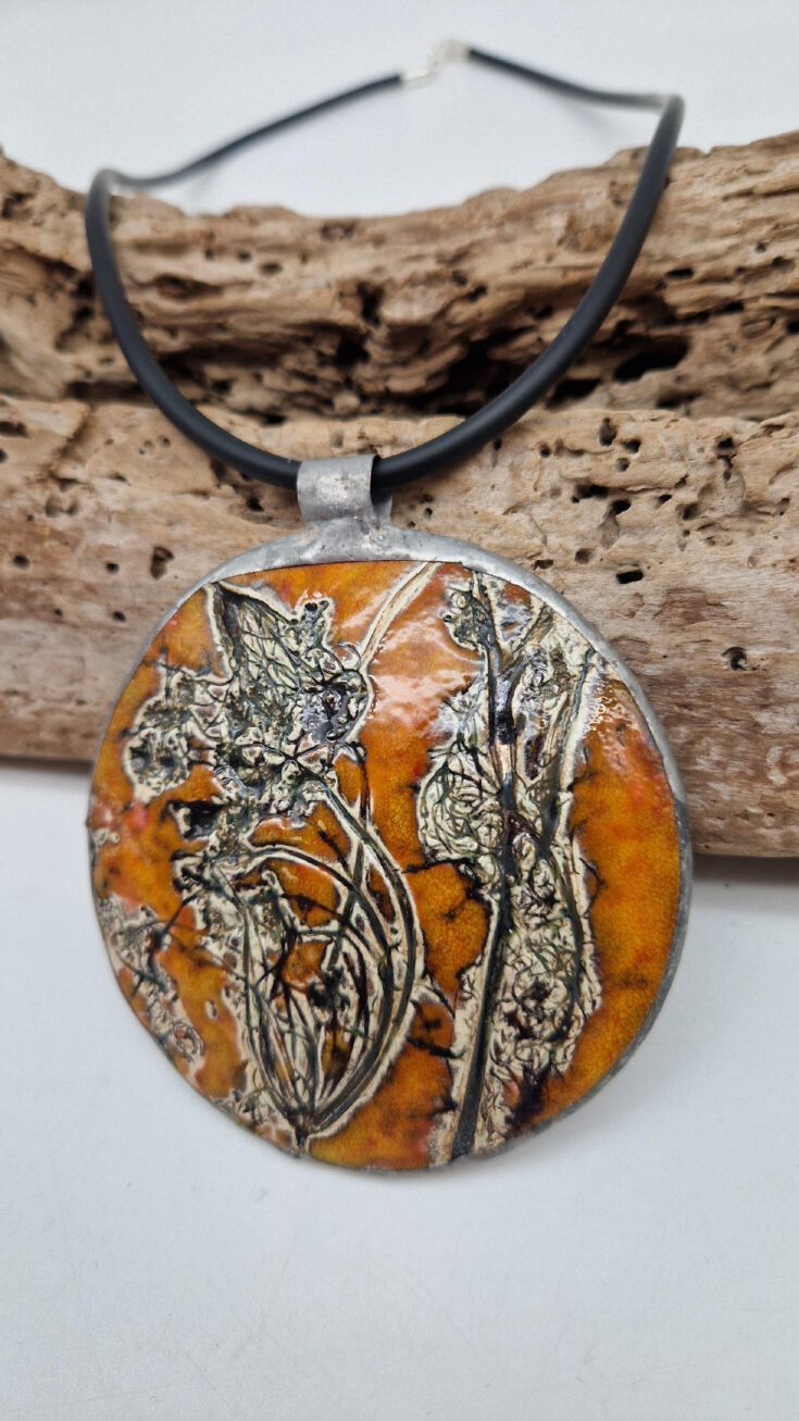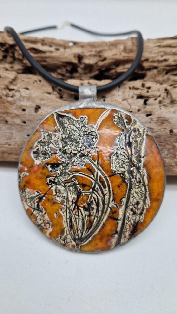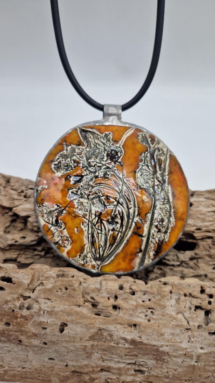 Cudny, ceramiczny, duży, prześliczny pomarańczowo-miodowy wisior, liście i kwiaty jakby odciśnięty w glinie… ceramika oprawiona w metal, która będzie piękną dekoracją Twojego dekoltu.