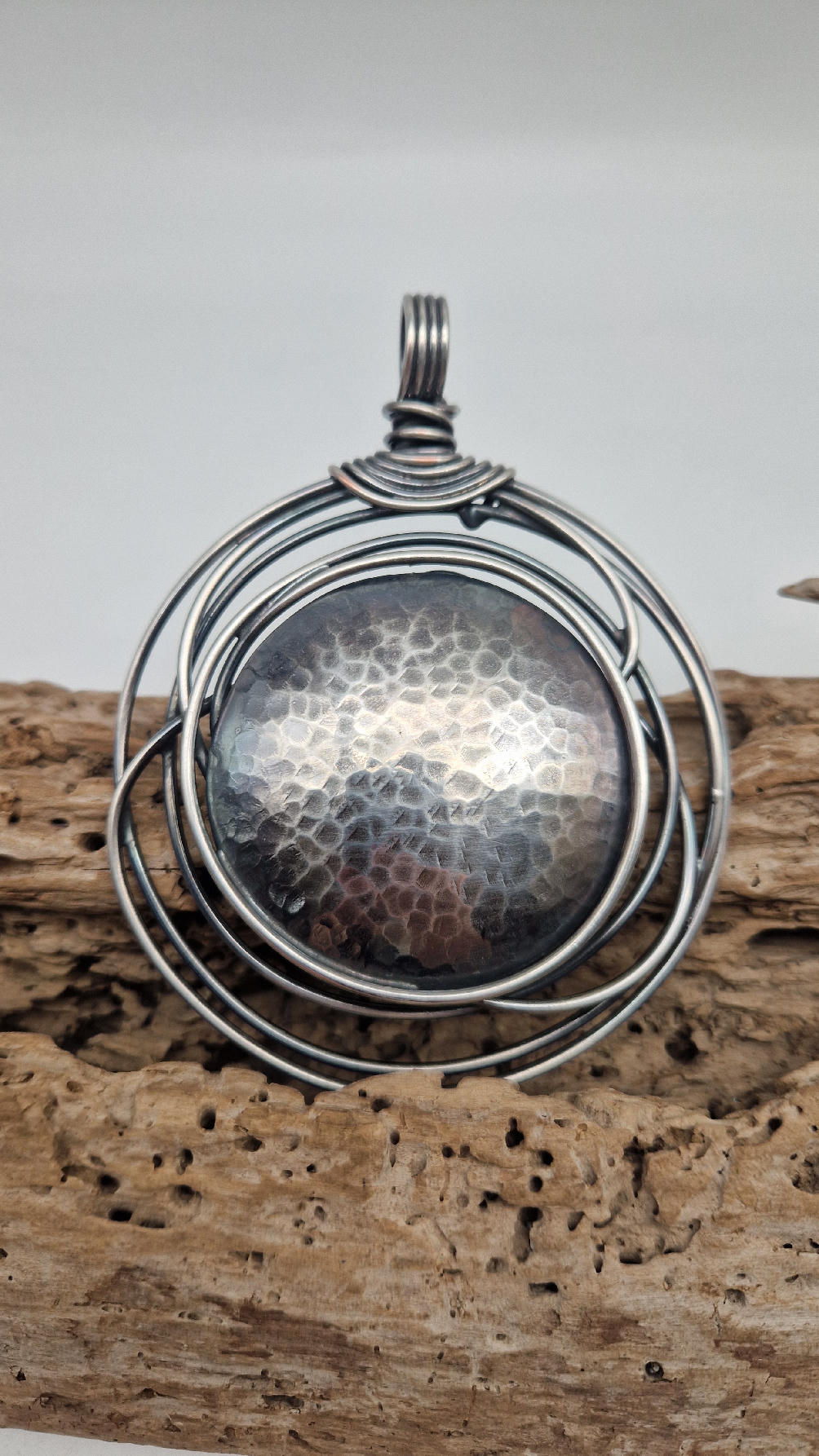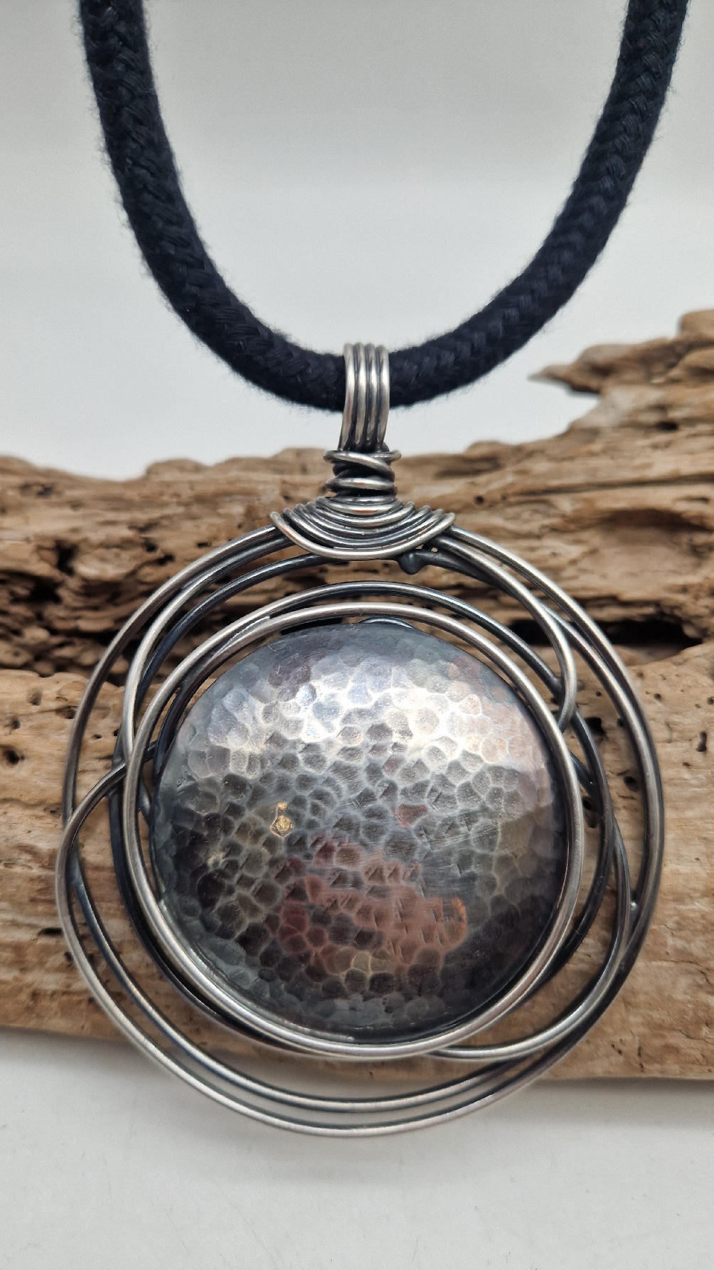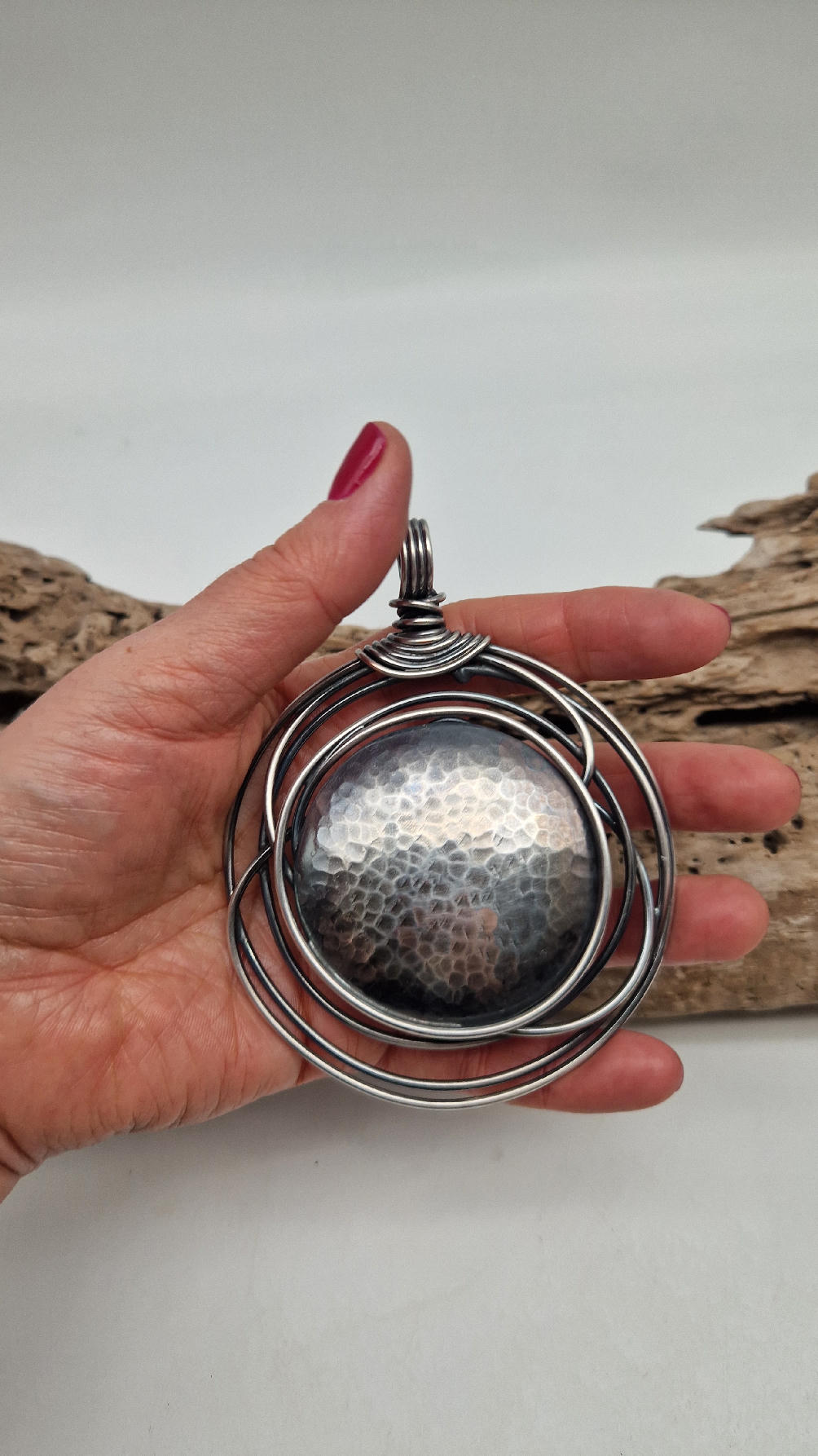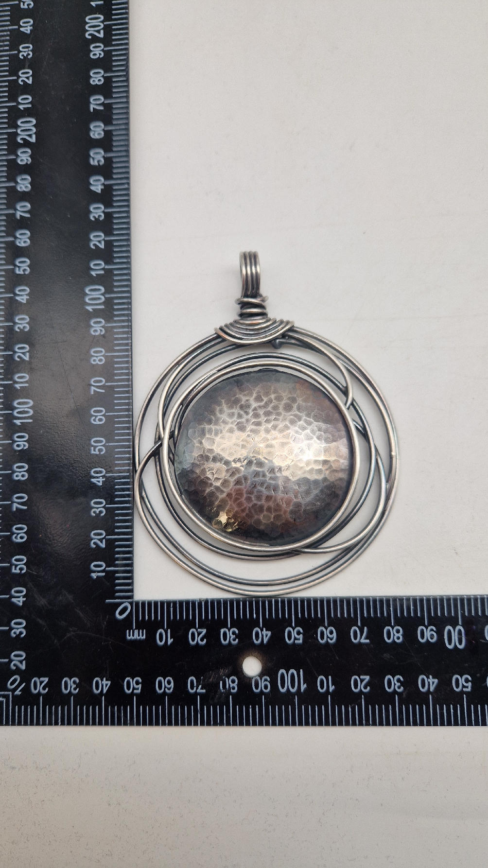 Duży metalowy wisior, taki…idealny… do wszystkiego, okrągły,  bardzo oryginalny, przestrzenny zrobiony z miedzi, kuty, patynowany, srebrzony, cudny…taki, że zakochasz się od pierwszego założenia . Ja noszę go bardzo często…