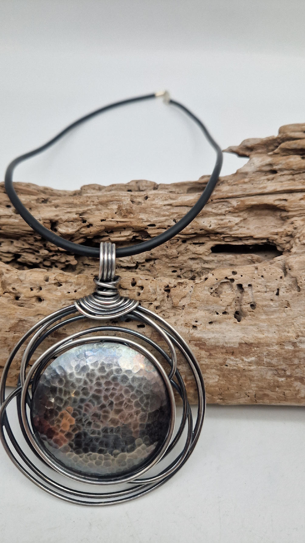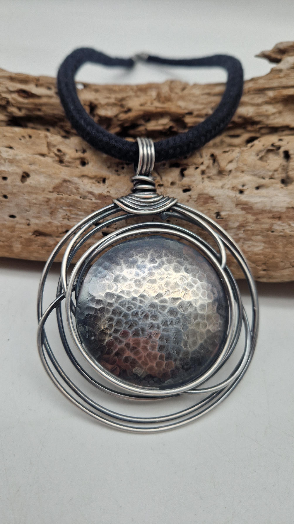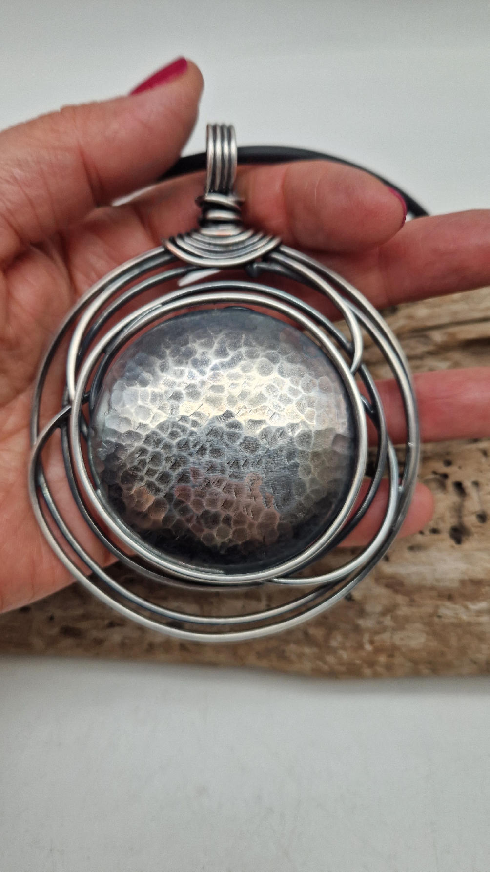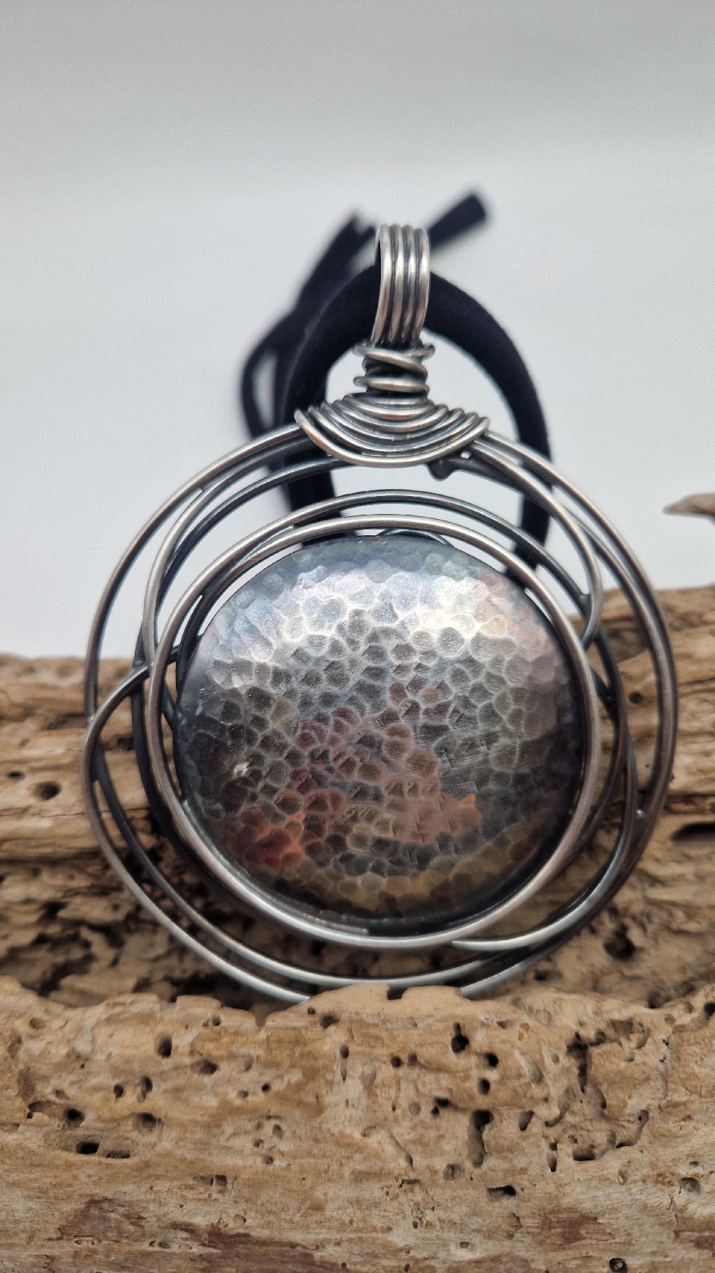 Duży metalowy wisior, taki…idealny… do wszystkiego, okrągły,  bardzo oryginalny, przestrzenny zrobiony z miedzi, kuty, patynowany, srebrzony, cudny…taki, że zakochasz się od pierwszego założenia . Ja noszę go bardzo często…
