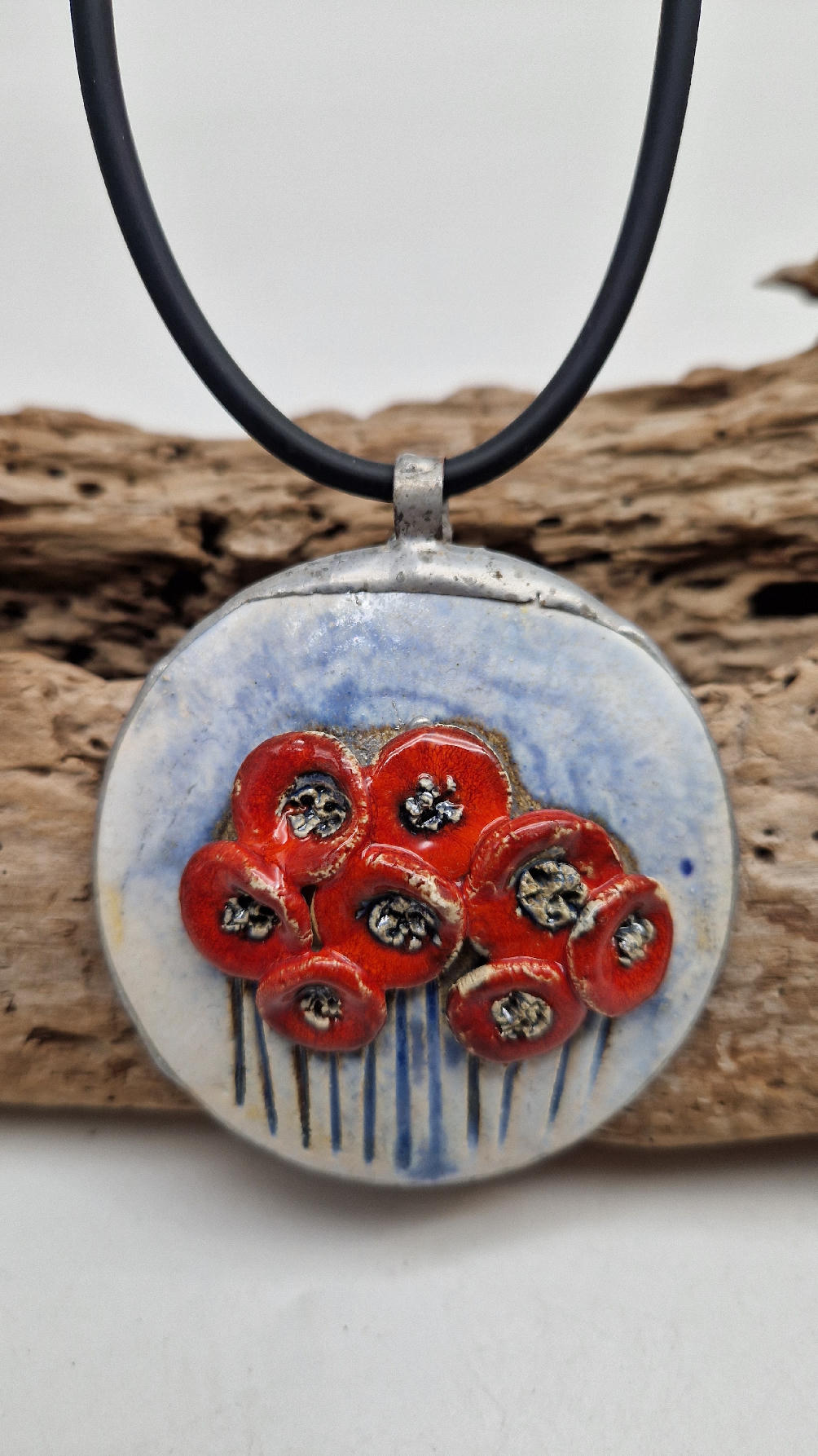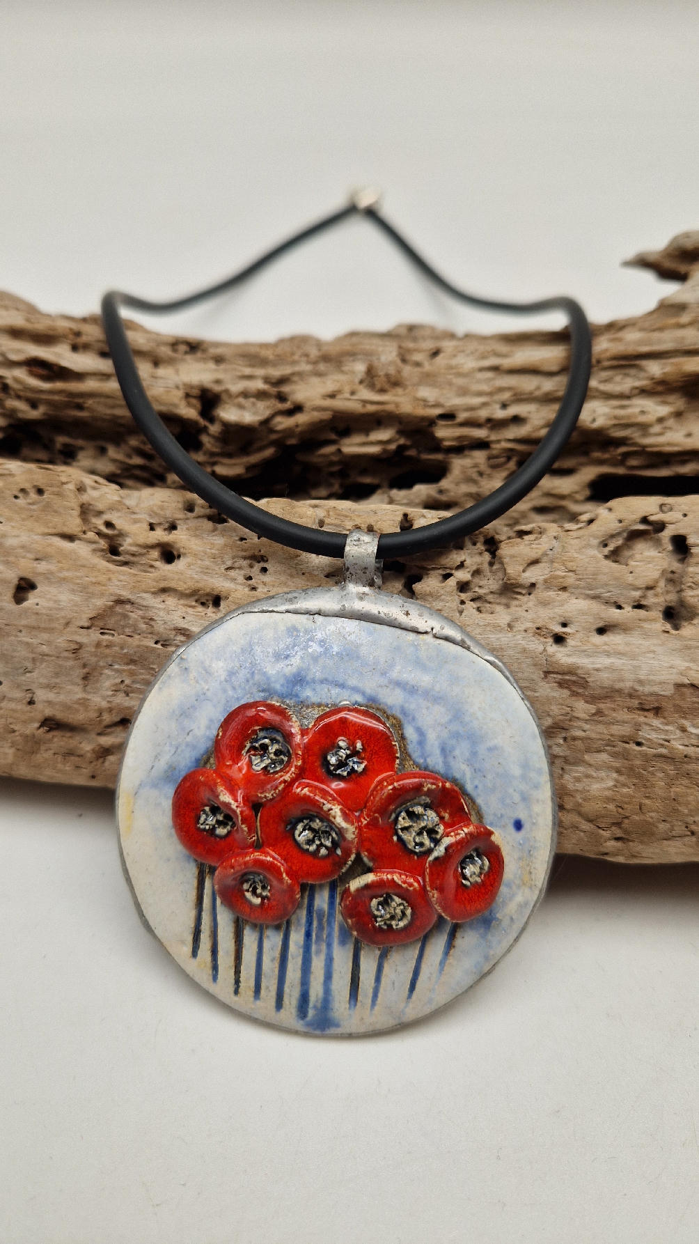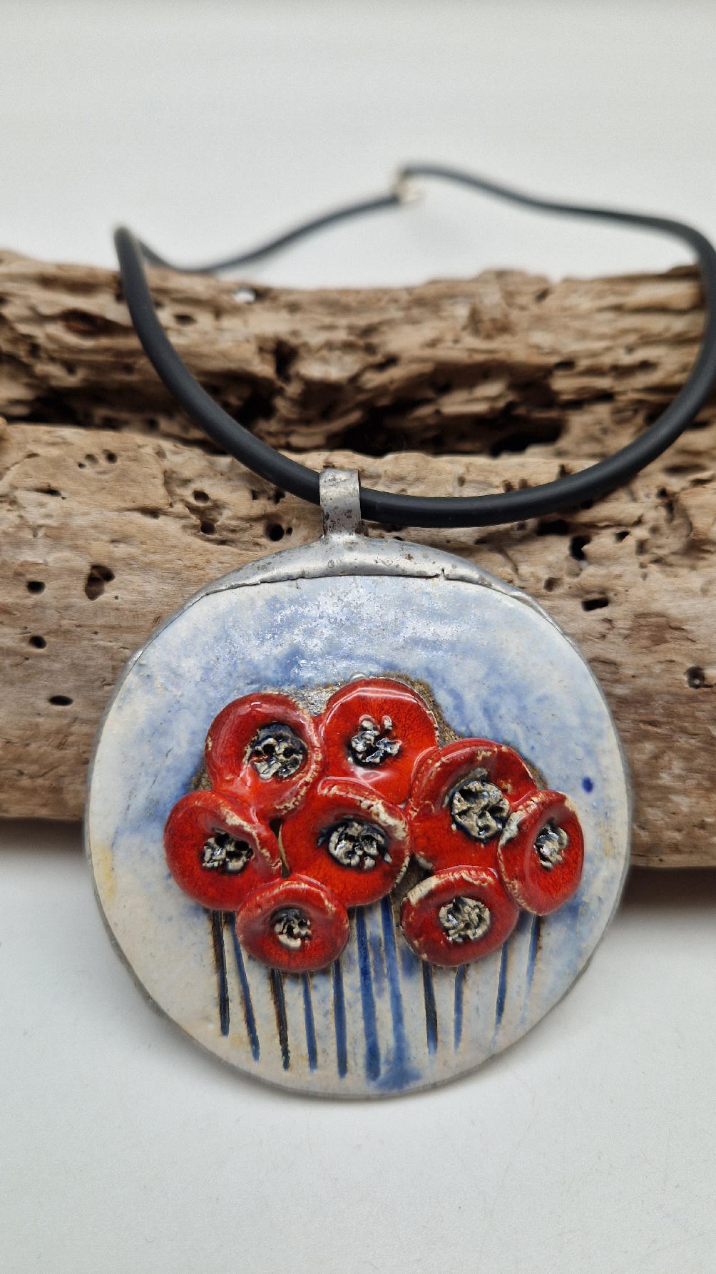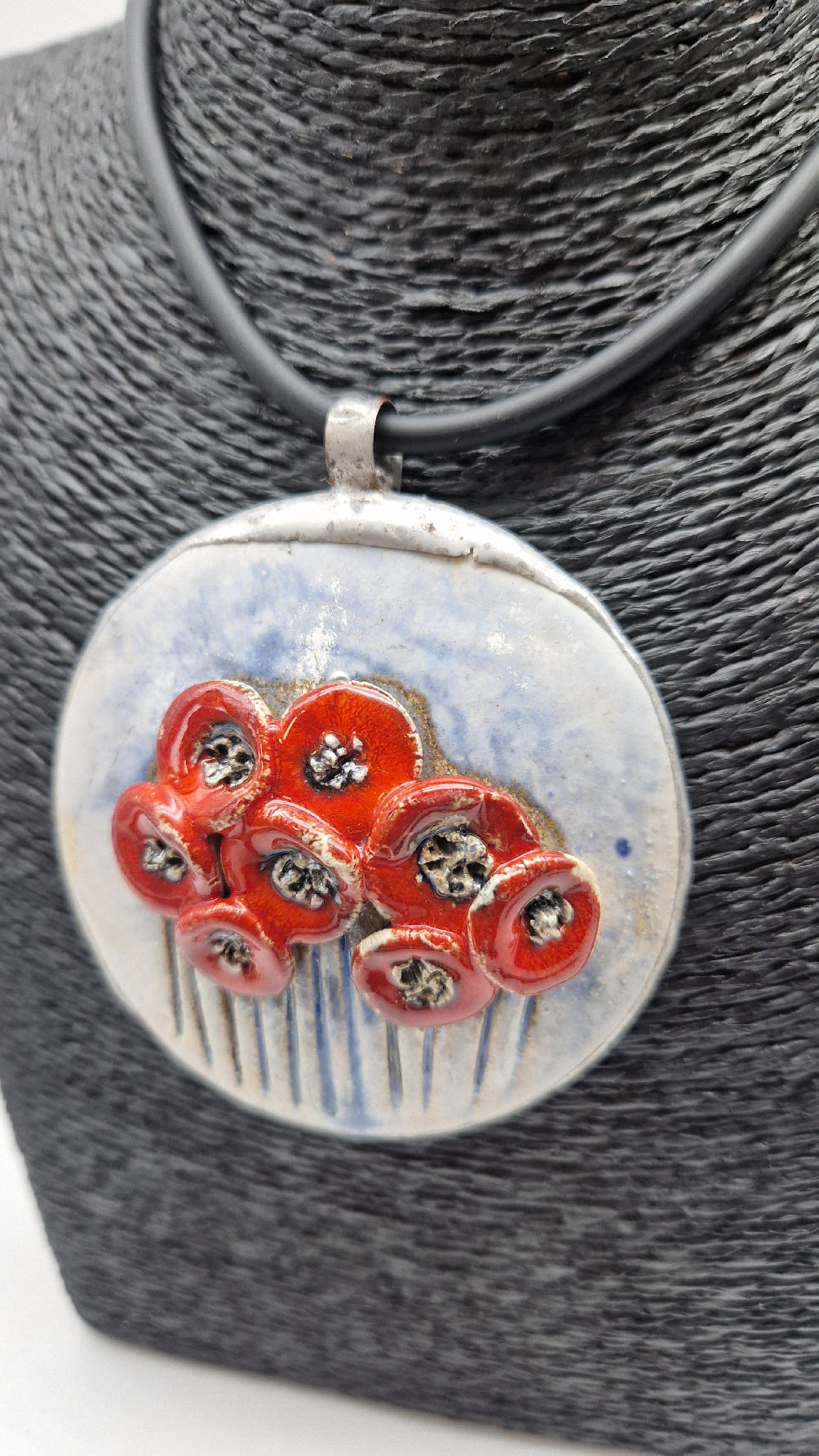 Śliczny ceramiczny, duży wisior zawieszony na kauczukowym rzemieniu.  Kwiaty, ale takie niewiędnące i śliczne ,które będą cieszyć oczy niezmiennie przez długi czas..