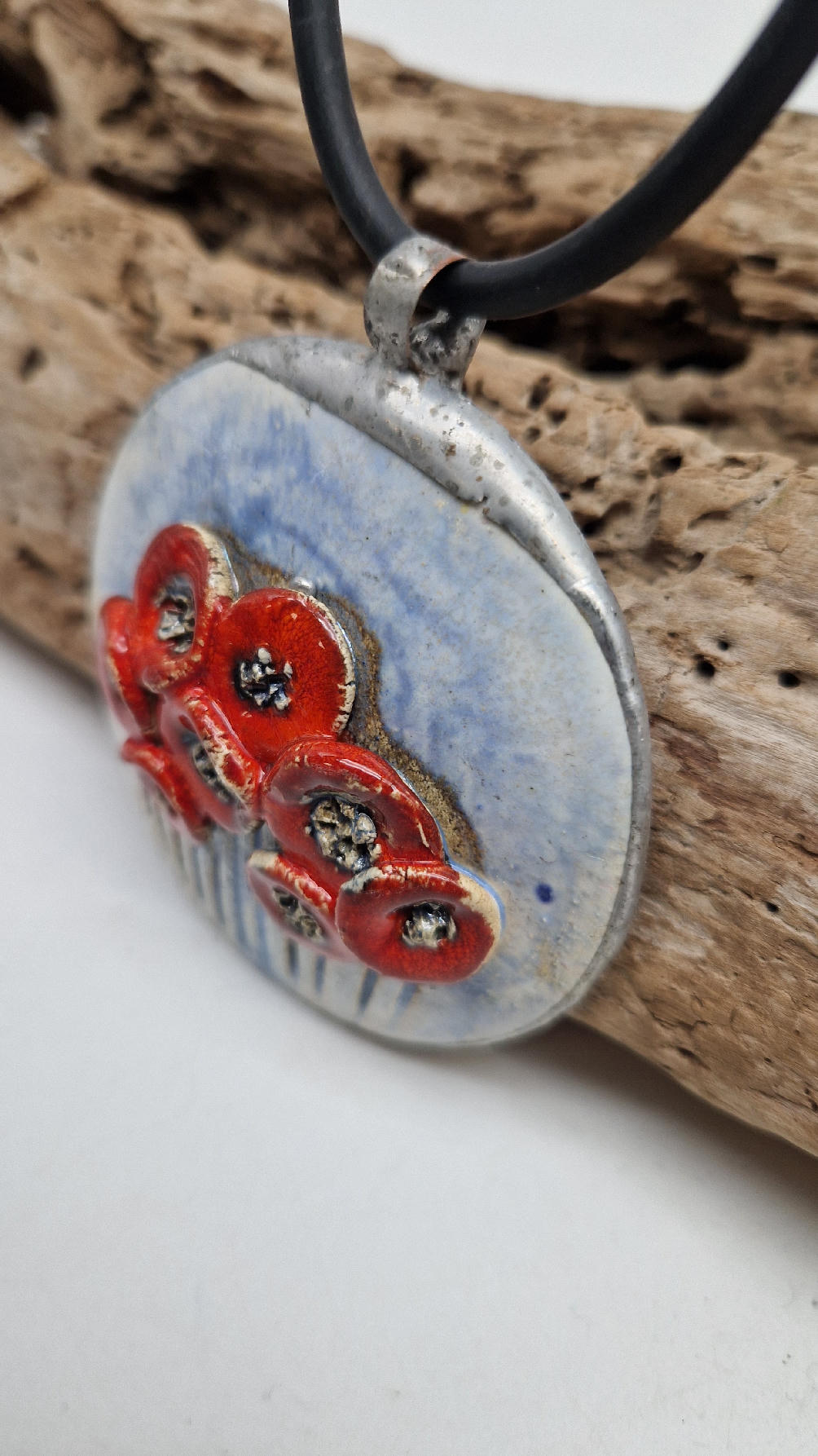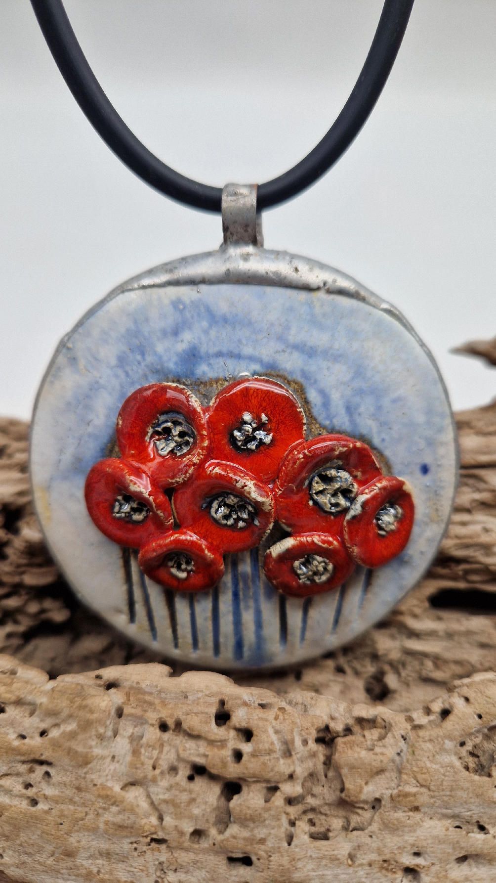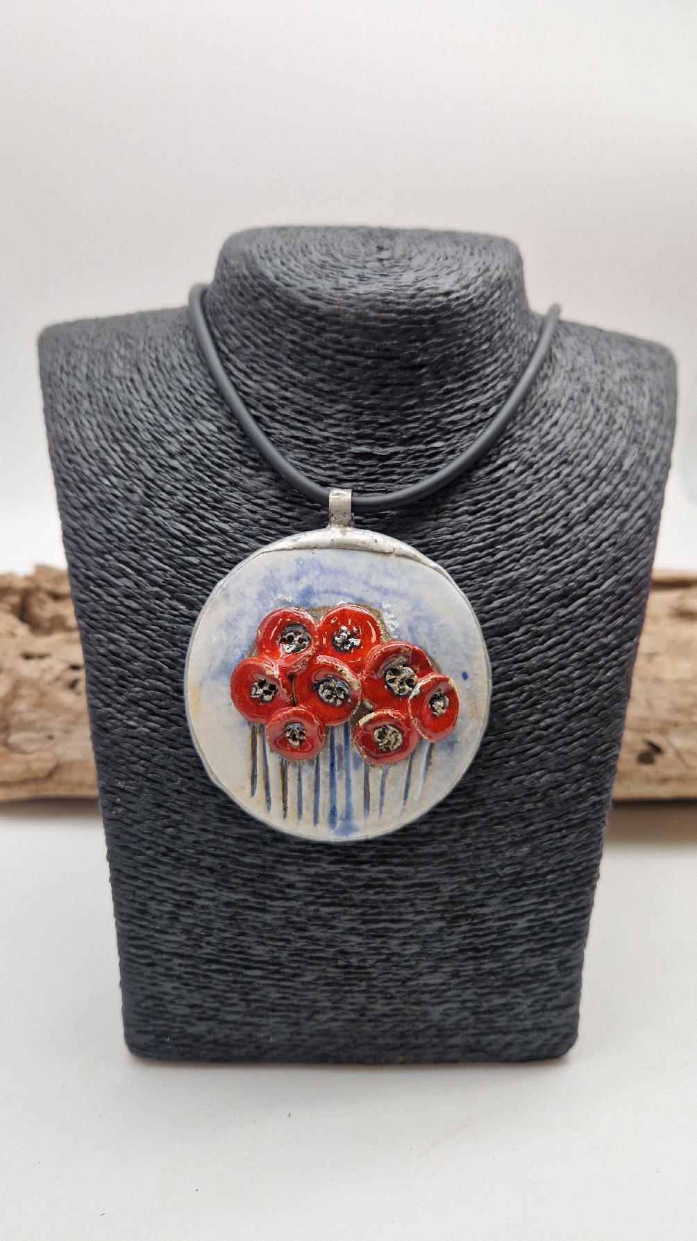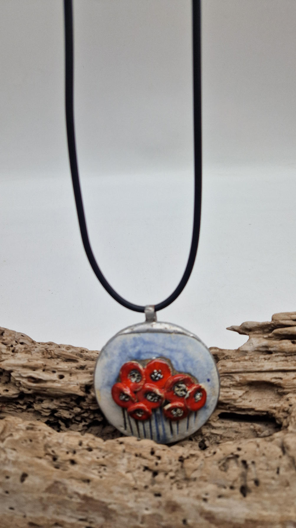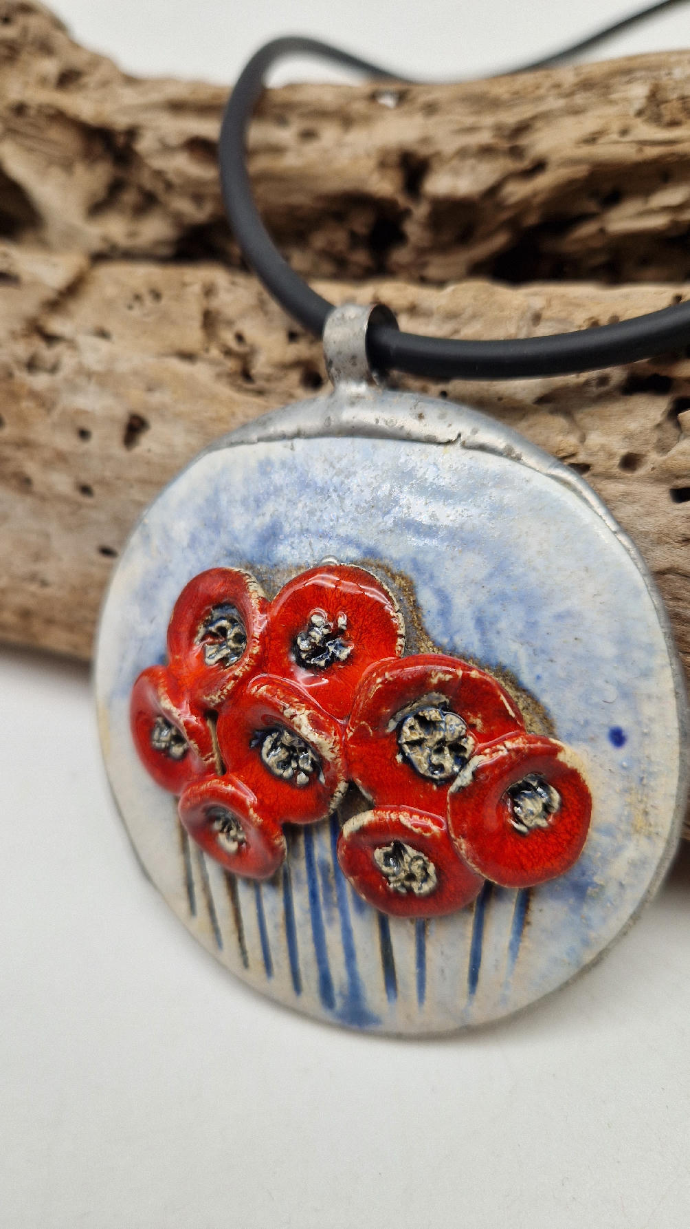 Śliczny ceramiczny, duży wisior zawieszony na kauczukowym rzemieniu.  Kwiaty, ale takie niewiędnące i śliczne ,które będą cieszyć oczy niezmiennie przez długi czas..